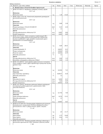 Kosztorys nakadczy Roboty remontowe Nr Podstawa, opis robót, nakłady Jm Norma 5. Remont ścian w Pracowni Środków SpoŜywczych 1 KNR 4-01 0819/15 Rozebranie wykładziny ściennej z płytek 29,73 m2 Robocizna Robocizna razem r-g 1,38 2 KNR 2-02u2 1134.1/02 Gruntowanie preparatami gruntującymi powierzchni pionowych 29,73 m2 Robocizna Robocizna razem r-g 0,08 Materiały Preparat gruntujący ATLAS UNI GRUNT dm3 0,22 Materiały pomocnicze % 1,5 Sprzęt Wyciąg jednomasztowy elektryczny 0,5t m-g 0,002 Środek transportowy m-g 0,003 3 KNR 4-01 0716/02 Tynki wewnętrzne zwykłe kategorii III o powierzchni podłogi pomieszczenia ponad 5m2 wykonywane ręcznie na podłoŜach z cegły, pustaków ceramicznych, gazo-i pianobetonów na ścianach płaskich 29,73 m2 Robocizna Robocizna razem r-g 0,69 Materiały Cement portlandzki 35 t 0,0052 Wapno suchogaszone t 0,0066 Piasek do zapraw m3 0,0266 Materiały pomocnicze % 1,5 Sprzęt Wyciąg jednomasztowy elektryczny 0,5t m-g 0,04 Betoniarka wolnospadowa elektryczna 250dm3 m-g 0,04 4 KNR 2-02 2009/02 Tynki (gładzie) jednowarstwowe wewnętrzne ścian o podłoŜu z tynku z gipsu szpachlowego wykonywane ręcznie grubości 3mm 29,73 m2 Robocizna Robocizna razem r-g 0,2426 Materiały Gips budowlany szpachlowy t 0,00327 Materiały pomocnicze % 1,5 Sprzęt Mieszarka do zapraw m-g 0,004 Wyciąg jednomasztowy elektryczny 0,5t m-g 0,02 Środek transportowy m-g 0,0032 5 KNR 2-02 1505/03 Dwukrotne malowanie farbami emulsyjnymi wewnętrznych podłoŜy gipsowych z gruntowaniem- farba zmywalna lateksowa 45,31 m2 Robocizna Robocizna razem r-g 0,1756 Materiały Farba emulsyjna lateksowa dm3 0,276 Materiały pomocnicze % 1,5 Sprzęt Środek transportowy m-g 0,0003 6 KNR-W 4-01 0821/04 Wymiana płytek okładzinowych ściennych kamionkowych i ceramicznych 20x20cm układanych na klej o powierzchni do 1,0m2 w jednym miejscu- płytki z odzysku 7,3 m2 Robocizna Robocizna razem r-g 2,9 Materiały Masa klejąca kg 4,75 Masa fugowa kg 0,44 Materiały pomocnicze % 2 7 KNR 4-02 0515/02 Wymiana grzejnika Ŝeliwnego członowego o powierzchni ogrzewania do 5,0m2- demontaŜ i ponowny montaŜ 1 kpl Strona 1/2 Ilość 41,03 2,38 6,54 0,06 0,09 20,51 0,15 0,20 0,79 1,19 1,19 7,21 0,10 0,12 0,59 0,10 7,96 12,51 0,01 21,17 34,68 3,21 Cena Robocizna Materiały Sprzęt Kosztorys nakadczy Roboty remontowe Nr Podstawa, opis robót, nakłady Jm Norma Robocizna Robocizna razem r-g 2,48 Materiały pomocnicze % 5 RAZEM: Remont ścian w Pracowni Środków SpoŜywczych Razem k.b. Koszty zakupu Koszty pośrednie Zysk Razem Razem element OGÓŁEM Razem k.b. Koszty zakupu Koszty pośrednie Zysk Łącznie Podatek VAT Ogółem kosztorys Strona 2/2 Ilość 2,48 Cena Robocizna Materiały Sprzęt