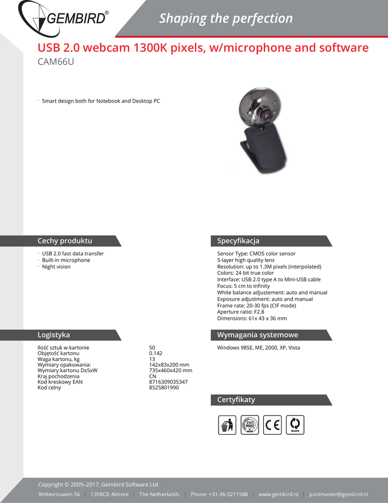 USB 2.0 webcam 1300K pixels, w/microphone and software CAM66U - Smart design both for Notebook and Desktop PC Cechy produktu Specyfikacja - USB 2.0 fast data transfer - Built-in microphone - Night vision Sensor Type: CMOS color sensor 5-layer high quality lens Resolution: up to 1.3M pixels (interpolated) Colors: 24 bit true color Interface: USB 2.0 type A to Mini-USB cable Focus: 5 cm to infinity White balance adjustement: auto and manual Exposure adjustment: auto and manual Frame rate: 20-30 fps (CIF mode) Aperture ratio: F2.8 Dimensions: 61x 43 x 36 mm Logistyka Wymagania systemowe Ilość sztuk w kartonie Objętość kartonu Waga kartonu, kg Wymiary opakowania: Wymiary kartonu DxSxW Kraj pochodzenia Kod kreskowy EAN Kod celny 50 0.142 13 142x83x200 mm 735x460x420 mm CN 8716309035347 8525801990 Windows 98SE, ME, 2000, XP, Vista Certyfikaty Copyright © 2009–2017, Gembird Software Ltd. ! " # $ ! "