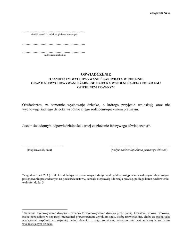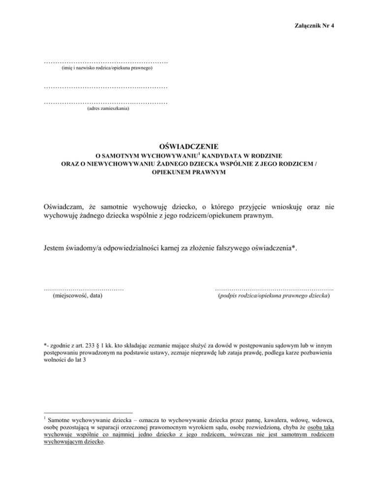 Załącznik Nr 4 ………………………………………………. (imię i nazwisko rodzica/opiekuna prawnego) …………………………………….………… ………………………………….…………… (adres zamieszkania) OŚWIADCZENIE O SAMOTNYM WYCHOWYWANIU1 KANDYDATA W RODZINIE ORAZ O NIEWYCHOWYWANIU ŻADNEGO DZIECKA WSPÓLNIE Z JEGO RODZICEM / OPIEKUNEM PRAWNYM Oświadczam, że samotnie wychowuję dziecko, o którego przyjęcie wnioskuję oraz nie wychowuję żadnego dziecka wspólnie z jego rodzicem/opiekunem prawnym. Jestem świadomy/a odpowiedzialności karnej za złożenie fałszywego oświadczenia*. ………………………………… (miejscowość, data) …………………………………………………. (podpis rodzica/opiekuna prawnego dziecka) *- zgodnie z art. 233 § 1 kk. kto składając zeznanie mające służyć za dowód w postępowaniu sądowym lub w innym postępowaniu prowadzonym na podstawie ustawy, zeznaje nieprawdę lub zataja prawdę, podlega karze pozbawienia wolności do lat 3 1 Samotne wychowywanie dziecka – oznacza to wychowywanie dziecka przez pannę, kawalera, wdowę, wdowca, osobę pozostającą w separacji orzeczonej prawomocnym wyrokiem sądu, osobę rozwiedzioną, chyba że osoba taka wychowuje wspólnie co najmniej jedno dziecko z jego rodzicem, wówczas nie jest samotnym rodzicem wychowującym dziecko.