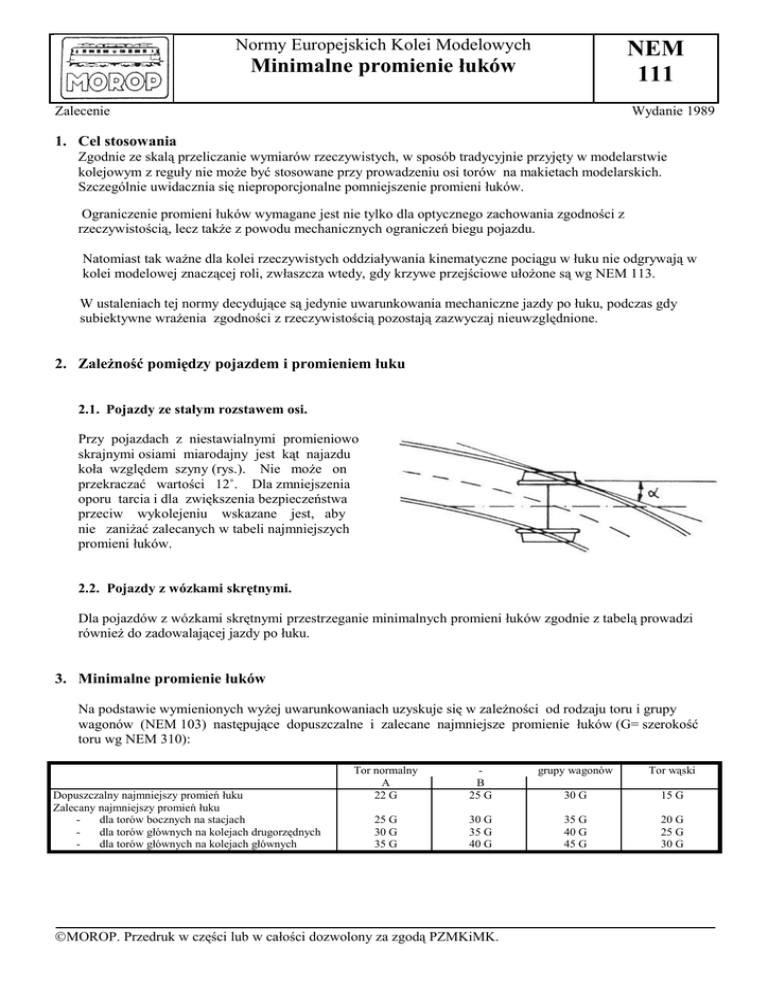 Normy Europejskich Kolei Modelowych NEM 111 Minimalne promienie łuków Zalecenie Wydanie 1989 1. Cel stosowania Zgodnie ze skalą przeliczanie wymiarów rzeczywistych, w sposób tradycyjnie przyjęty w modelarstwie kolejowym z reguły nie może być stosowane przy prowadzeniu osi torów na makietach modelarskich. Szczególnie uwidacznia się nieproporcjonalne pomniejszenie promieni łuków. Ograniczenie promieni łuków wymagane jest nie tylko dla optycznego zachowania zgodności z rzeczywistością, lecz także z powodu mechanicznych ograniczeń biegu pojazdu. Natomiast tak ważne dla kolei rzeczywistych oddziaływania kinematyczne pociągu w łuku nie odgrywają w kolei modelowej znaczącej roli, zwłaszcza wtedy, gdy krzywe przejściowe ułożone są wg NEM 113. W ustaleniach tej normy decydujące są jedynie uwarunkowania mechaniczne jazdy po łuku, podczas gdy subiektywne wrażenia zgodności z rzeczywistością pozostają zazwyczaj nieuwzględnione. 2. Zależność pomiędzy pojazdem i promieniem łuku 2.1. Pojazdy ze stałym rozstawem osi. Przy pojazdach z niestawialnymi promieniowo skrajnymi osiami miarodajny jest kąt najazdu koła względem szyny (rys.). Nie może on przekraczać wartości 12˚. Dla zmniejszenia oporu tarcia i dla zwiększenia bezpieczeństwa przeciw wykolejeniu wskazane jest, aby nie zaniżać zalecanych w tabeli najmniejszych promieni łuków. 2.2. Pojazdy z wózkami skrętnymi. Dla pojazdów z wózkami skrętnymi przestrzeganie minimalnych promieni łuków zgodnie z tabelą prowadzi również do zadowalającej jazdy po łuku. 3. Minimalne promienie łuków Na podstawie wymienionych wyżej uwarunkowaniach uzyskuje się w zależności od rodzaju toru i grupy wagonów (NEM 103) następujące dopuszczalne i zalecane najmniejsze promienie łuków (G= szerokość toru wg NEM 310): Dopuszczalny najmniejszy promień łuku Zalecany najmniejszy promień łuku dla torów bocznych na stacjach dla torów głównych na kolejach drugorzędnych dla torów głównych na kolejach głównych Tor normalny A 22 G B 25 G grupy wagonów Tor wąski 30 G 15 G 25 G 30 G 35 G 30 G 35 G 40 G 35 G 40 G 45 G 20 G 25 G 30 G MOROP. Przedruk w części lub w całości dozwolony za zgodą PZMKiMK.