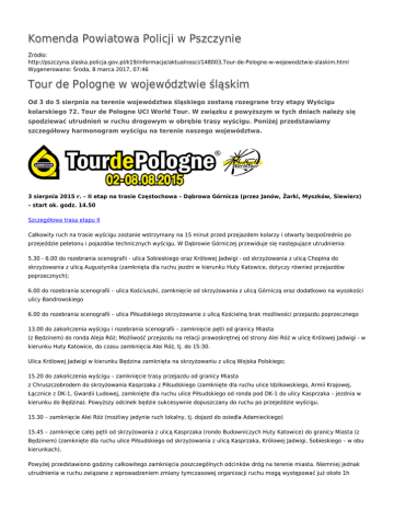 Komenda Powiatowa Policji w Pszczynie Źródło: http://pszczyna.slaska.policja.gov.pl/k19/informacje/aktualnosci/148003,Tour-de-Pologne-w-wojewodztwie-slaskim.html Wygenerowano: Środa, 8 marca 2017, 07:46 Tour de Pologne w województwie śląskim Od 3 do 5 sierpnia na terenie województwa śląskiego zostaną rozegrane trzy etapy Wyścigu kolarskiego 72. Tour de Pologne UCI World Tour. W związku z powyższym w tych dniach należy się spodziewać utrudnień w ruchu drogowym w obrębie trasy wyścigu. Poniżej przedstawiamy szczegółowy harmonogram wyścigu na terenie naszego województwa. 3 sierpnia 2015 r. – II etap na trasie Częstochowa – Dąbrowa Górnicza (przez Janów, Żarki, Myszków, Siewierz) – start ok. godz. 14.50 Szczegółowa trasa etapu II Całkowity ruch na trasie wyścigu zostanie wstrzymany na 15 minut przed przejazdem kolarzy i otwarty bezpośrednio po przejeździe peletonu i pojazdów technicznych wyścigu. W Dąbrowie Górniczej przewiduje się następujące utrudnienia: 5.30 - 6.00 do rozebrania scenografii - ulica Sobieskiego oraz Królowej Jadwigi - od skrzyżowania z ulicą Chopina do skrzyżowania z ulicą Augustynika (zamknięta dla ruchu jezdni w kierunku Huty Katowice, dotyczy również przejazdów poprzecznych); 6.00 do rozebrania scenografii – ulica Kościuszki, zamknięcie od skrzyżowania z ulicą Górniczą oraz dodatkowo na wysokości ulicy Bandrowskiego 6.00 do rozebrania scenografii – ulica Piłsudskiego skrzyżowanie z ulicą Kościelną brak możliwości przejazdu poprzecznego 13.00 do zakończenia wyścigu i rozebrania scenografii – zamknięcie pętli od granicy Miasta (z Będzinem) do ronda Aleja Róż; Możliwość przejazdu na relacji prawoskrętnej od strony Alei Róż w ulicę Królowej Jadwigi - w kierunku Huty Katowice, do czasu zamknięcia Alei Róż, tj. do 15:30. Ulica Królowej Jadwigi w kierunku Będzina zamknięta na skrzyżowaniu z ulicą Wojska Polskiego; 15.20 do zakończenia wyścigu – zamknięcie trasy przejazdu od granicy Miasta z Chruszczobrodem do skrzyżowania Kasprzaka z Piłsudskiego (zamknięte dla ruchu ulice Idzikowskiego, Armii Krajowej, Łącznice z DK-1, Gwardii Ludowej, zamknięte dla ruchu ulice Piłsudskiego od ronda pod DK-1 do ulicy Kasprzaka – jezdnia w kierunku do Będzina). Powyższy odcinek będzie sukcesywnie dopuszczany do ruchu po przejeździe wyścigu. 15.30 – zamknięcie Alei Róż (możliwy jedynie ruch lokalny, tj. dojazd do osiedla Adamieckiego) 15.45 – zamknięcie całej pętli od skrzyżowania z ulicą Kasprzaka (rondo Budowniczych Huty Katowice) do granicy Miasta (z Będzinem) (zamknięte dla ruchu ulice Piłsudskiego od skrzyżowania z ulicą Kasprzaka, Królowej Jadwigi, Sobieskiego – w obu kierunkach). Powyżej przedstawiono godziny całkowitego zamknięcia poszczególnych odcinków dróg na terenie miasta. Niemniej jednak utrudnienia w ruchu związane z wprowadzeniem zmiany tymczasowej organizacji ruchu mogą występować już około 1h przed wskazanymi godzinami. 4 sierpnia 2015 r. – III etap na trasie Zawiercie – Katowice (przez Siewierz, Miasteczko Śl., Tarnowskie Góry, Piekary Śl., Siemianowice Śl., Chorzów) szczegółowa trasa etapu III Ruch na trasie wyścigu zostanie wstrzymany na 15 minut przed przejazdem kolarzy i otwarty bezpośrednio po zamknięciu peletonu. Natomiast na terenie miasta Katowice ruch będzie wstrzymywany sukcesywnie od godz. 13.00 i zostanie otwarty po zakończeniu wyścigu tj. około godz. 19.00 . Należy jednak zaznaczyć, że w związku z budową sceny i ustawieniem stałego zabezpieczenia technicznego odcinek al. Korfantego od „Pętli Słonecznej” do ul. Moniuszki będzie wyłączony z ruchu pojazdów zdecydowanie wcześniej - od godzin porannych 4 sierpnia 2015 r. Na czas wstrzymania ruchu na terenie Katowic wyjazd z miasta będzie możliwy w następujących miejscach: od ul. Francuskiej na al. Górnośląską (A4) w każdym kierunku; od strony pl. Miarki i pl. Andrzeja wyjazd ulicą Kościuszki, Szeligiewicza, Wita Stwosza na al. Górnośląską (A4) w kierunku Krakowa; od strony ul. Bankowej i ul. Moniuszki wyjazd będzie możliwy ul. Szkolną, która na czas wyścigu będzie dwukierunkowa lub ulicą Bankową (otwarty dla ruchu deptak przy UŚ) do ul. Warszawskiej, następnie na Damrota, Francuską do wyjazdu na autostradę A4 w dwóch kierunkach z os. Roździeńskiego („Gwiazdy”) będzie możliwy przejazd ul. Dudy-Gracza tylko w kierunku Sosnowca na DK79 i DK 86 lub w kierunku Mysłowic. od strony os. Paderewskiego wyjazd będzie możliwy ul. Krasińskiego w kierunku Damrota i dalej na Francuską do al. Górnośląskiej, na skrzyżowaniu Graniczna / Krasińskiego zostanie utworzona „śluza”, czyli ruch będzie przepuszczany pomiędzy poszczególnymi rundami, jednak możliwości otwarcia będą uzależnione od sytuacji na trasie wyścigu (poszczególnych rund). „Tunel pod Rondem” na al. Roździeńskiego będzie całkowicie przejezdny; z i do Galerii Katowickiej dojazd będzie możliwy od ul., Goeppert-Mayer, Grundmana, Sądowej na skrzyżowaniu z ul. Mikołowską i Sienkiewicza także zostanie utworzona „śluza” (możliwość przejazdu ograniczona w zależności od sytuacji na trasie wyścigu); z ul. Kormoranów na Gawronów przejazd będzie możliwy ul. Gawronów („śluzą) z os. im. Zgrzebnioka wyjazd będzie możliwy ul. Kawek przez parking sklepu „Piotr i Paweł”, następnie lewą stroną ul. Gawronów do Kościuszki w kierunku Mikołowa. Informacji o wszelkich utrudnieniach udzielają poszczególne Komendy Miejskie / Powiatowe Policji na trasie wyścigu. Ponadto w KWP w Katowicach w dniach rozgrywania dwóch etapów tj. 3 i 4 sierpnia, w godzinach 8.00 – 20.00 zostanie uruchomiona infolinia, gdzie zainteresowani będą mogli uzyskać informacje o sytuacji drogowej związanej z wyścigiem pod następującymi numerami telefonów: 32 200 1988, 32 200 1693, 32 200 1684. Dodatkowo w dniu 3 sierpnia, 