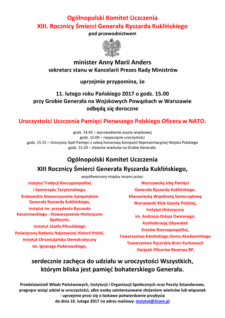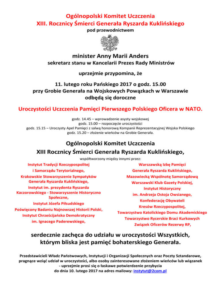 Ogólnopolski Komitet Uczczenia XIII. Rocznicy Śmierci Generała Ryszarda Kuklińskiego pod przewodnictwem minister Anny Marii Anders sekretarz stanu w Kancelarii Prezes Rady Ministrów uprzejmie przypomina, że 11. lutego roku Pańskiego 2017 o godz. 15.00 przy Grobie Generała na Wojskowych Powązkach w Warszawie odbędą się doroczne Uroczystości Uczczenia Pamięci Pierwszego Polskiego Oficera w NATO. godz. 14.45 – wprowadzenie asysty wojskowej godz. 15.00 – rozpoczęcie uroczystości godz. 15.15 – Uroczysty Apel Pamięci z salwą honorową Kompanii Reprezentacyjnej Wojska Polskiego godz. 15.20 – złożenie wieńców na Grobie Generała. Ogólnopolski Komitet Uczczenia XIII Rocznicy Śmierci Generała Ryszarda Kuklińskiego, współtworzony między innymi przez: Instytut Tradycji Rzeczypospolitej i Samorządu Terytorialnego, Krakowskie Stowarzyszenie Sympatyków Generała Ryszarda Kuklińskiego, Instytut im. prezydenta Ryszarda Kaczorowskiego - Stowarzyszenie Historyczno Społeczne, Instytut Józefa Piłsudskiego Poświęcony Badaniu Najnowszej Historii Polski, Instytut Chrześcijańsko Demokratyczny im. Ignacego Paderewskiego, Warszawską Izbę Pamięci Generała Ryszarda Kuklińskiego, Mazowiecką Wspólnotę Samorządową Warszawski Klub Gazety Polskiej, Instytut Historyczny im. Andrzeja Ostoja Owsianego, Konfederację Obywateli Kresów Rzeczypospolitej, Towarzystwo Katolickiego Domu Akademickiego Towarzystwo Rycerskie Braci Kurkowych Związek Oficerów Rezerwy RP, serdecznie zachęca do udziału w uroczystości Wszystkich, którym bliska jest pamięć bohaterskiego Generała. Przedstawicieli Władz Państwowych, Instytucji i Organizacji Społecznych oraz Poczty Sztandarowe, pragnące wziąć udział w uroczystości, albo osoby zainteresowane złożeniem wieńców lub wiązanek - uprzejmie prosi się o łaskawe potwierdzenie przybycia do dnia 10. lutego 2017 na adres mailowy: [email protected]