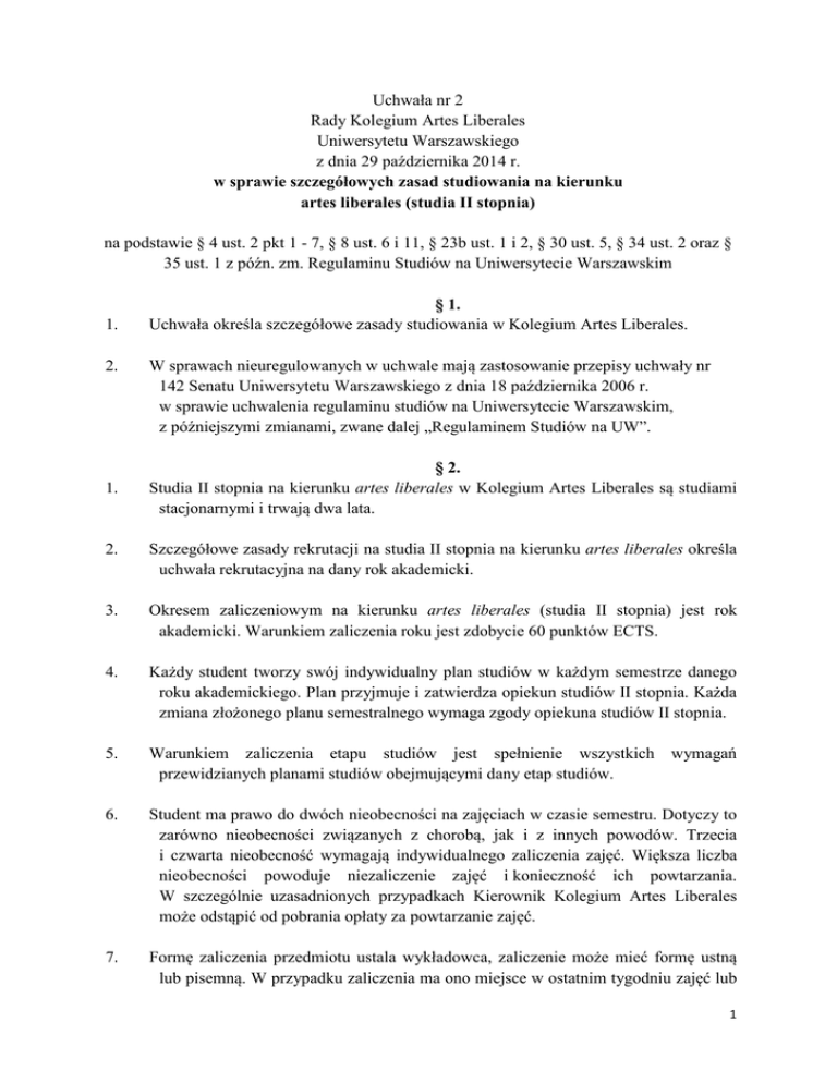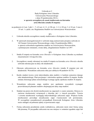 Uchwała nr 2 Rady Kolegium Artes Liberales Uniwersytetu Warszawskiego z dnia 29 października 2014 r. w sprawie szczegółowych zasad studiowania na kierunku artes liberales (studia II stopnia) na podstawie § 4 ust. 2 pkt 1 - 7, § 8 ust. 6 i 11, § 23b ust. 1 i 2, § 30 ust. 5, § 34 ust. 2 oraz § 35 ust. 1 z późn. zm. Regulaminu Studiów na Uniwersytecie Warszawskim 1. 2. 1. § 1. Uchwała określa szczegółowe zasady studiowania w Kolegium Artes Liberales. W sprawach nieuregulowanych w uchwale mają zastosowanie przepisy uchwały nr 142 Senatu Uniwersytetu Warszawskiego z dnia 18 października 2006 r. w sprawie uchwalenia regulaminu studiów na Uniwersytecie Warszawskim, z późniejszymi zmianami, zwane dalej „Regulaminem Studiów na UW”. § 2. Studia II stopnia na kierunku artes liberales w Kolegium Artes Liberales są studiami stacjonarnymi i trwają dwa lata. 2. Szczegółowe zasady rekrutacji na studia II stopnia na kierunku artes liberales określa uchwała rekrutacyjna na dany rok akademicki. 3. Okresem zaliczeniowym na kierunku artes liberales (studia II stopnia) jest rok akademicki. Warunkiem zaliczenia roku jest zdobycie 60 punktów ECTS. 4. Każdy student tworzy swój indywidualny plan studiów w każdym semestrze danego roku akademickiego. Plan przyjmuje i zatwierdza opiekun studiów II stopnia. Każda zmiana złożonego planu semestralnego wymaga zgody opiekuna studiów II stopnia. 5. Warunkiem zaliczenia etapu studiów jest spełnienie wszystkich przewidzianych planami studiów obejmującymi dany etap studiów. 6. Student ma prawo do dwóch nieobecności na zajęciach w czasie semestru. Dotyczy to zarówno nieobecności związanych z chorobą, jak i z innych powodów. Trzecia i czwarta nieobecność wymagają indywidualnego zaliczenia zajęć. Większa liczba nieobecności powoduje niezaliczenie zajęć i konieczność ich powtarzania. W szczególnie uzasadnionych przypadkach Kierownik Kolegium Artes Liberales może odstąpić od pobrania opłaty za powtarzanie zajęć. 7. Formę zaliczenia przedmiotu ustala wykładowca, zaliczenie może mieć formę ustną lub pisemną. W przypadku zaliczenia ma ono miejsce w ostatnim tygodniu zajęć lub wymagań 1 w czasie sesji egzaminacyjnej. W przypadku egzaminu wykładowca może ustalić termin zerowy egzaminu, który musi się odbyć nie później niż w ostatnim tygodniu zajęć. Student, który z egzaminu zerowego otrzymał ocenę niedostateczną, przystępuje do egzaminu bez konsekwencji w zwykłym terminie. 8. Student, który w sesji egzaminacyjnej otrzymał ocenę pozytywną, ma prawo do poprawy oceny w sesji poprawkowej. Jeśli w sesji poprawkowej otrzyma ocenę lepszą od oceny otrzymanej w sesji właściwej, tylko ta druga ocena brana jest pod uwagę przy zaliczeniu roku. 9. W Kolegium Artes Liberales ustala się limit zajęć ponadplanowych niewymaganych do zaliczenia studiów, za które nie pobiera się opłat, na 30 punktów ECTS. 1. 2. 1. 2. 1. 2. § 3. Student Kolegium Artes Liberales zobowiązany jest do złożenia w sekretariacie Kolegium dwóch planów semestralnych. Suma zaliczeń i egzaminów przewidzianych w obu planach musi spełniać następujące warunki: 1) wypełniać kryteria wynikające z programu studiów; 2) uwzględniać zajęcia o sumarycznej wartości co najmniej 60 ECTS. Plany semestralne składa się najpóźniej do 31 października (semestr zimowy) i 15 marca (semestr letni). Niezłożenie planu semestralnego w terminie może być podstawą do niezaliczenia danego etapu studiów. § 4. Warunkiem zaliczenia przedmiotu jest uprzednie zapisanie się na zajęcia z tego przedmiotu zgodnie z planem studiów i zasadami zapisów. Zgodnie z Regulaminem Studiów na UW Student może skorzystać z prawa do rezygnacji z zaliczenia przedmiotu, złożonej przed rozpoczęciem sesji egzaminacyjnej. § 5. Student, który nie spełnił wszystkich wymagań przewidzianych planem studiów danego etapu studiów, może ubiegać się o przyznanie warunkowego zaliczenia i wpis na kolejny etap studiów jedynie przy braku zaliczenia z jednego przedmiotu (zaliczenie z oceną, egzamin). Powtarzanie zajęć oznacza konieczność wniesienia odpowiedniej opłaty. Opłatę trzeba wnieść nie później niż 7 dni po uzyskaniu zgody Kierownika Kolegium Artes Liberales na wpis warunkowy. Potwierdzenie opłaty należy złożyć w Sekretariacie Kolegium Artes Liberales. Wniosek o warunkowe zaliczenie i wpis na kolejny etap studiów wraz z uzasadnieniem składa się nie później niż 7 dni po zakończeniu egzaminacyjnej sesji poprawkowej semestru letniego. 2 3. Decyzję o przyznaniu warunkowego zaliczenia i wpisaniu na kolejny etap studiów podejmuje Kierownik Kolegium Artes Liberales. 4. Studenta można na jego wniosek skierować na powtarzanie etapu studiów. Wniosek o skierowanie na powtarzanie etapu studiów wraz z uzasadnieniem składa się nie później niż 7 dni po zakończeniu egzaminacyjnej sesji poprawkowej semestru letniego. 5. Decyzję o skierowaniu na powtarzanie etapu studiów podejmuje Kierownik Kolegium Artes Liberales biorąc pod uwagę w szczególności braki w realizacji programu. Powtarzanie roku oznacza konieczność wniesienia odpowiedniej opłaty za powtarzanie roku. Opłatę trzeba wnieść nie później niż 7 dni po uzyskaniu zgody Kierownika Kolegium Artes Liberales na powtarzanie roku. Potwierdzenie opłaty należy złożyć w Sekretariacie Kolegium Artes Liberales. 1. § 6. Osoba skreślona z listy studentów może ubiegać się o wznowienie studiów na etap studiów następujący po ostatnim etapie studiów zaliczonym przez studenta przed skreśleniem. 2. Podjęcie studiów w trybie wznowienia może nastąpić nie wcześniej niż od następnego roku akademickiego po dacie skreślenia. 3. Wznowienie następuje na te same studia, z których student został uprzednio skreślony. 4. Wniosek o wznowienie studiów wraz z uzasadnieniem składa się nie później niż 7 dni po rozpoczęciu egzaminacyjn