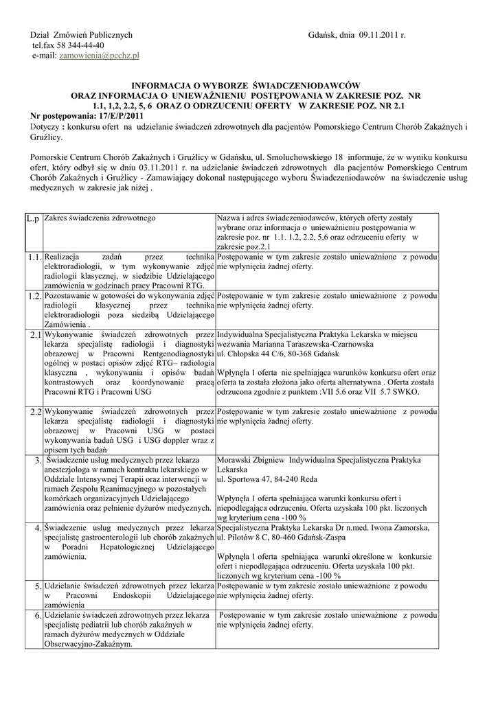 Dział Zmówień Publicznych tel.fax 58 344-44-40 e-mail: [email protected] Gdańsk, dnia 09.11.2011 r. INFORMACJA O WYBORZE ŚWIADCZENIODAWCÓW ORAZ INFORMACJA O UNIEWAŻNIENIU POSTĘPOWANIA W ZAKRESIE POZ. NR 1.1, 1,2, 2.2, 5, 6 ORAZ O ODRZUCENIU OFERTY W ZAKRESIE POZ. NR 2.1 Nr postępowania: 17/E/P/2011 Dotyczy : konkursu ofert na udzielanie świadczeń zdrowotnych dla pacjentów Pomorskiego Centrum Chorób Zakaźnych i Gruźlicy. Pomorskie Centrum Chorób Zakaźnych i Gruźlicy w Gdańsku, ul. Smoluchowskiego 18 informuje, że w wyniku konkursu ofert, który odbył się w dniu 03.11.2011 r. na udzielanie świadczeń zdrowotnych dla pacjentów Pomorskiego Centrum Chorób Zakaźnych i Gruźlicy - Zamawiający dokonał następującego wyboru Świadczeniodawców na świadczenie usług medycznych w zakresie jak niżej . L.p Zakres świadczenia zdrowotnego Nazwa i adres świadczeniodawców, których oferty zostały wybrane oraz informacja o unieważnieniu postępowania w zakresie poz. nr 1.1. 1.2, 2.2, 5,6 oraz odrzuceniu oferty w zakresie poz.2.1 zadań przez technika Postępowanie w tym zakresie zostało unieważnione z powodu 1.1. Realizacja elektroradiologii, w tym wykonywanie zdjęć nie wpłynięcia żadnej oferty. radiologii klasycznej, w siedzibie Udzielającego zamówienia w godzinach pracy Pracowni RTG. 1.2. Pozostawanie w gotowości do wykonywania zdjęć Postępowanie w tym zakresie zostało unieważnione z powodu radiologii klasycznej przez technika nie wpłynięcia żadnej oferty. elektroradiologii poza siedzibą Udzielającego Zamówienia . 2.1 Wykonywanie świadczeń zdrowotnych przez Indywidualna Specjalistyczna Praktyka Lekarska w miejscu lekarza specjalistę radiologii i diagnostyki wezwania Marianna Taraszewska-Czarnowska obrazowej w Pracowni Rentgenodiagnostyki ul. Chłopska 44 C/6, 80-368 Gdańsk ogólnej w postaci opisów zdjęć RTG– radiologia klasyczna , wykonywania i opisów badań Wpłynęła 1 oferta nie spełniająca warunków konkursu ofert oraz kontrastowych oraz koordynowanie pracą oferta ta została złożona jako oferta alternatywna . Oferta została Pracowni RTG i Pracowni USG odrzucona zgodnie z punktem :VII 5.6 oraz VII 5.7 SWKO. 2.2 Wykonywanie świadczeń zdrowotnych przez Postępowanie w tym zakresie zostało unieważnione z powodu lekarza specjalistę radiologii i diagnostyki obrazowej w Pracowni USG w postaci wykonywania badań USG i USG doppler wraz z opisem tych badań 3. Świadczenie usług medycznych przez lekarza anestezjologa w ramach kontraktu lekarskiego w Oddziale Intensywnej Terapii oraz interwencji w ramach Zespołu Reanimacyjnego w pozostałych komórkach organizacyjnych Udzielającego zamówienia oraz pełnienie dyżurów medycznych. nie wpłynięcia żadnej oferty. Morawski Zbigniew Indywidualna Specjalistyczna Praktyka Lekarska ul. Sportowa 47, 84-240 Reda Wpłynęła 1 oferta spełniająca warunki konkursu ofert i niepodlegająca odrzuceniu. Oferta uzyskała 100 pkt. liczonych wg kryterium cena -100 % Świadczenie usług medycznych przez lekarza Specjalistyczna Praktyka Lekarska Dr n.med. Iwona Zamorska, 4. specjalistę gastroenterologii lub chorób zakaźnych ul. Pilotów 8 C, 80-460 Gdańsk-Zaspa w Poradni Hepatologicznej Udzielającego zamówienia. Wpłynęła 1 oferta spełniająca warunki określone w konkursie ofert i niepodlegająca odrzuceniu. Oferta uzyskała 100 pkt. liczonych wg kryterium cena -100 % 5. Udzielanie świadczeń zdrowotnych przez lekarza Postępowanie w tym zakresie zostało unieważnione z powodu w Pracowni Endoskopii Udzielającego nie wpłynięcia żadnej oferty. zamówienia 6. Udzielanie świadczeń zdrowotnych przez lekarza Postępowanie w tym zakresie zostało unieważnione z powodu specjalistę pediatrii lub chorób zakaźnych w nie wpłynięcia żadnej oferty. ramach dyżurów medycznych w Oddziale Obserwacyjno-Zakaźnym.