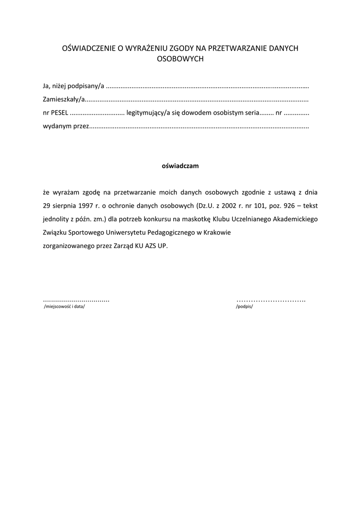 OŚWIADCZENIE O WYRAŻENIU ZGODY NA PRZETWARZANIE DANYCH OSOBOWYCH Ja, niżej podpisany/a ...........................................................................................................…. Zamieszkały/a.......................................................................................................................... nr PESEL .............................. legitymujący/a się dowodem osobistym seria........ nr .............. wydanym przez........................................................................................................................ oświadczam że wyrażam zgodę na przetwarzanie moich danych osobowych zgodnie z ustawą z dnia 29 sierpnia 1997 r. o ochronie danych osobowych (Dz.U. z 2002 r. nr 101, poz. 926 – tekst jednolity z późn. zm.) dla potrzeb konkursu na maskotkę Klubu Uczelnianego Akademickiego Związku Sportowego Uniwersytetu Pedagogicznego w Krakowie zorganizowanego przez Zarząd KU AZS UP. ................................. ……………………….. /miejscowość i data/ /podpis/