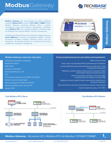 ModbusGateway Programowalny kontroler automatyki Programowalny konwerter IoT Modbus(PAC) Dodatkową funkcjonalnością jest możliwość konfiguracji przez panel WEB-owy (z poziomu przeglądarki WWW) z funkcją zarządzania grupami urządzeń, zbierania danych oraz ich wizualizacji. To wszystko sprawia, że rozwiązanie jest proste i szybkie we wdrożeniu i konfiguracji. Modbus Gateway może być użyty jako: Modbus Gateway Modbus Gateway jest przeznaczony do łatwej integracji urządzeń Modbus RTU z sieciami TCP / MQTT / SNMP. Dzięki Modbus Gateway urządzenia Modbus Slave z portem szeregowym można bez problemu zintegrować z istniejącą siecią Modbus TCP, oraz urządzenia Modbus TCP Slave stają się dostępne dla urządzeń Master z portem szeregowym. PRODUKT POLSKI Cechy przystosowania do warunków przemysłowych: Małe zużycie energii Konwerter protokołów i interfejsów Zegar czasu rzeczywistego (RTC) podtrzymywany bateryjnie Rejestrator danych Web Server Funkcja WatchDog zapewnia kontrolę pracy wybranych usług na poziomie sprzętowym Komputer embedded Efektywne systemy plików zastosowane do pamięci FLASH zapewniające długą, bezawaryjną pracę Moduł telemetryczny / IoT PLC Zwarta, wytrzymała obudowa z tworzywa ABS, przystosowana do instalacji na szynie DIN Przemysłowy modem/router GPRS, 3G, 4G/LTE Moduł rozszerzeń wejśc/wyjść Wygodny sposób instalacji dzięki zastosowaniu rozłączalnych terminali śrubowych Moduł powiadomień GPRS, 3G, 4G/LTE Brak elementów ruchomych (wentylatorów, dysków talerzowych) Moduł wizualizacji przez web-service Zakres temperatur pracy: -25 ~ 80°C Modem GPS Tryb Modbus RTU Slave Tryb Modbus RTU Master HOST COMPUTER PLC MODBUS TCP MASTER DEVICE ETHERNET RS-232 MODBUS GATEWAY MODBUS GATEWAY RS-232 RS-485 PLC PLC MODBUS TCP SLAVE DEVICE LOOP CONTROLLER POWER MEASUREMENT MODBUS RTU SLAVE DEVICE Modbus Gateway - Konwerter IoT z Modbus RTU do Modbus TCP/MQTT/SNMP www.techbase.eu MODBUS RTU MASTER DEVICE ETHERNET MODBUS GATEWAY MODBUS TCP SLAVE DEVICE FLOW METER DRIVES HMI e-mail: [email protected] tel. +48 58 345 39 22 1/2 ver: 1609081146 ZASTOSOWANIE Urzadzenia Modbus Gateway pozwalają na komunikację urządzeń Modbus RTU Master i Slave z siecią LAN/Internet. HMI RS-485 Modbus Gateway MODBUS RTU MASTER DEVICE MODBUS GATEWAY ETHERNET MODBUS GATEWAY MODBUS GATEWAY RS-232 RS-485 FLOW METER DRIVES MODBUS GATEWAY RS-485 LOOP CONTROLLER POWER MEASUREMENT PLC MODBUS RTU SLAVE DEVICE SPECYFIKACJA INTERFEJS ETHERNET Protokoły Modbus TCP, MQTT, SNMP Liczba portów do 2 portów Prędkość 100 Mbit/s Złącza RS45 INTERFEJS SZEREGOWY Protokoły Modbus RTU/ASCII Master/Slave Liczba portów 1/2/4/8 Standard komunikacji szeregowej RS-232/485 Złącza Terminal śrubowy Zabezp. przeciwprzepięciowe Dioda transil dwukierunkowa 24V DC, moc szczytowa 600W SYGNAŁY INTERFEJSU SZEREGOWEGO RS-232 TxD, RxD, GND RS-485 Data+, Data- OPROGRAMOWANIE Konfiguracja Panel WWW, konsola SSH, konsola Telnet, konsola szeregowa Oprogramowanie Linux (Kernel 4.0+), iMod, iModCloud Protokoły sieciowe TCP, UDP, HTTP, SMTP, NTP, DNS, DHCP Client, SNMPv1 (agent), SNMPv2 (agent), ARP, Telnet Multi-master i Multi-drop Tryb Master: 128 TCP slaves/servers Tryb Slave: 256 TCP masters/clients ZASILANIE Napięcie zasilania 7 ~ 30 V DC, zalecane 12V DC 1A Pobór mocy bez / z modemem 2 W - 5 W (standardowo 3 W) / 4 W - 10 W (standardowo 5 W) CHARAKTERYSTYKA MECHANICZNA Przechowywanie danych Pamięc wewnętrzna 4GB EMMC, Pamięc zewnętrzna USB Obudowa i montaż ABS, mocowanie DIN Wymiary 35 x 101 x 120 mm lub 91 x 106 x 61 mm Warunki pracy i przechowywania -25 ~ 80°C, wilgotność: 5 ~ 95% RH (bez kondensacji) PRODUCENT TECHBASE Group Sp. z o.o., ul. Pana Tadeusza 14, 80-123 Gdańsk Modbus Gateway - Konwerter IoT z Modbus RTU do Modbus TCP/MQTT/SNMP www.techbase.eu e-mail: [email protected] tel. +48 58 345 39 22 2/2 ver: 1609081146