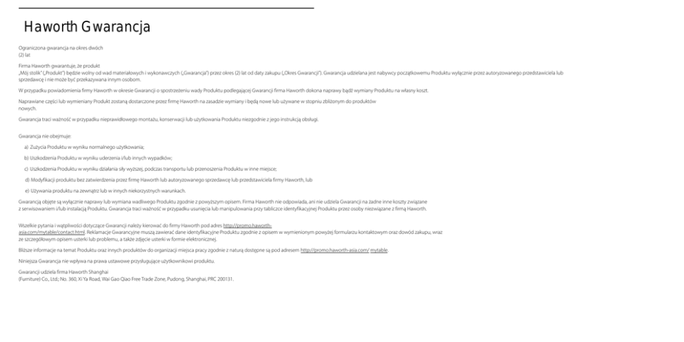 Haworth Gwarancja Ograniczona gwarancja na okres dwóch (2) lat Firma Haworth gwarantuje, że produkt „Mój stolik” („Produkt”) będzie wolny od wad materiałowych i wykonawczych („Gwarancja”) przez okres (2) lat od daty zakupu („Okres Gwarancji”). Gwarancja udzielana jest nabywcy początkowemu Produktu wyłącznie przez autoryzowanego przedstawiciela lub sprzedawcę i nie może być przekazywana innym osobom. W przypadku powiadomienia firmy Haworth w okresie Gwarancji o spostrzeżeniu wady Produktu podlegającej Gwarancji firma Haworth dokona naprawy bądź wymiany Produktu na własny koszt. Naprawiane części lub wymieniany Produkt zostaną dostarczone przez firmę Haworth na zasadzie wymiany i będą nowe lub używane w stopniu zbliżonym do produktów nowych. Gwarancja traci ważność w przypadku nieprawidłowego montażu, konserwacji lub użytkowania Produktu niezgodnie z jego instrukcją obsługi. Gwarancja nie obejmuje: a) Zużycia Produktu w wyniku normalnego użytkowania; b) Uszkodzenia Produktu w wyniku uderzenia i/lub innych wypadków; c) Uszkodzenia Produktu w wyniku działania siły wyższej, podczas transportu lub przenoszenia Produktu w inne miejsce; d) Modyfikacji produktu bez zatwierdzenia przez firmę Haworth lub autoryzowanego sprzedawcę lub przedstawiciela firmy Haworth, lub e) Używania produktu na zewnątrz lub w innych niekorzystnych warunkach. Gwarancją objęte są wyłącznie naprawy lub wymiana wadliwego Produktu zgodnie z powyższym opisem. Firma Haworth nie odpowiada, ani nie udziela Gwarancji na żadne inne koszty związane z serwisowaniem i/lub instalacją Produktu. Gwarancja traci ważność w przypadku usunięcia lub manipulowania przy tabliczce identyfikacyjnej Produktu przez osoby niezwiązane z firmą Haworth. Wszelkie pytania i wątpliwości dotyczące Gwarancji należy kierować do firmy Haworth pod adres http://promo.haworthasia.com/mytable/contact.html. Reklamacje Gwarancyjne muszą zawierać dane identyfikacyjne Produktu zgodnie z opisem w wymienionym powyżej formularzu kontaktowym oraz dowód zakupu, wraz ze szczegółowym opisem usterki lub problemu, a także zdjęcie usterki w formie elektronicznej. Bliższe informacje na temat Produktu oraz innych produktów do organizacji miejsca pracy zgodnie z naturą dostępne są pod adresem http://promo.haworth-asia.com/ mytable. Niniejsza Gwarancja nie wpływa na prawa ustawowe przysługujące użytkownikowi produktu. Gwarancji udziela firma Haworth Shanghai (Furniture) Co., Ltd.; No. 360, Xi Ya Road, Wai Gao Qiao Free Trade Zone, Pudong, Shanghai, PRC 200131.
