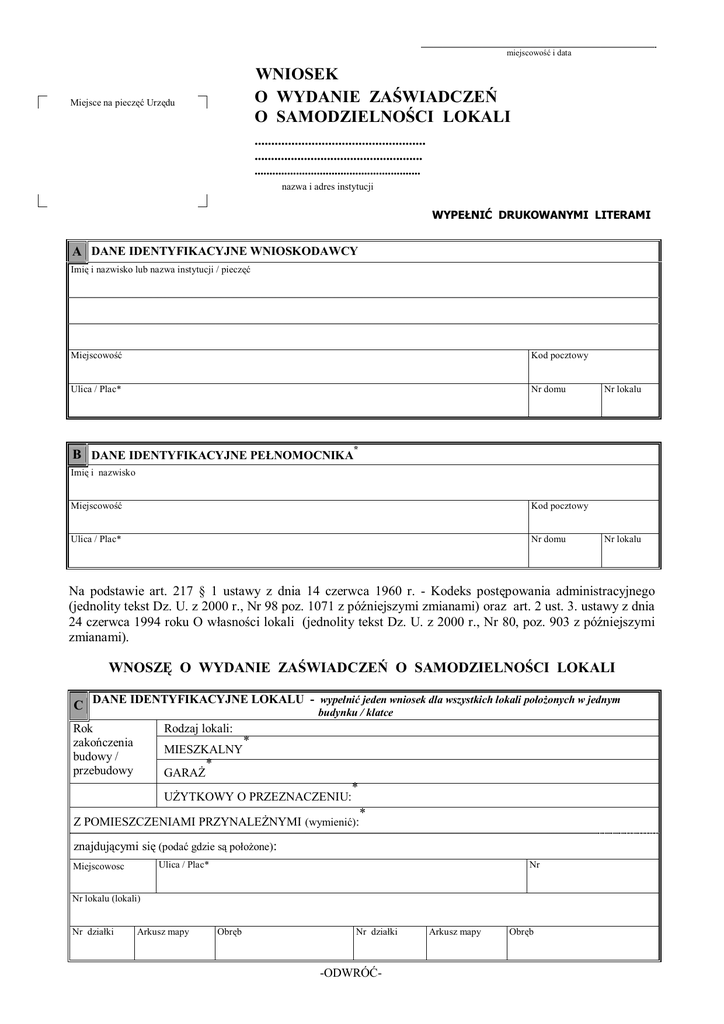 miejscowość i data WNIOSEK O WYDANIE ZAŚWIADCZEŃ O SAMODZIELNOŚCI LOKALI Miejsce na pieczęć Urzędu ................................................... ................................................... ........................................................ nazwa i adres instytucji WYPEŁNIĆ DRUKOWANYMI LITERAMI A DANE IDENTYFIKACYJNE WNIOSKODAWCY Imię i nazwisko lub nazwa instytucji / pieczęć Miejscowość Kod pocztowy Ulica / Plac* Nr domu Nr lokalu B DANE IDENTYFIKACYJNE PEŁNOMOCNIKA* Imię i nazwisko Miejscowość Kod pocztowy Ulica / Plac* Nr domu Nr lokalu Na podstawie art. 217 § 1 ustawy z dnia 14 czerwca 1960 r. - Kodeks postępowania administracyjnego (jednolity tekst Dz. U. z 2000 r., Nr 98 poz. 1071 z późniejszymi zmianami) oraz art. 2 ust. 3. ustawy z dnia 24 czerwca 1994 roku O własności lokali (jednolity tekst Dz. U. z 2000 r., Nr 80, poz. 903 z późniejszymi zmianami). WNOSZĘ O WYDANIE ZAŚWIADCZEŃ O SAMODZIELNOŚCI LOKALI C DANE IDENTYFIKACYJNE LOKALU - wypełnić jeden wniosek dla wszystkich lokali położonych w jednym budynku / klatce Rok zakończenia budowy / przebudowy Rodzaj lokali: MIESZKALNY * GARAŻ * UŻYTKOWY O PRZEZNACZENIU: * Z POMIESZCZENIAMI PRZYNALEŻNYMI (wymienić): * znajdującymi się (podać gdzie są położone): Ulica / Plac* Miejscowosc Nr Nr lokalu (lokali) Nr działki Arkusz mapy Obręb Nr działki -ODWRÓĆ- Arkusz mapy Obręb WNIOSKODAWCY UZASADNIAJĄCE JEGO INTERES PRAWNY W UZYSKANIU D OŚWIADCZENIE ZAŚWIADCZENIA (określenie celu, któremu ma służyć zaświadczenie) E INFORMACJA O ZAŁĄCZONYCH DOKUMENTACH* Ilość kopie rzutów i przekrojów odpowiedniej części budynku, będące w posiadaniu właściciela lub zarządcy lub inwentaryzacja budowlana, z zaznaczonym lokalem i pomieszczeniami przynależnymi, 1. z aktualnym oświadczeniem właściciela, że po zakończeniu budowy / przebudowy nie zostały wprowadzone żadne zmiany, w wypadku braku pozycji nr 1 - szkice, czyli rysunek przedstawiający rzut i przekrój lokalu 2. z jednoznacznie zaznaczonym układem i opisem pomieszczeń oraz oświadczeniem osoby posiadającej ** uprawnienia budowlane, Dla lokali w budynkach oddanych do użytkowania na podstawie Ustawy z dnia 7 lipca 1994 r. Prawo budowlane: 3. dokument potwierdzający przystąpienie do użytkowania budynku (pozwolenie lub zaświadczenie), kopia rzutu poziomego i przekroju części budynku z oznaczeniem lokalu oraz pomieszczeń 4. przynależnych wraz z aktualnym oświadczeniem właściciela, że nie zostały wprowadzone żadne zmiany, 5. pełnomocnictwo udzielone osobie działającej w imieniu wnioskodawcy, 6. 7. Miejsce na znaki opłaty skarbowej podpis wnioskodawcy lub osoby przez niego upoważnionej * niepotrzebne skreślić ** oświadczenie powinno potwierdzać, że dany lokal spełnia wymogi art. 2 ust 2 ustawy z dnia 24 czerwca 1994 r. O własności lokali (jednolity tekst Dz. U. z 2000 r., Nr 80, poz. 903 z późniejszymi zmianami) -ODWRÓĆ-