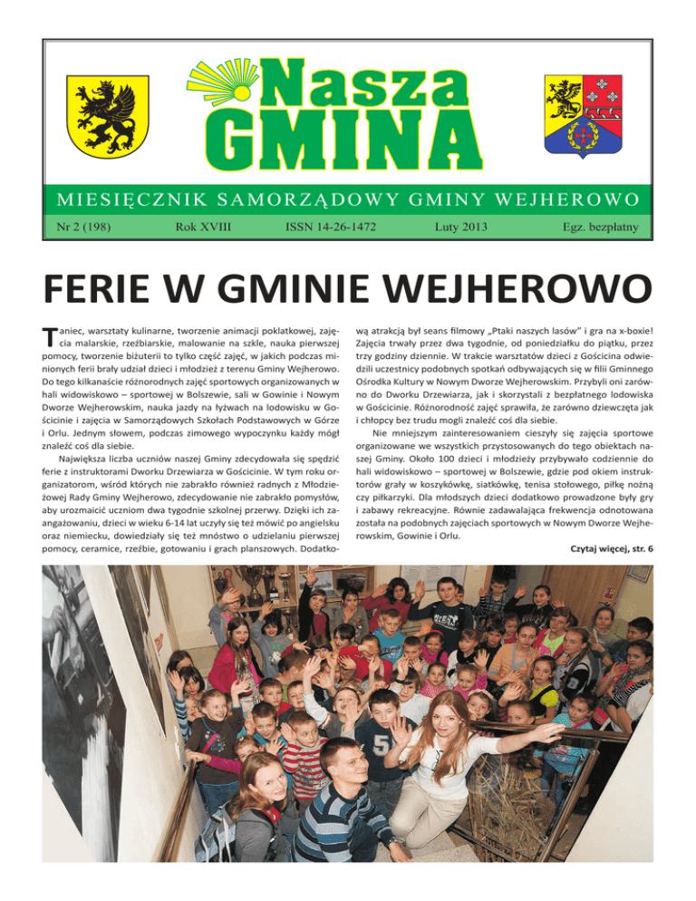 MIESIĘCZNIK SAMORZĄDOWY GMINY WEJHEROWO Nr 2 (198) Rok XVIII ISSN 14-26-1472 Luty 2013 Egz. bezpłatny FERIE W GMINIE WEJHEROWO T aniec, warsztaty kulinarne, tworzenie animacji poklatkowej, zajęcia malarskie, rzeźbiarskie, malowanie na szkle, nauka pierwszej pomocy, tworzenie biżuterii to tylko część zajęć, w jakich podczas minionych ferii brały udział dzieci i młodzież z terenu Gminy Wejherowo. Do tego kilkanaście różnorodnych zajęć sportowych organizowanych w hali widowiskowo – sportowej w Bolszewie, sali w Gowinie i Nowym Dworze Wejherowskim, nauka jazdy na łyżwach na lodowisku w Gościcinie i zajęcia w Samorządowych Szkołach Podstawowych w Górze i Orlu. Jednym słowem, podczas zimowego wypoczynku każdy mógł znaleźć coś dla siebie. Największa liczba uczniów naszej Gminy zdecydowała się spędzić ferie z instruktorami Dworku Drzewiarza w Gościcinie. W tym roku organizatorom, wśród których nie zabrakło również radnych z Młodzieżowej Rady Gminy Wejherowo, zdecydowanie nie zabrakło pomysłów, aby urozmaicić uczniom dwa tygodnie szkolnej przerwy. Dzięki ich zaangażowaniu, dzieci w wieku 6-14 lat uczyły się też mówić po angielsku oraz niemiecku, dowiedziały się też mnóstwo o udzielaniu pierwszej pomocy, ceramice, rzeźbie, gotowaniu i grach planszowych. Dodatko- wą atrakcją był seans filmowy „Ptaki naszych lasów” i gra na x-boxie! Zajęcia trwały przez dwa tygodnie, od poniedziałku do piątku, przez trzy godziny dziennie. W trakcie warsztatów dzieci z Gościcina odwiedzili uczestnicy podobnych spotkań odbywających się w filii Gminnego Ośrodka Kultury w Nowym Dworze Wejherowskim. Przybyli oni zarówno do Dworku Drzewiarza, jak i skorzystali z bezpłatnego lodowiska w Gościcinie. Różnorodność zajęć sprawiła, że zarówno dziewczęta jak i chłopcy bez trudu mogli znaleźć coś dla siebie. Nie mniejszym zainteresowaniem cieszyły się zajęcia sportowe organizowane we wszystkich przystosowanych do tego obiektach naszej Gminy. Około 100 dzieci i młodzieży przybywało codziennie do hali widowiskowo – sportowej w Bolszewie, gdzie pod okiem instruktorów grały w koszykówkę, siatkówkę, tenisa stołowego, piłkę nożną czy piłkarzyki. Dla młodszych dzieci dodatkowo prowadzone były gry i zabawy rekreacyjne. Równie zadawalająca frekwencja odnotowana została na podobnych zajęciach sportowych w Nowym Dworze Wejherowskim, Gowinie i Orlu. Czytaj więcej, str. 6 NASZA GMINA Galeria Jubilatów Janina Chrzanowska, 90 lat, Bolszewo Józef Stalmach, 90 lat, Gościcino Szanowni Mieszkańcy! Do następnego numeru „Naszej Gminy” dołączona zostanie deklaracja o wysokości opłaty za gospodarowanie odpadami komunalnymi. Nakład tego numeru wynosił będzie 5.000 egzemplarzy. Wójt Gminy Wejherowo Henryk Skwarło Kwalifikacja wojskowa 2013 K walifikacja wojskowa dla mieszkańców Gminy Wejherowo odbędzie się w okresie od 26 marca do 3 kwietnia 2013r. w Wejherowie przy ulicy Ofiar Piaśnicy 22 w budynku Powiatowego Zespołu Poradni Psychologiczno-Pedagogicznych. Kwalifikacją wojskową objęci są mężczyźni urodzeni w 1994 roku i zameldowani na terenie Gminy Wejherowo. Imienne wezwania do 186 osób podlegających kwalifikacji zostaną wysłane na adresy zameldowania zainteresowanych osób. Celem kwalifikacji wojskowej jest sprawdzenie w oparciu o badania przeprowadzone przez Powiatową Komisję Lekarską w Wejherowie predyspozycji, zdrowia psychicznego i fizycznego pod kątem zdolności do służby wojskowej. Po raz kolejny kwalifikacja odbywa się według nowych zasad, czyli po nadaniu kategorii zdrowia wszyscy przechodzący kwalifikację wojskową zostaną z mocy ustawy przeniesieni do rezerwy. Osoby takie dostaną książeczkę wojskową i zostaną wpisani do specjalnej ewidencji. Osoby stawiające się do kwalifikacji wojskowej przedstawiają dowód osobisty, posiadaną dokumentację medyczną, fotografię oraz dokument potwierdzający poziom wykształcenie. Informacji osobom zainteresowanym udziela Referat Spraw Obywatelskich po numerem telefonu. 677 97 12 lub 677 97 09. Komunikat dotyczący ustawy śmieciowej Od 1 lipca 2013 r. odpady komunalne powstające na nieruchomościach zamieszkałych odbierane będą przez podmiot wyłoniony przez Gminę. Opłaty za usługę w zakresie określonym uchwałą Rady Gminy Wejherowo wnoszone będą na konto urzędu. Z DNIEM 30 CZERWCA 2013 r. WINNY PRZESTAĆ OBOWIĄZYWAĆ DOTYCHCZASOWE UMOWY ZAWARTE PRZEZ MIESZKAŃCÓW Z FIRMAMI WYWOZOWYMI. PROSIMY WYPOWIEDZIEĆ SWOJE UMOWY NA ODBIÓR ODPADÓW ZE SKUTKIEM NA DZIEŃ 30.06.2013 r. Wójt Gminy Wejherowo Henryk Skwarło 2 | Miesięcznik Samorządowy Gminy Wejherowo nr 2 (198) Organizacje pozarządowe staną do konkursów Gmina Wejherowo wprowadziła nowe zasady dotyczące organizacji imprez kulturalnych i sportowych. Od tego roku wszystkie stowarzyszenia działające na terenie Gminy, chcące pozyskać środki na realizację zaplanowanych przed siebie przedsięwzięć, zmuszone będą stanąć do konkursu, którego wynik zadecyduje o tym kto i w jakim zakresie realizować będzie określone zadanie. W tym roku rozstrzygnięto już konkurs na organizację wypoczynku podczas ferii zimowych. O nowych zasadach dotyczących współpracy z organizacjami pozarządowymi rozmawiamy z Wójtem Gminy Wejherowo Henrykiem Skwarło. W jaki sposób zmienił się sposób organizowania przedsięwzięć sportowych i kulturalnych w Gminie Wejherowo? – Od tego roku chcemy pomagać organizacjom pozarządowym na nowych zasadach. Nie będą więc, jak to miało miejsce dotychczas, doraźnie przyznawane dotacje na działania zgłaszane przez organizatorów różnych imprez. Teraz Gmina dla każdego przedsięwzięcia organizować będzie konkurs, do którego stanąć muszą zainteresowane podmioty. Jakie warunki trzeba spełnić żeby wziąć udział w konkursie? – Przede wszystkim do konkursu stanąć może jedynie organizacja pozarządo