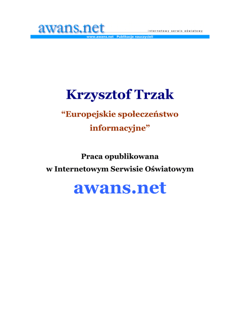 ! " Opracował Krzysztof Trzak dyrektor Szkoły Podstawowej w Alojzowie 23.05.2002 . Rola i miejsce szkół w tym obszarze działa , zadania dla krajów kandyduj cych. Unia Europejska tworzy sprzyjaj ce warunki, wyznacza strategiczne zadania oraz koordynuje i finansuje działania słu ce rozwijaniu społecze stwa informacyjnego. Zgodnie z wnioskami raportu Bangemanna, w 2000 roku kraje członkowskie przyj ły program dalszego rozwoju społecze stwa informacyjnego: "e-Europe-Information Society for All". Społecze stwo informacyjne Szybki rozwój technologii powoduje daleko id ce zmiany społeczne i ekonomiczne. Konkurencyjno przemysłu i usług zale y coraz cz ciej od zarz dzania informacj , jej jako ci i szybko ci przepływu. To z kolei wymaga nowych technik gromadzenia, przetwarzania, przekazywania - i u ytkowania multimedialnej informacji, struktury a co za tym telekomunikacyjnej idzie opartej na wiatłowodowych infostradach. Społecze stwo informacyjne charakteryzuje si do elektronicznych powszechnym dost pem rodków przekazu informacji, zró nicowanej techniki komunikacyjnej, nieskr powanego dost pu do sieci wszystkich operatorów i usługodawców oraz zdolno ci wzajemnego ł czenia si danych. Kompatybilne urz dzenia techniczne umo liwiaj kontakt bez wzgl du na miejsce pobytu wła ciciela. i przetwarzania nieprzerwany Raport Bangemanna Opublikowany w 1994 roku raport Bangemanna "Europa i społecze stwo globalnej informacji" wskazywał, e rozwój społecze stwa informacyjnego prowadzi do radykalnych przeobra e Posiadanie oraz umiej tno staje si społecznych i gospodarczych. przetwarzania i wykorzystywania informacji podstawowym dobrem warunkuj cym dalszy rozwój i dobrobyt społecze stwa. Kraje Pi tnastki zadeklarowały gotowo wspólnego działania w celu budowy społecze stwa informacyjnego. Po kilkumiesi cznych dyskusjach wyłonił si plan działania - e-Europe 2002, który został przyj ty podczas szczytu w Feira w czerwcu 2000 roku. Program ma na celu przyspieszenie modernizacji ekonomicznej krajów członkowskich oraz zniwelowanie ró nic w dost pie do informacji pomi dzy du ymi o rodkami miejskimi a prowincj . Pa stwa członkowskie zobowi zały si do realizacji trzech głównych celów strategicznych: • upowszechnienia cywilizacji informacyjnej w ród obywateli Europy, szkół, przedsi biorstw oraz administracji publicznej; • wspierania rozwoju nowych technologii informatycznych i komunikacyjnych; • wzmocnienia spójno ci socjalnej. Dla realizacji tych celów Komisja Europejska wyznaczyła 10 obszarów tematycznych: 1. Wprowadzenie Internetu, rodków multimedialnych do szkół i ich adaptacja do potrzeb edukacyjnych (e-Edukacja). 2. Ta szy dost p do Internetu. 3. Szybki Internet dla naukowców i studentów. 4. Karty elektroniczne dla bezpiecze stwa dost pu do informacji (e-Bezpiecze stwo) 5. e-Handel. 6. Uwzgl dnienie potrzeb osób niepełnosprawnych. 7. Rz d online. 8. Słu ba zdrowia online. 9. Inteligentny transport. 10. Finansowanie innowacyjnych projektów z dziedziny ICT. Poni ej przedstawi główne zało enia pkt1 gdy z racji wykonywanej pracy jest on mi najbli szy, oraz zało enia programu e-Europe+ e-Edukacja (europejska młodzie w erze cyfrowej) Zgodnie z zało eniami programu do ko ca ubiegłego roku wszystkie szkoły w UE miały otrzyma Ju dost p do Internetu i narz dzi multimedialnych. w maju 2001 roku ponad 80% szkół w UE spełniało to kryterium (w Hiszpanii 95% szkół rednich). W połowie 2001 roku na 100 uczniów w europejskich szkołach przypadało rednio 4 komputery PC podł czone do Internetu (najwi cej w Danii, najmniej w Grecji i Portugalii). Do ko ca 2002 roku bezpo redni dost p do narz dzi internetowych i multimedialnych powinni mie wszyscy nauczyciele, jak równie odby szkolenia w ich wykorzystaniu (pod koniec roku 2001 takie kursy uko czyła ponad połowa nauczycieli). Na pocz tku roku 2003 uczniowie powinni móc korzysta z szybkiego dost pu do Internetu we własnej klasie. W roku 2002 w ramach programu e-Edukacja Komisja Europejska uruchomiła 16 projektów o ł cznej warto ci 35 mln euro. Znaczne fundusze pochodz równie z pa stw członkowskich. Przykładowo Wielka Brytania przeznaczyła 700 mln GBP na ulepszenie infrastruktury Internetu w szkołach. Działania pa stw członkowskich wspomagaj rodki strukturalnych. Edukacja multimedialna wspierana jest te z funduszy przez program PROMETEUS. E – Europe+ Inicjatywa e-Europe+ zobowi zała równie do działania pa stwa kandyduj ce do UE. Podczas konferencji ministerialnej w maju 2000 r. w Warszawie pa stwa te przyj ły bli niaczy program - e-Europe+. Jego celem jest przyspieszenie budowy społecze stwa informacyjnego w Polsce mi dzy innymi poprzez rozwój usług z dziedziny ł czno ci, dost pnych cenowo dla wszystkich przetransponowanie i obywateli. wdro enie acquis Jednocze nie zakłada communautaire w si zakresie społecze stwa informacyjnego. Program przewiduje stworzenie ta szego, szybszego i bezpieczniejszego dost pu do Internetu mi dzy innymi poprzez zwi kszenie szybko ci poł cze i usług dost pnych mi dzy krajowymi sieciami naukowymi i szkolnymi a UE i reszt wiata (oraz w obr bie tych sieci), a tak e popularyzacj bezpiecznych sieci i wielofunkcyjnych kart mikroprocesorowych. Jednym z istotnych elementów e-Europe+ jest tak e inwestowanie w ludzi i umiej tno ci m.in. poprzez zwi kszanie liczby komputerów (w tym komputerów podł czonych do Internetu w szkołach), odsetka pracowników posiadaj cych przynajmniej podstawowe przeszkolenie w dziedzinie technologii informacyjnych, liczby miejsc i absolwentów szkole w dziedzinie komputerów i technologii informacyjnych oraz odsetka pracowników wykonuj cych prac z zastosowaniem rodków ł czno ci. Program ma tak e na celu stworzenie publicznych punktów internetowych (PIAP) dla ka dego 1000 mieszka ców oraz centralnych sieci rz dowych, dzi ki którym obywatele b d mogli załatwia sprawy urz dowe za po rednictwem Internetu. Ma równie pobudzi