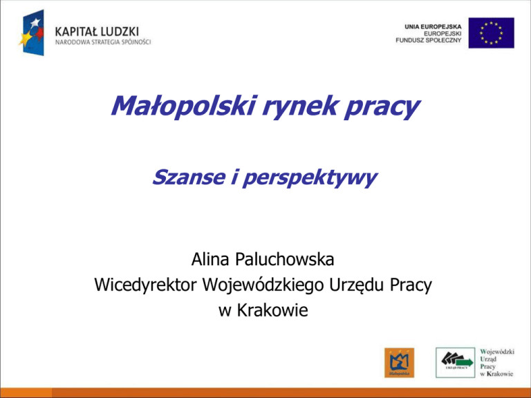 Małopolski rynek pracy Szanse i perspektywy Alina Paluchowska Wicedyrektor Wojewódzkiego Urzędu Pracy w Krakowie Uczenie się przez całe życie Każdy człowiek odpowiada za swój rozwój edukacyjno – zawodowy Na kolejnych etapach życia wpierać go powinny różne instytucje i osoby Rodzice Przedszkole Szkoła Uczelnia Pracodawca Pracodawcy i ich związki Związki zawodowe Instytucje rynku pracy i dialogu społecznego Za przygotowanie kadr wspólną odpowiedzialność ponoszą wszyscy partnerzy rynku pracy Małopolski rynek pracy Struktura podmiotów gospodarczych w Małopolsce 94,60% mikro małe średnie 4,52% duże 0,12% 0,76% Pracujący w Małopolsce - 1,3 mln osób, w tym: Zatrudnieni w sektorze przedsiębiorstw – 407,3 tys. osób (Firmy zatrudniające powyżej 9 osób) Małopolski rynek pracy Zatrudnienie wg sektorów ekonomicznych 200000 174108 170224 150000 100000 42% 38871 43% 4,2% 3% 16937 12587 w tym administrow anie i działalność w spierająca w tym informacja i komunikacja 50000 9,5% 0 Przemysł 9,5% Budow nictw o Usługi Tendencje długoterminowe * Dotyczy wyłącznie firm zatrudniających ponad 9 pracowników Zapotrzebowanie na pracowników EUROPA MAŁOPOLSKA POLSKA • Wykwalifikowani pracownicy fizyczni • Wykwalifikowani pracownicy fizyczni • Personel ds. biznesu i administracji • Przedstawiciele handlowi • Menedżerowie projektów • Sprzedawcy • Robotnicy budowlani Technicy • • Kucharze • Kierowcy • • Kierowcy Kierownicy ds. Produkcji i usług • Pracownicy księgowości i finansów • • Pracownicy usług osobistych • Inżynierowie Pracownicy sekretariatu, asystenci dyrekcji • • Kucharze Specjaliści ds. ochrony zdrowia • Pracownicy sekretariatu, asystenci dyrekcji • Wykwalifikowani pracownicy fizyczni • Pracownicy działów IT • Inżynierowie • Operatorzy maszyn i urządzeń • Lekarze i wykwalifikowany personel medyczny • Pracownicy działów IT • Kierowcy • Pracownicy recepcji • Specjaliści ds. ekonomicznych • • Pracownicy hoteli i restauracji Pracownicy księgowości i finansów Manpower Polska 2010, Badanie zapotrzebowania na pracowników wśród małopolskich pracodawców 2009, WUP Kraków MORPIE Małopolski rynek pracy Przedsiębiorstwa Oczekiwania wobec pracownika Mikro Małe Średnie Duże Oczekuje się pełnego przygotowania 27,4% 22,6% 23,8% 25,0% Zakłada się doszkolenie w stopniu niewielkim 43,5% 44,3% 42,9% 41,7% Zakłada się doszkolenie w stopniu dużym 20,0% 23,5% 27,0% 29,2% Zakłada się doszkolenie w stopniu bardzo dużym 9,2% 9,5% 6,3% 4,2% Badanie zapotrzebowania na pracowników wśród małopolskich pracodawców 2009, WUP Kraków – MORPIE Małopolski rynek pracy Brak wykwalifikowanej kadry na rynku (79%) Nie odpowiadały im warunki pracy (21%) Brak odpowiednich umiejętności i kompetencji (44 %) Brak doświadczenia (22 %) Brak motywacji (11 %) Brak uprawnień ( 7%) Warunki finansowe (81%) Warunki wykonywania pracy (23%) Badanie zapotrzebowania na pracowników wśród małopolskich pracodawców 2009, WUP Kraków – MORPIE Wykształcenie a zatrudnienie Na podstawie badań dr J. Tyrowicz Uniwersytet Warszawski Wykształcenie a płace Wykształcenie a czas pozostawania na bezrobociu Korelacja poziomu wykształcenia z czasem przebywania na bezrobociu 60 50 52% 53% 47% 43% 42% wyższe 40 34% 32% 25% 25% 24%23% 23% 30 29% 23% 24% polic.i śr.zaw. LO 20 zasadnicze zaw. 10 0 do 6 m-cy 6-12 m-cy powyżej 12 m-cy gimnazjalne i poniżej Migracje zagraniczne Polaków Migranci wg poziomu wykształcenia 100% 80% 60% 40% 20% 0% Niemcy Włochy Inne Wielka Brytania Reszta UE 15 Srednie i policealne USA Wyższe Kanada Strategie migracyjne Polaków Dwie podstawowe strategie migracyjne: Zarobkowa (głównie do drugorzędnego sektora rynku pracy) Edukacyjna Dwie główne grupy migrantów: Regiony peryferyjne (wsie i małe miasta), niezbyt dobrze wykształceni, często bez satysfakcjonującej, stałej pracy Młodzi ze średnich i dużych miast, wykształceni, bez doświadczenia Strategie migracyjne Polaków Badania brytyjskie: „planowany brak strategii” Wyjazdy kosztem edukacji potencjał edukacyjny nie jest wykorzystywany redukcja aspiracji EFEKT: Emigranci z wykształceniem wyższym wpadają w tzw. pułapkę „przerwy w życiorysie” Popyt na kwalifikacje w *UE Zmiany zatrudnienia ze względu na poziom kwalifikacji w UE Poziom zatrudnienia w tys. os. 120000 100000 80000 1996 2006 60000 2015 * 40000 20000 0 Niskie kw alifikacje Średnie kw alifikacje * Prognoza Future skill needs in Europe Medium-term forecast 2008, CEDEFOP Wysokie kw alifikacje Trendy na rynku pracy Nowoczesne społeczeństwo oparte na wiedzy rosnące i znaczenie doświadczenia, różnych postrzeganych form jako zdobywania czynnik wiedzy decydujący o konkurencyjności jednostek, firm i gospodarki; zmiana procesów zachodzących na rynku pracy, w szczególności zatarcie linii podziału między pracą a edukacją; rosnące znacznie umiędzynarodowienia rynków pracy i produktów. Projekt REFLEX – Research into Employment and professional FLEXibility (2007) Trendy na rynku pracy Zapotrzebowanie na pięć obszarów kompetencji Zdolność do współpracy międzynarodowej Korzystanie z kapitału ludzkiego Innowacyjność i zarządzanie wiedzą Projekt REFLEX – Research into Employment and professional FLEXibility (2007) Doskonałość w zakresie umiejętności specjalistycznych Elastyczność funkcjonalna Trendy na rynku pracy Oczekiwane kompetencje pracowników Foresight kadr nowoczesnej gospodarki, PARP 2009 O konkurencyjności wśród osób z wyższym wykształceniem decydują: wykorzystanie wiedzy w praktyce, kompetencje kluczowe, doświadczenie w kontakcie z pracodawcami, umiejętność uczenia się… Wykształcenie wyższe daje dostęp do wykonywania wielu zawodów. To jedynie warunek formalny , który daje szanse do konkurowania o pracę, awans … Mocne strony rozwoju zawodowego Samokształcenie, kształcenie przez 