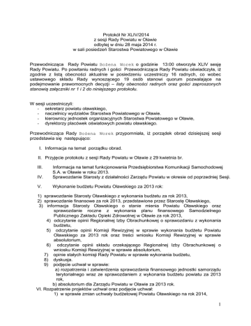 Protokół Nr XLIV/2014 z sesji Rady Powiatu w Oławie odbytej w dniu 28 maja 2014 r. w sali posiedzeń Starostwa Powiatowego w Oławie Przewodnicząca Rady Powiatu Bożena Worek o godzinie 13:00 otworzyła XLIV sesję Rady Powiatu. Po powitaniu radnych i gości Przewodnicząca Rady Powiatu oświadczyła, iż zgodnie z listą obecności aktualnie w posiedzeniu uczestniczy 16 radnych, co wobec ustawowego składu Rady wynoszącego 19 osób stanowi quorum pozwalające na podejmowanie prawomocnych decyzji – listy obecności radnych oraz gości zaproszonych stanowią załączniki nr 1 i 2 do niniejszego protokołu. W sesji uczestniczyli: - sekretarz powiatu oławskiego, - naczelnicy wydziałów Starostwa Powiatowego w Oławie. - kierownicy jednostek organizacyjnych Starostwa Powiatowego w Oławie, - dyrektorzy placówek oświatowych powiatu oławskiego. Przewodnicząca Rady Bożena Worek przypomniała, iż porządek obrad dzisiejszej sesji przedstawia się następująco: I. Informacja na temat porządku obrad. II. Przyjęcie protokołu z sesji Rady Powiatu w Oławie z 29 kwietnia br. III. IV. Informacja na temat funkcjonowania Przedsiębiorstwa Komunikacji Samochodowej S.A. w Oławie w roku 2013. Sprawozdanie Starosty z działalności Zarządu Powiatu w okresie od poprzedniej Sesji. V. Wykonanie budżetu Powiatu Oławskiego za 2013 rok: 1) sprawozdanie Starosty Oławskiego z wykonania budżetu za rok 2013, 2) sprawozdanie finansowe za rok 2013, przedstawione przez Starostę Oławskiego, 3) informacja Starosty Oławskiego o stanie mienia Powiatu Oławskiego oraz sprawozdanie roczne z wykonania planu finansowego Samodzielnego Publicznego Zakładu Opieki Zdrowotnej w Oławie za rok 2013, 4) odczytanie opinii Regionalnej Izby Obrachunkowej o sprawozdaniu z wykonania budżetu, 5) odczytanie opinii Komisji Rewizyjnej w sprawie wykonania budżetu Powiatu Oławskiego za 2013 rok oraz treści wniosku Komisji Rewizyjnej w sprawie absolutorium, 6) odczytanie opinii składu orzekającego Regionalnej Izby Obrachunkowej o wniosku Komisji Rewizyjnej w sprawie absolutorium, 7) opinie stałych komisji Rady Powiatu w sprawie wykonania budżetu, 8) dyskusja. 9) podjęcie uchwał w sprawie: a) rozpatrzenia i zatwierdzenia sprawozdania finansowego jednostki samorządu terytorialnego wraz ze sprawozdaniem z wykonania budżetu powiatu za 2013 rok, b) absolutorium dla Zarządu Powiatu w Oławie za 2013 rok. VI. Rozpatrzenie projektów uchwał oraz podjęcie uchwał: 1) w sprawie zmian uchwały budżetowej Powiatu Oławskiego na rok 2014, 1 2) zmieniająca uchwałę w sprawie przyjęcia wieloletniej prognozy finansowej Powiatu Oławskiego, 3) w sprawie przekazania Komendzie Powiatowej Policji w Oławie środków finansowych przeznaczonych na nagrody dla trzech funkcjonariuszy za osiągnięcia w służbie, 4) w sprawie przekazania Komendzie Powiatowej Policji w Oławie środków finansowych przeznaczonych na nagrody dla policjantów za osiągnięcia w służbie. VII. Interpelacje, zapytania, wnioski i oświadczenia radnych. Przewodnicząca Rady Powiatu Bożena Worek zgłosiła wniosek o zmianę porządku obrad sesji, w związku z wnioskiem Dyrektora Dolnośląskiego Ośrodka Doradztwa Rolniczego we Wrocławiu dotyczącym wyrażenia zgody na rozwiązanie stosunku pracy za wypowiedzeniem z radnym Markiem Chudym, proponując wprowadzenie do porządku obrad sesji projektu uchwały w tej sprawie. O udzielenie głosu poprosił radny Marek Szponar, który mając na uwadze, iż wniosek wpłynął do Biura Rady 23 maja br. powiedział, iż nie widzi potrzeby, aby procedować w tej sprawie już na tej sesji Rady Powiatu, ponieważ projekt uchwały nie był omawiany przez poszczególne komisje stałe. Ponadto radni nie będą mieli możliwości precyzyjnie zapoznać się z przedmiotowym wnioskiem i szczegółowo zapoznać się z uzasadnieniem, czy tez dokonać sprawdzenia, czy sprawa nie jest związana z wykonywaniem przez radnego mandatu. Radny zapytał – co stoi na przeszkodzie, aby rozpatrzyć wniosek Dyrektora DODR we Wrocławiu na następnej sesji? Przewodnicząca Rady Bożena Worek odnosząc się do wystąpienia radnego, zapytała - co stoi na przeszkodzie, aby przedmiotowy wniosek nie mógł zostać rozpatrzony na dzisiejszej sesji? Przewodnicząca Rady Powiatu Bożena Worek zapytała czy są inne uwagi do porządku obrad sesji? Radna Ewa Szczepanik zapytała w jaki sposób radni będą mogli zapoznać się z uzasadnieniem? Przewodnicząca Rady odpowiedziała, iż w trakcie obrad. W związku z brakiem dalszych uwag do porządku obrad Przewodnicząca Rady poddała pod głosowanie wniosek o zmianę porządku obrad sesji. Rada Powiatu w obecności 17 radnych dokonała zmiany porządku obrad sesji bezwzględną większością głosów ustawowego składu Rady Powiatu, wynoszącego 19 radnych, przy 10 głosach za”, 6 głosach „przeciw” i 1 głosie „wstrzymującym się”. Następnie przewodnicząca Rady przystąpiła do realizacji porządku obrad. Ad II Przyjęcie protokołu z sesji Rady Powiatu w Oławie z 30 kwietnia 2014 r. Protokół został przyjęty przez aklamację. 2 Ad III Informacja na temat funkcjonowania Przedsiębiorstwa Komunikacji Samochodowej S.A. w Oławie w roku 2013. Przewodnicząca Rady Powiatu Bożena Worek poprosiła Prezesa Zarządu Przedsiębiorstwa Komunikacji Samochodowej S.A. w Oławie – Pana Erwina Monastyrskiego o przedstawienie informacji. Prezes Zarządu PKS S.A. w Oławie Erwin /załącznik nr 3/. Monastyrski przedstawił informację Przewodnicząca Rady podziękowała Panu Erwinowi Monastyrskiemu, a następnie otworzyła dyskusję. O udzielenie głosu poprosił wiceprzewodniczący Józef Hołyński, który zwrócił uwagę, iż porównaniu do lat ubiegłych sytuacja finansowa spółki uległa poprawie, wprawdzie rok zamknął się strata finansową, jednakże jest ona znacznie mniejsza niż w latach ubiegłych. Ponadto wypowiedział się na temat rozważenia możliwości likwidacji