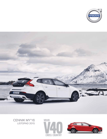 VOLVO V40 CROSS COUNTRY | 1 CENNIK MY’16 LISTOPAD 2015 VOLVO V40 CROSS COUNTRY | 2 VOLVO V40 CROSS COUNTRY | 3 SPIS TREŚCI Jednostki napędowe 04 Technologia 05 Wyposażenie standardowe 06 Edycja specjalna Volvo Ocean Race 08 Bezpieczeństwo 10 Komfort 11 Funkcjonalność 12 13 Koła 14 Tapicerki 15 Wykończenie wnętrza 18 Lakiery 19 Promocyjne pakiety wyposażenia 20 Promocyjne pakiety wyposażenia dla edycji VOLVO OCEAN RACE 22 Volvo On Call 23 24 Akcesoria 27 Pakiety gwarancyjne 28 Optymalizacja osiągów Polestar nowej generacji 29 Dane techniczne 30 VOLVO V40 CROSS COUNTRY | 4 SILNIKI BENZYNOWE Silnik (litr/KM) Cena w zł z VAT Skrzynia biegów Base Kinetic Momentum Summum 2.0/152 manualna, 6 biegów 98 700 105 300 111 300 124 200 1.5/152 automatyczna Geartronic, 6 biegów 107 700 114 300 120 300 133 200 T4 AWD 2.0/190 automatyczna Geartronic, 8 biegów – 128 300 134 300 147 200 T5 AWD 2.0/245 automatyczna Geartronic, 8 biegów – – – 158 100 T3 Oprogramowanie Polestar zmienia charakterystykę układu Polestar Performance dla V40 T5 AWD napędowego, zwiększa moc oraz moment obrotowy Twojego Volvo. SILNIKI DIESLA Silnik (litr/KM) Cena w zł z VAT Skrzynia biegów Base Kinetic Momentum Summum 2.0/120 manualna, 6 biegów 102 900 109 500 115 500 128 400 2.0/120 automatyczna Geartronic, 6 biegów 111 900 118 500 124 500 137 400 2.0/150 manualna, 6 biegów 108 600 115 200 121 200 134 100 2.0/150 automatyczna Geartronic, 6 biegów 117 600 124 200 130 200 143 100 2.0/190 manualna, 6 biegów – 133 700* 129 100 142 000 2.0/190 automatyczna Geartronic, 8 biegów – 142 700* 138 100 151 000 D2 D3 D4 Oprogramowanie Polestar zmienia charakterystykę układu Polestar Performance dla V40 D4 napędowego, zwiększa moc oraz moment obrotowy Twojego Volvo. * Silnik D4 w wersji Kientic dostępny jest tylko z Pakietem Volvo Ocean Race. Podana powyżej cena zwiera koszt pakietu. VOLVO V40 CROSS COUNTRY | 5 TECHNOLOGIA Sensus, Intellisafe i Drive-E - teraz możesz jeździć tak, jak zawsze chciałeś. Ty i Twój pojazd: zawsze razem. Siłą skandynawskiego design'u jest połączenie elegancji i funkcjonalności. Przykładem jest Sensus. Ten zintegrowany system informacyjny, rozrywkowy i pomocniczy umożliwia zupełnie nowy, intuicyjny sposób połączenia z Twoim pojazdem. Z pomocą Sensus można bardzo prosto ustawić wszystkie aspekty jazdy pod swoje osobiste potrzeby. Ale to nie wszystko. Twoje Volvo stanie się częścią Twojego cyfrowego świata, tak perfekcyjnie dopasowane, że nawet nie będziesz potrzebował instrukcji obsługi - po prostu wsiądź i jedź! Nowa definicja bezpieczeństwa - dzień po dniu. Inteligentne bezpieczeństwo dla Ciebie i wszystkich wokoło. W kwestii bezpieczeństwa Volvo jest liderem i to od roku 1927. Intellisafe to nasze całościowe podejście do kwestii bezpieczeństwa pojazdu. Jazda z intellisafe jest prosta, bezstresowa i sprawia więcej radości. Stanowi aktywne wsparcie w trakcie jazdy. Dzięki innowacyjnym technologiom takim jak układ monitorujący "martwe pola" widoczności, aktywny tempomat oraz ostrzeganie o ryzyku kolizji z rozpoznawaniem pieszych oraz rowerzystów z pełnym automatycznym hamowaniem możesz jeździć bezpiecznie i spokojnie. System bezpieczeństwa Citysafety skanuje Twoje otoczenie pod kątem niespodziewanych sytuacji i pomaga uniknąć nieszczęśliwych wypadków. We wnętrzu każdego Volvo chroni Cię solidna karoseria, boczna konstrukcja wykonana z niezwykle wytrzymałej stali borowej i nasz innowacyjny system zabezpieczający przed bocznymi uderzeniami (SIPS). Sensem i celem Intellisafe jest stworzenie pojazdów, które całkowicie unikają stłuczek. Ponieważ bezpieczeństwo od dawien dawna jest mocną stroną Volvo – pod każdym względem. Sprawność. Ochrona środowiska. Wydajność. Drive-E to nasze kompleksowe rozwiązanie dla idei zrównoważonej jazdy. Cały szereg innowacyjnych technologii łączy więcej mocy, większą sprawność i więcej radości z jazdy, a zarazem chroni środowisko. Drive-E oznacza nowe, skuteczne i wydajne silniki, pojazdy plug-in Hybrid, wysokowydajne akumulatory, technologię stop/start, systemy odzysku energii i wreszcie długofalową produkcję. VOLVO V40 CROSS COUNTRY | 6 WYPOSAŻENIE STANDARDOWE Opis wyposażenia Base Kinetic Momentum Summum Bezpieczeństwo: ● ● ● ● – CITY SAFETY – laserowy czujnik ograniczający ryzyko kolizji do 50 km/h – siedem poduszek powietrznych: poduszka powietrzna dla kierowcy i pasażera, boczne, 2 kurtyny powietrzne dla przednich i tylnych siedzeń i poduszka powietrzna chroniąca kolana kierowcy – poduszka powietrzna dla pieszego (PEDESTRIAN AIRBAG TECHNOLOGY) – DSTC (DYNAMIC STABILITY AND TRACTION CONTROL) układ dynamicznej stabilizacji toru jazdy i kontroli trakcji – SIPS (SIDE IMPACT PROTECTION SYSTEM) - system zabezpieczeń przed skutkami uderzeń bocznych – WHIPS (WHIPLASH PROTECTION SEATING SYSTEM) - system zabezpieczeń przed urazami kręgosłupa szyjnego – ABS (ANTI-LOCK BRAKE SYSTEM) z elektronicznym układem rozdziału sił hamowania (EBD – Electronic Brake Distribution) – EBL (EMERGENCY BRAKE LIGHTS) - ostrzeganie innych użytkowników drogi o gwałtownym hamowaniu – EBA (EMERGENCY BRAKE ASSISTANCE) układ wspomagania nagłego hamowania – oświetlenie asekuracyjne Home Safe – autoalarm Volvo Guard z czujnikami przechyłu i ruchu wewnątrz kabiny – immobilizer ze zmiennym kodem – strefy kontrolowanego zgniotu – elementy nadwozia chroniące pasażera wykonane z ultrawytrzymałej stali borowej UHSS – sygnalizacja niezapiętych pasów bezpieczeństwa dla wszystkich miejsc – zamek centralny sterowany pilotem – światła do jazdy dziennej – system mocowania fotelika ISOFIX dla zewnętrznych miejsc tylnej kanapy ● Komfort: ● ● ● ● ● ● – zawieszenie Dynamic – układ szybkiego nagrzewania wnętrza (PTC – Positive Temperature Control) tylko dla silników Diesla – elektrycznie regu