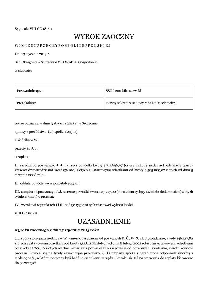 Sygn. akt VIII GC 181/11 WYROK ZAOCZNY WIMIENIURZECZYPOSPOLITEJPOLSKIEJ Dnia 3 stycznia 2013 r. Sąd Okręgowy w Szczecinie VIII Wydział Gospodarczy w składzie: Przewodniczący: SSO Leon Miroszewski Protokolant: starszy sekretarz sądowy Monika Mackiewicz po rozpoznaniu w dniu 3 stycznia 2013 r. w Szczecinie sprawy z powództwa (...) spółki akcyjnej z siedzibą w W. przeciwko J. J. o zapłatę I. zasądza od pozwanego J. J. na rzecz powódki kwotę 4.711.696,97 (cztery miliony siedemset jedenaście tysięcy sześćset dziewięćdziesiąt sześć 97/100) złotych z ustawowymi odsetkami od kwoty 4.565.869,87 złotych od dnia 5 sierpnia 2008 roku; II. oddala powództwo w pozostałej części; III. zasądza od pozwanego J. J. na rzecz powódki kwotę 107.217,00 (sto siedem tysięcy dwieście siedemnaście) złotych tytułem kosztów procesu; IV. wyrokowi w punktach I i III nadaje rygor natychmiastowej wykonalności. VIII GC 181/11 UZASADNIENIE wyroku zaocznego z dnia 3 stycznia 2013 roku (...) spółka akcyjna z siedzibą w W. wniósł o zasądzenie od pozwanych K. Ć., W. S. i J. J., solidarnie, kwoty 146.517,82 złotych z ustawowymi odsetkami od kwoty 132.811,72 złotych od dnia 8 lutego 2002 roku oraz ustawowymi odsetkami od kwoty 13.706,10 złotych od dnia wniesienia pozwu oraz o zasądzenie od pozwanych, solidarnie, zwrotu kosztów procesu. Powołał się na tytuły egzekucyjne przeciwko (...) Company spółka z ograniczoną odpowiedzialnością z siedzibą w S., w której pozwany byli bądź są członkami zarządu. Powołał się też na wezwania do zapłaty kierowane do pozwanych. Pozwany J. J. nie odpowiedział na pozew doręczony mu w dniu 18 października 2012 roku. Termin udzielenia odpowiedzi na pozew upłynął w dniu 2 listopada 2012 roku. Sąd zważył, co następuje: Zgodnie z art. 47919 § 2 k.p.c., w brzmieniu sprzed dnia 3 maja 2012 roku, a obowiązującym dla niniejszego postępowania z mocy art. 9 ust. 1 ustawy z dnia 16 września 2011 roku o zmianie ustawy – Kodeks postępowania cywilnego oraz niektórych innych ustaw, sąd może wydać wyrok zaoczny, również na posiedzeniu niejawnym, gdy pozwany nie złożył odpowiedzi na pozew. Z kolei na podstawie art. 339 § 2 k.p.c. przy wydawaniu wyroku zaocznego przyjmuje się za prawdziwe twierdzenia powoda o okolicznościach faktycznych przytoczonych w pozwie lub w pismach procesowych doręczonych pozwanemu przed rozprawą, chyba że budzą one uzasadnione wątpliwości lub zostały przytoczone w celu obejścia prawa. W świetle powołanej regulacji zaistniały w niniejszym postępowaniu przesłanki do wydania wyroku zaocznego wobec pozwanego J. J. przy przyjęciu za prawdziwe twierdzeń o okolicznościach faktycznych przytoczonych w pozwie. Nie było podstaw do uznania, że okoliczności te budzą wątpliwości lub zostały przytoczone w celu obejścia prawa. Wskazana procedura rozstrzygania sprawy wyrokiem zaocznym zakłada, że sąd nie prowadzi postępowania dowodowego. To nie oznacza, że sąd wydający wyrok zaoczny jest związany oceną prawną powoda w sprawie podstawy prawnej roszczenia dochodzonego w pozwie i jego wysokości. Sąd ten ma więc obowiązek dokonać kwalifikacji prawnej roszczenia i wskazać podstawę prawną rozstrzygnięcia. W tym względzie należy stwierdzić, że w świetle przeważającego obecnie stanowiska odpowiedzialność członków zarządu spółki z ograniczoną odpowiedzialnością na podstawie art. 299 § 1 k.s.h. jest odpowiedzialnością odszkodowawczą (zob. zwłaszcza uchwałę składu 7 sędziów Sądu Najwyższego z dnia 7 listopada 2008 roku, III CZP 72/08). Jedną z konsekwencji tej kwalifikacji jest to, że rozstrzygając o odpowiedzialności członka zarządu w procesie sądowym należy brać pod uwagę wysokość szkody polegającej na obniżeniu potencjału majątkowego dłużnej spółki na skutek niezgłoszenia w odpowiednim czasie przez pozwanego członka zarządu wniosku o ogłoszenie jej upadłości, w granicach wskazanych przez wierzyciela spółki w pozwie przeciwko jej członkom zarządu. Szkoda może obejmować odsetki określone tytułem egzekucyjnym wydanym przeciwko spółce, natomiast nie będzie żądaniem naprawienia szkody roszczenie o odsetki wskazane nie jako składnik długu lecz jako świadczenie uboczne za opóźnienie, obok długu. W takiej sytuacji wymagalność odsetek należy ustalić zgodnie z art. 455 k.c. (por. wyrok Sądu Najwyższego z dnia 21 lutego 2002 roku, IV CKN 793/00). Powód wskazał w pozwie szkodę (dług pozwanych) obejmującą należność główną i koszty procesu zasądzone tytułami egzekucyjnymi w postaci wyroku Sądu Okręgowego w Warszawie z dni 8 lutego 2007 roku w sprawie XX GC 1511/03 oraz nakazu zapłaty tego Sądu z dnia 10 czerwca 2005 roku w sprawie XX GNc 451/05 i od kwot należności głównych z tych tytułów egzekucyjnych zażądał odsetek. W ten sposób powód sam zakwalifikował żądanie odsetek od sumy kwot należności głównych zasądzonych od spółki (...) spółka z ograniczoną odpowiedzialnością z siedzibą w S. jako dochodzonych za opóźnienie pozwanych w spełnieniu zobowiązania do naprawienia szkody. Odsetki za to opóźnienie należą się od upływu terminu ustalonego zgodnie z art. 455 k.c. Ponieważ w pozwie wskazano na wniosek o wszczęcie postępowania pojednawczego złożony przeciwko J. J. o zapłatę kwoty w wysokości odpowiadającej żądaniu pozwu, a Sąd Rejonowy w Szczecinie wyznaczył na dzień 5 sierpnia 2008 roku termin posiedzenia pojednawczego, to w świetle art. 481 k.c. w zw. z art. 455 k.c. początek biegu odsetek od kwoty dochodzonej w niniejszym procesie może być liczony najwcześniej od dnia tego dnia. Tym samym nie można było ich żądać w niniejszej sprawie od daty wcześniejszej, albowiem pozwany nie był jeszcze w opóźnieniu ze spełnieniem świadczenia dochodzonego w pozwie tytułem odszkodowania, wyraźnie oznaczonego kwotą roszczenia przedstawione