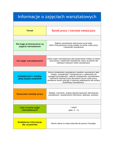 Informacje o zajęciach warsztatowych Temat Rynek pracy i warsztat edukacyjny Dla kogo przeznaczone są zajęcia warsztatowe Zajęcia warsztatowe skierowane są do osób, które chcą poszerzyć swoją wiedzę na temat rynku pracy i możliwości kształcenia. Cel zajęć warsztatowych Celem zajęć warsztatowych jest poszerzenie wiedzy na temat rynku pracy i możliwości kształcenia, które są istotne dla realizacji własnych celów zawodowych. Umiejętności i wiedza, jaką uzyska uczestnik Wzrost świadomości posiadanych zasobów rozumianych jako wiedza, umiejętności i kompetencje w odniesieniu do wymagań pracodawców, nabycie umiejętności wyszukiwania informacji istotnych przy poruszaniu się po rynku pracy, określenie swoich potrzeb w zakresie podnoszenia lub zmiany kwalifikacji zawodowych. Stosowane metody pracy Wykład, ćwiczenia, analiza dotychczasowych doświadczeń zawodowych, wyszukiwanie informacji, dyskusja, autotest. Czas trwania zajęć warsztatowych 1 dzień Dodatkowe informacje dla uczestnika godz. 9 – 14 Warto zabrać ze sobą materiały do pisania i kanapkę.