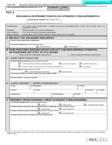 Przejdź na stronę... POLTAX POLA JASNE WYPEŁNIA PODATNIK, POLA CIEMNE WYPEŁNIA ORGAN PODATKOWY. WYPEŁNIĆ NA MASZYNIE, KOMPUTEROWO LUB RĘCZNIE, DUŻYMI, DRUKOWANYMI LITERAMI, CZARNYM LUB NIEBIESKIM KOLOREM. PRZED WYPEŁNIENIEM ZAPOZNAĆ SIĘ Z OBJAŚNIENIAMI. 1. Numer Identyfikacji Podatkowej podatnika wym. w cz. B 2. Nr dokumentu 3. Status └────┴────┴────┴────┴────┴────┴────┴────┴────┴────┴────┴────┴────┘ PCC-3 DEKLARACJA W SPRAWIE PODATKU OD CZYNNOŚCI CYWILNOPRAWNYCH 4. Data dokonania czynności (dzień - miesiąc - rok) └────┴────┘-└────┴────┘-└────┴────┴────┴────┘ Podstawa prawna: Art.10 ustawy z dnia 9 września 2000 r. o podatku od czynności cywilnoprawnych (Dz.U. z 2005 r. Nr 41, poz.399, z późn. zm.), zwanej dalej "ustawą". Składający: Termin składania: Miejsce składania: Podatnicy podatku od czynności cywilnoprawnych. 14 dni od dnia powstania obowiązku podatkowego. Urząd skarbowy, którym kieruje naczelnik, o którym mowa w art.12 i 13 ustawy. A. MIEJSCE I CEL SKŁADANIA DEKLARACJI 5. Nazwa i adres siedziby organu podatkowego 6. Cel złożenia deklaracji (zaznaczyć właściwy kwadrat): q2. korekta deklaracji 1) ? q1. złożenie deklaracji B. DANE PODATNIKA DOKONUJĄCEGO ZAPŁATY LUB ZWOLNIONEGO Z PODATKU NA PODSTAWIE ART.9 PKT 10 LIT.b USTAWY * - dotyczy podatnika niebędącego osobą fizyczną ** - dotyczy podatnika będącego osobą fizyczną B.1. DANE IDENTYFIKACYJNE 7. Podmiot składający deklarację (zaznaczyć właściwy kwadrat): q 1. podmiot zobowiązany solidarnie do zapłaty podatku q 2. strona umowy zamiany q 4. podmiot, o którym mowa w art.9 pkt 10 lit.b ustawy (pożyczkobiorca) 8. Rodzaj podatnika (zaznaczyć właściwy kwadrat): q 1. podatnik niebędący osobą fizyczną 9. Nazwa pełna, REGON* / Nazwisko, pierwsze imię, data urodzenia, PESEL ** q 3. wspólnik spółki cywilnej q 5. inny podmiot q 2. osoba fizyczna 10. Nazwa skrócona* / Imię ojca, imię matki ** B.2. ADRES SIEDZIBY * / ADRES ZAMIESZKANIA ** 11. Kraj 14. Gmina 12. Województwo 13. Powiat 15. Ulica 18. Miejscowość 16. Nr domu 19. Kod pocztowy 17. Nr lokalu 20. Poczta C. PRZEDMIOT OPODATKOWANIA I TREŚĆ CZYNNOŚCI CYWILNOPRAWNEJ 21. Przedmiot opodatkowania (zaznaczyć właściwy kwadrat): q q q q 2. poza terytorium RP q q 2. poza terytorium RP 1. umowa 2. zmiana umowy 22. Miejsce położenia rzeczy lub miejsce wykonywania prawa majątkowego (zaznaczyć właściwy kwadrat): 1. terytorium RP 23. Miejsce dokonania czynności cywilnoprawnej (zaznaczyć właściwy kwadrat): 1. terytorium RP 24. Zwięzłe określenie treści i przedmiotu czynności cywilnoprawnej q 3. orzeczenie sądu lub ugoda 1) Zgodnie z art.81 Ordynacji podatkowej, podatnik może skorygować złożoną deklarację poprzez złożenie deklaracji korygującej wraz z dołączonym pisemnym uzasadniem przyczyn korekty. PCC-3(1) 1/3 Przejdź na stronę... POLTAX POLA JASNE WYPEŁNIA PODATNIK, POLA CIEMNE WYPEŁNIA ORGAN PODATKOWY. WYPEŁNIĆ NA MASZYNIE, KOMPUTEROWO LUB RĘCZNIE, DUŻYMI, DRUKOWANYMI LITERAMI, CZARNYM LUB NIEBIESKIM KOLOREM. PRZED WYPEŁNIENIEM ZAPOZNAĆ SIĘ Z OBJAŚNIENIAMI. D. OBLICZENIE NALEŻNEGO PODATKU OD CZYNNOŚCI CYWILNOPRAWNYCH, Z WYJĄTKIEM UMOWY SPÓŁKI LUB JEJ ZMIANY Rodzaj czynności cywilnoprawnej Podstawa opodatkowania 2) (w tym zmiana umowy, orzeczenie sądu lub ugoda) określona zgodnie z art.6 ustawy (po zaokrągleniu do pełnych złotych) a b ? zł Stawka podatku określona zgodnie z art.7 ustawy Umowa sprzedaży 25. 26. Umowa zamiany 28. 29. Umowa pożyczki lub depozytu nieprawidłowego, w tym zwolniona na podstawie art.9 pkt 10 lit.b ustawy 31. 32. Umowa darowizny w części dotyczącej przejęcia przez obdarowanego długów i ciężarów lub zobowiązań darczyńcy Ustanowienie odpłatnego użytkowania, w tym nieprawidłowego 34. 35. Inna (wymienić jaka): 40. c Obliczony należny podatek od czynności cywilnoprawnej 3) (po zaokrągleniu do pełnych złotych) 27. ? zł d % 30. % 33. % 36. % 37. 39. 38. % 41. Kwota należnego podatku 42. 43. Należy przenieść kwotę obliczonego podatku z kolumny d. E. OBLICZENIE NALEŻNEGO PODATKU OD UMOWY SPÓŁKI / ZMIANY UMOWY SPÓŁKI E.1. OKREŚLENIE PODSTAWY OPODATKOWANIA 44. Podstawa opodatkowania dotyczy (zaznaczyć właściwy kwadrat): q 1. zawarcia umowy spółki q 2. zwiększenia majątku spółki lub podwyższenia kapitału zakładowego q 3. dopłaty q 4. pożyczki udzielonej spółce przez wspólnika lub akcjonariusza q 5. oddania spółce rzeczy lub praw majątkowych do nieodpłatnego używania q 6. przekształcenia, podziału lub łączenia spółek q 7. przeniesienia na terytorium Rzeczypospolitej Polskiej rzeczywistego ośrodka zarządzania spółki kapitałowej lub jej siedziby Podstawa opodatkowania - określona zgodnie z art.6 ust.1 pkt 8 ustawy (po zaokrągleniu do pełnych złotych) 45. Wartość kapitału spółki opodatkowana podatkiem kapitałowym w państwie członkowskim – objęta zwolnieniem określonym w art.9 pkt 11 ustawy 46. zł E.2. ODLICZENIA OD PODSTAWY OPODATKOWANIA - ART.6 UST.9 USTAWY Opłaty i koszty związane z zawarciem umowy spółki lub jej zmiany – na podstawie art.6 ust.9 pkt 1-3 ustawy 47. Wartość wkładów do spółki lub powiększających jej majątek, wartość kapitału zakładowego lub jego podwyższenia, kwoty dopłat, kwoty lub wartość pożyczek udzielonych spółce przez wspólnika (akcjonariusza) oraz wartość rzeczy lub praw majątkowych oddanych spółce do nieodpłatnego używania przez jednostki samorządu terytorialnego lub Skarb Państwa 48. zł, gr zł, gr , , Wartość wkładów do spółki albo kapitału zakładowego, wynikająca z umowy spółki lub jej zmiany, związanej z przekształceniem, podziałem lub łączeniem spółek, która była opodatkowana 
