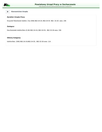 Powiatowy Urząd Pracy w Sochaczewie http://pupsochaczew.pl/strona/kierownictwo-urzedu/223 Kierownictwo Urzędu Dyrektor Urzędu Pracy Krzysztof Wasilewski telefon / fax (046) 862-24-24; 862-24-55 862 -32-26 wew. 236 Zastępca Ewa Budzałek telefon/faks (0 46) 862-24-24; 862-24-55; 862-32-26 wew. 336 Główny księgowy telefon/faks (046) 862-24-24;862-24-55; 862-32-26 wew. 114