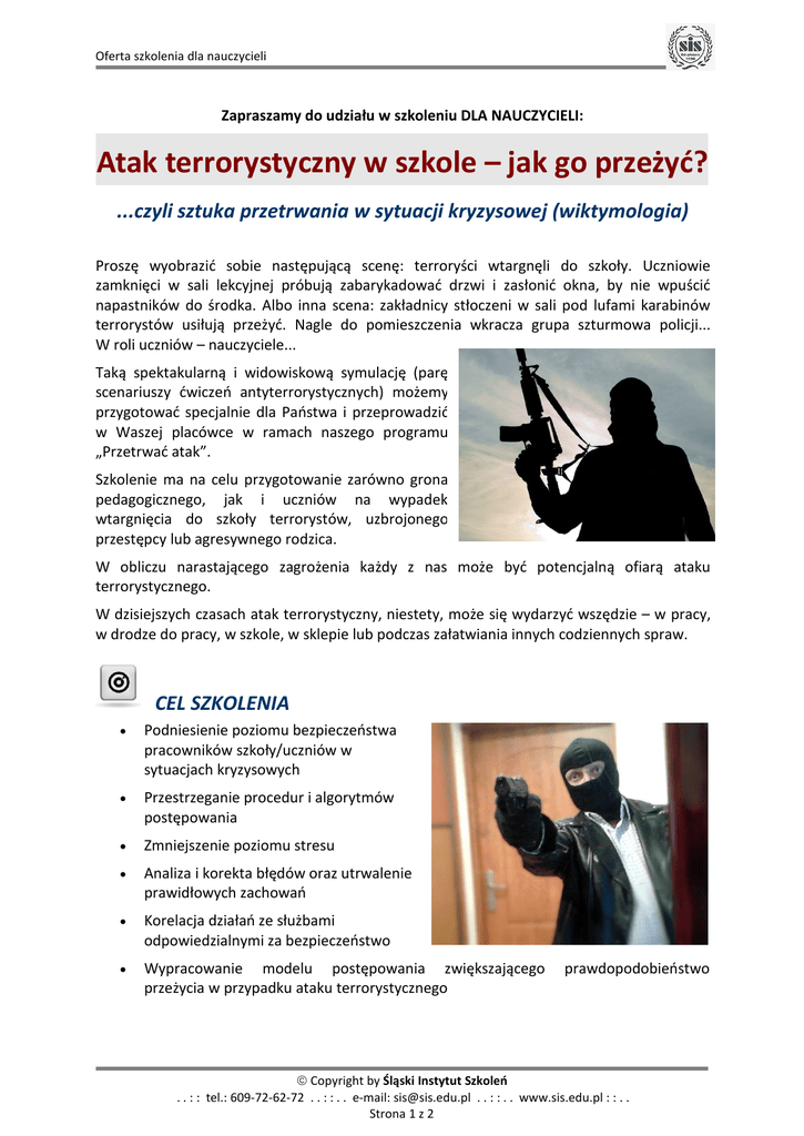 Oferta szkolenia dla nauczycieli Zapraszamy do udziału w szkoleniu DLA NAUCZYCIELI: Atak terrorystyczny w szkole – jak go przeżyć? ...czyli sztuka przetrwania w sytuacji kryzysowej (wiktymologia) Proszę wyobrazić sobie następującą scenę: terroryści wtargnęli do szkoły. Uczniowie zamknięci w sali lekcyjnej próbują zabarykadować drzwi i zasłonić okna, by nie wpuścić napastników do środka. Albo inna scena: zakładnicy stłoczeni w sali pod lufami karabinów terrorystów usiłują przeżyć. Nagle do pomieszczenia wkracza grupa szturmowa policji... W roli uczniów – nauczyciele... Taką spektakularną i widowiskową symulację (parę scenariuszy ćwiczeń antyterrorystycznych) możemy przygotować specjalnie dla Państwa i przeprowadzić w Waszej placówce w ramach naszego programu „Przetrwać atak”. Szkolenie ma na celu przygotowanie zarówno grona pedagogicznego, jak i uczniów na wypadek wtargnięcia do szkoły terrorystów, uzbrojonego przestępcy lub agresywnego rodzica. W obliczu narastającego zagrożenia każdy z nas może być potencjalną ofiarą ataku terrorystycznego. W dzisiejszych czasach atak terrorystyczny, niestety, może się wydarzyć wszędzie – w pracy, w drodze do pracy, w szkole, w sklepie lub podczas załatwiania innych codziennych spraw. CEL SZKOLENIA Podniesienie poziomu bezpieczeństwa pracowników szkoły/uczniów w sytuacjach kryzysowych Przestrzeganie procedur i algorytmów postępowania Zmniejszenie poziomu stresu Analiza i korekta błędów oraz utrwalenie prawidłowych zachowań Korelacja działań ze służbami odpowiedzialnymi za bezpieczeństwo Wypracowanie modelu postępowania zwiększającego przeżycia w przypadku ataku terrorystycznego prawdopodobieństwo Copyright by Śląski Instytut Szkoleń . . : : tel.: 609-72-62-72 . . : : . . e-mail: [email protected] . . : : . . www.sis.edu.pl : : . . Strona 1 z 2 Oferta szkolenia dla nauczycieli PROGRAM SZKOLENIA 1. Terroryzm (teoria), współczesne zagrożenia, najczęściej stosowana broń terrorystów. 2. Postępowanie w przypadku zagrożenia ze strony osoby agresywnej w szkole. 3. Materiał wybuchowy, podejrzany pakunek – model postępowania (powiadomienie służb, ewakacja). 4. Aktywny strzelec, czyli uzbrojona w broń palną agresywna osoba w szkole. 5. Sytuacja zakładnicza. atak terrorystów (zachowanie wobec sprawców, jak przeżyć?) szturm jednostek specjalnych (zachowanie indywidualne, zachowanie zespołu) KADRA PROWADZĄCA – INSTRUKTORZY Posiadają wieloletnie doświadczenie w szkoleniu Policjantów, Strażników Miejskich oraz Służb Ochrony Brali udział w wielu szkoleniach warsztatowych związanych z taktyką i techniką interwencji, walką wręcz, systemami samoobrony, posługiwaniu się bronią palną oraz środkami przymusu bezpośredniego Posiadają szereg uprawnień instruktorskich (państwowych, resortowych oraz wydanych przez odrębne organizacje) związanych z przedmiotową działalnością szkoleniową Ich doświadczenie wynika bezpośrednio ze szkoleń dla policjantów i przebytej służby: odziały antyterrorystyczne, wydziały kryminalne, prewencji oraz logistyki. PROPONOWANE CZAS I MIEJSCE Miejsce: Państwa Placówka (szkoła) Czas trwania szkolenia: około 4 godziny Prosimy o kontakt w celu uzgodnienia szczegółów: telefon: 609-72-62-72 e-mail: [email protected] Wartość szkolenia: Organizacja szkolenia wiąże się z inwestycją 2300 zł. Copyright by Śląski Instytut Szkoleń . . : : tel.: 609-72-62-72 . . : : . . e-mail: [email protected] . . : : . . www.sis.edu.pl : : . . Strona 2 z 2