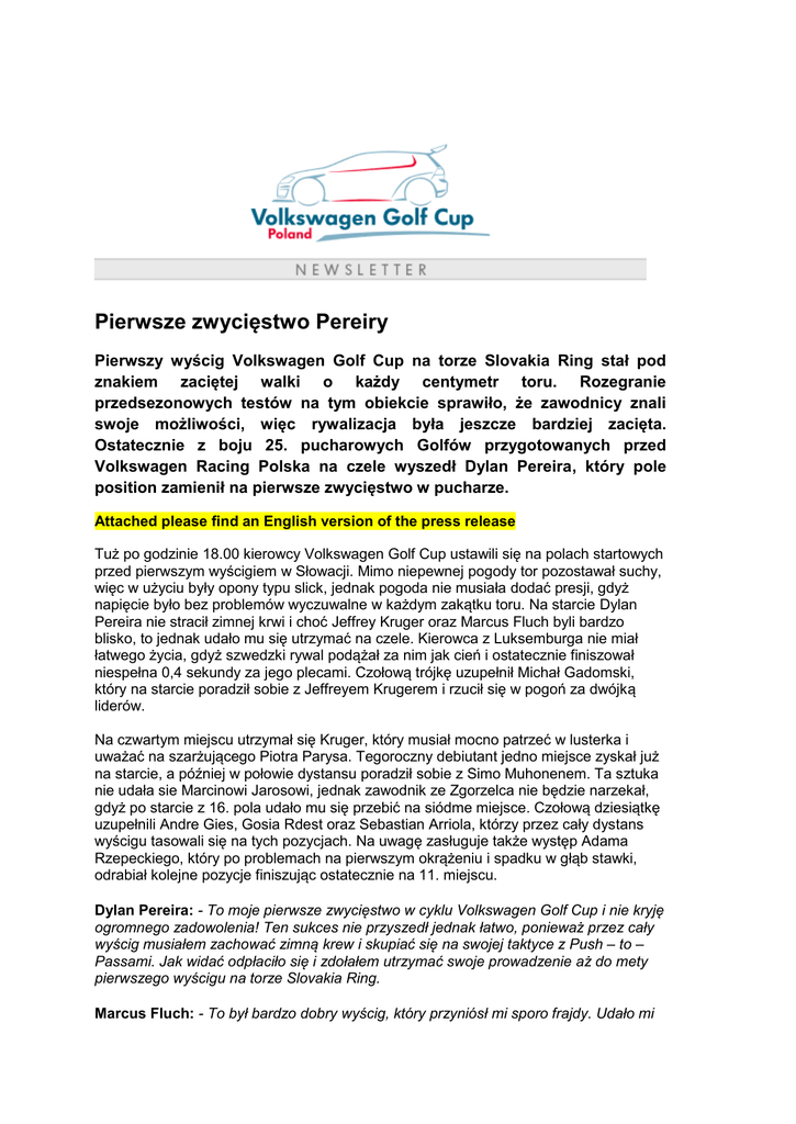 Pierwsze zwycięstwo Pereiry Pierwszy wyścig Volkswagen Golf Cup na torze Slovakia Ring stał pod znakiem zaciętej walki o każdy centymetr toru. Rozegranie przedsezonowych testów na tym obiekcie sprawiło, że zawodnicy znali swoje możliwości, więc rywalizacja była jeszcze bardziej zacięta. Ostatecznie z boju 25. pucharowych Golfów przygotowanych przed Volkswagen Racing Polska na czele wyszedł Dylan Pereira, który pole position zamienił na pierwsze zwycięstwo w pucharze. Attached please find an English version of the press release Tuż po godzinie 18.00 kierowcy Volkswagen Golf Cup ustawili się na polach startowych przed pierwszym wyścigiem w Słowacji. Mimo niepewnej pogody tor pozostawał suchy, więc w użyciu były opony typu slick, jednak pogoda nie musiała dodać presji, gdyż napięcie było bez problemów wyczuwalne w każdym zakątku toru. Na starcie Dylan Pereira nie stracił zimnej krwi i choć Jeffrey Kruger oraz Marcus Fluch byli bardzo blisko, to jednak udało mu się utrzymać na czele. Kierowca z Luksemburga nie miał łatwego życia, gdyż szwedzki rywal podążał za nim jak cień i ostatecznie finiszował niespełna 0,4 sekundy za jego plecami. Czołową trójkę uzupełnił Michał Gadomski, który na starcie poradził sobie z Jeffreyem Krugerem i rzucił się w pogoń za dwójką liderów. Na czwartym miejscu utrzymał się Kruger, który musiał mocno patrzeć w lusterka i uważać na szarżującego Piotra Parysa. Tegoroczny debiutant jedno miejsce zyskał już na starcie, a później w połowie dystansu poradził sobie z Simo Muhonenem. Ta sztuka nie udała sie Marcinowi Jarosowi, jednak zawodnik ze Zgorzelca nie będzie narzekał, gdyż po starcie z 16. pola udało mu się przebić na siódme miejsce. Czołową dziesiątkę uzupełnili Andre Gies, Gosia Rdest oraz Sebastian Arriola, którzy przez cały dystans wyścigu tasowali się na tych pozycjach. Na uwagę zasługuje także występ Adama Rzepeckiego, który po problemach na pierwszym okrążeniu i spadku w głąb stawki, odrabiał kolejne pozycje finiszując ostatecznie na 11. miejscu. Dylan Pereira: - To moje pierwsze zwycięstwo w cyklu Volkswagen Golf Cup i nie kryję ogromnego zadowolenia! Ten sukces nie przyszedł jednak łatwo, ponieważ przez cały wyścig musiałem zachować zimną krew i skupiać się na swojej taktyce z Push – to – Passami. Jak widać odpłaciło się i zdołałem utrzymać swoje prowadzenie aż do mety pierwszego wyścigu na torze Slovakia Ring. Marcus Fluch: - To był bardzo dobry wyścig, który przyniósł mi sporo frajdy. Udało mi się bardzo dobrze wystartować i od tego momentu jechałem na drugim miejscu aż do ujrzenia flagi w szachownicę. Pod koniec delikatnie zbliżyłem się do Dylana, jednak to on zasłużenie dojechał do mety na pierwszym miejscu. Kruger Jeffrey: - To nie był dla mnie najlepszy wyścig, jednak nie mogę narzekać na moją 4. pozycję. Bardzo dobrze wystartowałem, jednak na następnym podjeździe wszyscy użyli Push – to – Passów, a ja nie. Ten błąd kosztował mnie cenne sekundy, ale takie są wyścigi. Pod koniec wyścigu stoczyłem również fajną walkę z Piotrem Parysem o 4. miejsce, które ostatecznie zdołałem obronić. Zdobyłem cenne punkty i zobaczymy, co przyniesie nam jutrzejszy wyścig. To jeszcze nie koniec emocji na Slovakia Ringu, gdyż na zawodników czeka jeszcze jeden wyścig. Pucharowe Golfy ponownie ustawią się na polach startowych w niedzielę o godzinie 14:50, by w bezpośredniej walce rozdzielić kolejne punkty! Pozostałe rundy Volkswagen Golf Cup 2015 19-21 czerwca Slovakia Ring SŁOWACJA 04-05 lipca Lausitzring NIEMCY 29-30 sierpnia Sachsenring NIEMCY 19-20 września Automotodrom Brno CZECHY 02-03 października Tor Poznań POLSKA Lista startowa w sezonie 2015 1. ARRIOLA Sebastian GWATEMALA 2. ARTEMYEV Alexandr KAZACHSTAN 3. DUDEK Jerzy POLSKA 4. EGOROV Artur ROSJA 5. FAHNAUER Manuel NIEMCY 6. FLUCH Marcus SZWECJA 7. GADOMSKI Michał POLSKA 8. GIES Andre NIEMCY 9. HOFFMANN Pascal NIEMCY 10. IBRAGIMOV Ilshat ROSJA 11. JAROS Marcin POLSKA 12. KOTARBA-MAJKUTEWICZ Dominik POLSKA 13. KRAMER Alfred AUSTRIA 14. KRUGER Jeffrey RPA 15. LARSSON Simon SZWECJA 16. METZNER Kevin NIEMCY 17. MUHONEN Simo FINLANDIA 18. PALUSKO Bartosz POLSKA 19. PARYS Piotr POLSKA 20. PEREIRA Dylan LUKSEMBURG 21. RDEST Gosia POLSKA 22. RZEPECKI Adam POLSKA 23. STRZESAK Patryk POLSKA 24. SZCZEŚNIAK Jędrzej POLSKA www.volkswagengolfcup.pl – najświeższe informacje Na stronie internetowej pucharu www.volkswagengolfcup.pl dostępne są informacje dotyczące wszystkich rund, zawodników, torów wyścigowych oraz samochodu. W ciągu weekendu wyścigowego publikowane będą aktualne informacje o przebiegu treningów, kwalifikacji oraz wyścigów. W zakładce „Media” zamieszczane są komunikaty prasowe oraz zdjęcia. Zdjęcia w wysokiej rozdzielczości do pobrania: http://volkswagencastrolcup.pl/index.php/materialy-prasowe/
