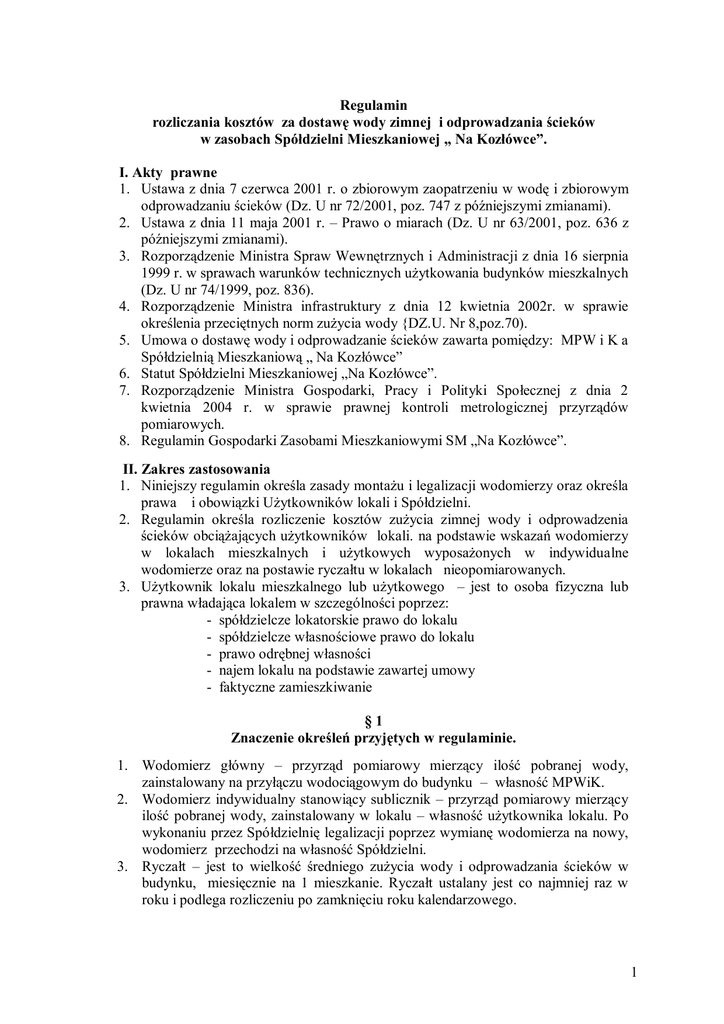 1 Regulamin rozliczania kosztów za dostawę wody zimnej i