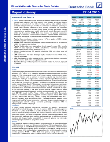 Biuro Maklerskie Deutsche Bank Polska Raport dzienny 27.04.2015 WIADOMOŚCI ZE ŚWIATA Deutsche Bank Polska S.A. Rynki Koniec tygodnia przyniósł wzrosty na giełdach amerykańskich (Nasdaq poprawił swój najwyższy od 15-lat poziom), ceny obligacji wzrosły po słabych danych o zamówieniach na dobra trwałego użytku, które oddaliły widmo podwyżek stóp procentowych. Indeksy w eurolandzie w większości zyskiwały w piątek, ceny obligacji niemieckich lekko wzrosły, ponieważ nie osiągnięto postępu w rozmowach w sprawie Grecji. Ropa naftowa typu Brent zyskała nieznacznie na wartości, ceny metali szlachetnych spadły. Eurodolar wzrósł i zbliżył się do poziomu 1,090. Dziś rano indeksy na giełdach azjatyckich zyskiwały na wartości, w tym mocno w Chinach. Japoński Nikkei nieznacznie tracił przed zbliżającym się posiedzeniem tamtejszego banku centralnego. Indeks Wartość Zmiana Obrót (m ln zł) WIG20 mWIG40 sWIG80 WIG 2 519,20 -0,14% 908,05 3 857,93 0,44% 97,38 13 741,73 0,30% 28,69 56 518,96 Największe wzrosty 0,05% Kurs 1 055,76 Zmiana KONSSTALI 35,60 zł +9.20% SKOTAN 0,73 zł +7.35% INTERCARS Największe spadki 255,00 zł Kurs +5.83% Zmiana CIGAMES 8,53 zł -4.69% KERDOS 1,32 zł -2.94% PZU Najaktywniejsi 475,00 zł Kurs Obrót (m ln zł) Polska: Stopa bezrobocia wyniosła w marcu 11,7%, po spadku z 12,0% miesiąc wcześniej, zgodnie z oczekiwaniami. Polska: Nowe zamówienia w przemyśle wzrosły w marcu +5,9% r/r, po wzroście +0,2% r/r w poprzednim miesiącu. Polska: Wydajność pracy w przemyśle w okresie styczeń-marzec ‘15 r. wzrosła +3,4% r/r przy większym o +1,8% zatrudnieniu i wzroście przeciętnego miesięcznego wynagrodzenia brutto o +3,2% r/r. Niemcy: Indeks instytutu IFO wyniósł w kwietniu 108,6 pkt., nieco lepiej od oczekiwań. USA: Zamówienia na dobra trwałego użytku wzrosły w marcu +4,0% m/m, powyżej oczekiwań. USA: Zamówienia na dobra trwałego użytku z wyłączeniem środków transoprtu spadły w marcu -0,2% m/m, gorzej od oczekiwań. Japonia: Zbiorczy indeks aktywności w przemyśle wzrósł +0,1% m/m, lepiej od oczekiwań. -2.42% PZU 475,00 zł 356,70 KGHM 119,50 zł 158,44 PKNORLEN 66,50 zł Wartość 105,67 Zmiana S&P500 2 117,69 +0,23% DJIA 18 080,14 +0,12% Nasdaq 5 092,09 +0,71% Xetra DAX 11 810,85 +0,74% CAC 40 5 201,45 +0,44% FTSE 100 7 070,70 +0,24% Bovespa 56 594,22 +1,63% Hang Seng 28 560,54 +1,80% Nikkei 19 983,32 -0,20% Shenzhen CSI300 4 789,56 +1,85% Indeksy światowe a POLSKA Giełda Piątkowa sesja przyniosła nieznaczny spadek indeksu WIG20, który na zamknięciu wyniósł 2 519,2 pkt (-0,14%). Głównym winowajcą słabego zakończenia tygodnia okazał się PZU, którego akcje straciły -2,42% choć w trakcie sesji znizkowały nawet -4,50%. W trakcie sesji, w jednym z serwisów pojawiła się niepotwierdzona informacja o możliwym zaangażowaniu naszego największego ubezpieczyciela w akcje nowej emisji Nowej Kompanii Węglowej (planowane podwyższenie kapitału ma wynieść ok. 2 mld PLN) – rynkowi, z oczywistych wzgledów ta informacja się bardzo nie spodobała. Spadki PZU zostały w sporej części zniwelowane, ponieważ rzecznik spółki kategorycznie zdementował pogłoski, aby spółka rozważała kupno akcji NKW (duża zmienność walorów spowodowała, że PZU odnotowało w piątek aż 357 mln PLN obrotów, tj. ok. 40% udział w obrocie indeksu WIG20). Słabe zachowanie ubezpieczyciela popsuło w piątek sentyment wokół firm finansowych– akcje BZ WBK straciły -2,07%, Pekao (-0,9%), a mBanku (-1,82%). Zamknięcie indeksu na minimalnej stracie względem czwartku zapewnił wzrost PKN Orlen (+2,28%) oraz KGHM (+1,70%). Obroty, z uwagi na zamieszanie wokół PZU, skoczyły na całym rynku do 1 056 mln PLN. Początek bieżącego tygodnia może nie przynieść na GPW istonej zmienności – kalendarz danych makro jest pusty, a z najistotniejszych danych należy wymienić publikację wskaźnika PMI w amerykańskim sektorze usługowym. Obligacje W piątek polskie obligacje nieznacznie zyskiwały na wartości, rentowności papierów 5-letnich obniżyły się o -2,8 bps do poziomu 2,081%, natomiast papierów 10-letnich o -1,5 bps do 2,472% (w czwartek dochodowości 10-latek dochodziły do 2,501%). W bieżącym tygodniu brak jest istotnych informacji dotyczących polskiej gospodarki (dopiero w przyszły poniedziałek zostanie opublikowany wskaźnik PMI dla przemysłu), stąd nasz dług powinien zachowywać się w najbliższych dniach podobnie, jak innych krajów europejskich i reagować głównie na informacje odnośnie postępu rozmów ws. przyszłości Grecji. Waluty Złoty osłabił się piątek do głównych walut, w tym najmocniej do brytyjskiego funta (-1,3%). Zarówno do euro, jak i dolara amerykańskiego PLN stracił po około -0,4%. Warto zauważyć, że kurs EUR/PLN powrócił ponad poziom 4,00 i obecnie można oczekiwać wahań na tej parze w okolicy poziomów 4,01-4,06PLN. Z kolei wzrost w kierunku ponad 4,10, możliwy byłby w przypadku próby wybicia kursu Eurodolara powyżej poziomu 1,100 - 1,110. Dziś rano polską walutę rynek wyceniał nastepująco: 4,0406PLN do 1EUR, 3,8942PLN do 1CHF i 3,7152PLN do 1USD. Surowce Cena Zmiana Ropa Brent 65,40 +0,79% Ropa WTI 57,29 -0,35% Złoto 1 179,60 -1,21% Miedź 6 025,50 +1,12% Srebro 15,74 -0,94% Waluty Kurs Zmiana EUR/USD 1,0870 +0,46% EUR/PLN 4,0331 +0,96% USD/PLN 3,7095 +0,49% CHF/PLN 3,8904 +0,60% GBP/PLN 5,6318 +1,32% Rentowności obligacji 10-letnich Zmiana Polska 2.470 -1.20% USA 1.9086 -2.59% Niemcy 0.157 -5.42% Hiszpania 1.388 +1.54% Włochy 1.438 +2.13% Grecja 12.580 +2.64% Turcja 9.410 +4.56% Japonia 0.295 -6.35% Chiny 3.456 +0.35% Indie 7.788 +0.37% WIG W IG (53,885.92, 53,948.38, 53, 546. 29, 53,649.90, -488.441) 56500 56000 55500 55000 54500 54000 53500 53000 52500 52000 51500 51000 50500 50000 49500 49000 48500 48000 47500 47000 46500 46000 45500 45000 44500 44000 43500 43000 42500 42000 2013 May June July August September October N