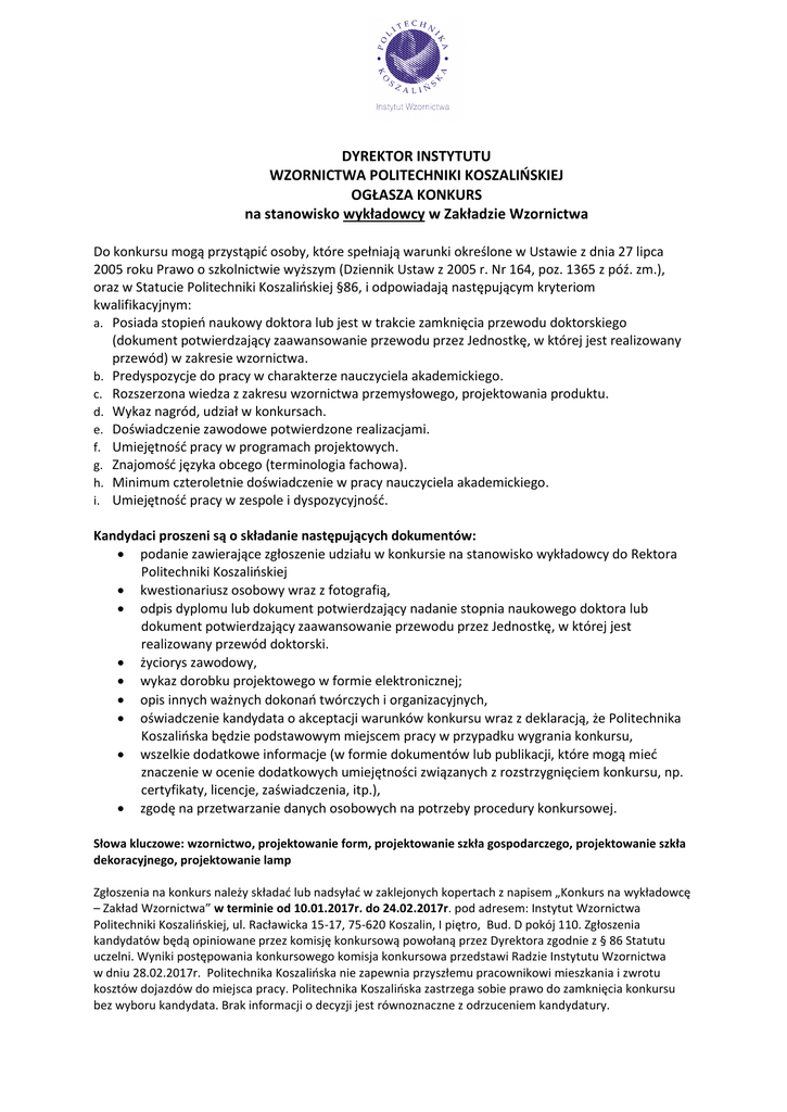 DYREKTOR INSTYTUTU WZORNICTWA POLITECHNIKI KOSZALIŃSKIEJ OGŁASZA KONKURS na stanowisko wykładowcy w Zakładzie Wzornictwa Do konkursu mogą przystąpić osoby, które spełniają warunki określone w Ustawie z dnia 27 lipca 2005 roku Prawo o szkolnictwie wyższym (Dziennik Ustaw z 2005 r. Nr 164, poz. 1365 z póź. zm.), oraz w Statucie Politechniki Koszalińskiej §86, i odpowiadają następującym kryteriom kwalifikacyjnym: a. Posiada stopień naukowy doktora lub jest w trakcie zamknięcia przewodu doktorskiego (dokument potwierdzający zaawansowanie przewodu przez Jednostkę, w której jest realizowany przewód) w zakresie wzornictwa. b. Predyspozycje do pracy w charakterze nauczyciela akademickiego. c. Rozszerzona wiedza z zakresu wzornictwa przemysłowego, projektowania produktu. d. Wykaz nagród, udział w konkursach. e. Doświadczenie zawodowe potwierdzone realizacjami. f. Umiejętność pracy w programach projektowych. g. Znajomość języka obcego (terminologia fachowa). h. Minimum czteroletnie doświadczenie w pracy nauczyciela akademickiego. i. Umiejętność pracy w zespole i dyspozycyjność. Kandydaci proszeni są o składanie następujących dokumentów: podanie zawierające zgłoszenie udziału w konkursie na stanowisko wykładowcy do Rektora Politechniki Koszalińskiej kwestionariusz osobowy wraz z fotografią, odpis dyplomu lub dokument potwierdzający nadanie stopnia naukowego doktora lub dokument potwierdzający zaawansowanie przewodu przez Jednostkę, w której jest realizowany przewód doktorski. życiorys zawodowy, wykaz dorobku projektowego w formie elektronicznej; opis innych ważnych dokonań twórczych i organizacyjnych, oświadczenie kandydata o akceptacji warunków konkursu wraz z deklaracją, że Politechnika Koszalińska będzie podstawowym miejscem pracy w przypadku wygrania konkursu, wszelkie dodatkowe informacje (w formie dokumentów lub publikacji, które mogą mieć znaczenie w ocenie dodatkowych umiejętności związanych z rozstrzygnięciem konkursu, np. certyfikaty, licencje, zaświadczenia, itp.), zgodę na przetwarzanie danych osobowych na potrzeby procedury konkursowej. Słowa kluczowe: wzornictwo, projektowanie form, projektowanie szkła gospodarczego, projektowanie szkła dekoracyjnego, projektowanie lamp Zgłoszenia na konkurs należy składać lub nadsyłać w zaklejonych kopertach z napisem „Konkurs na wykładowcę – Zakład Wzornictwa” w terminie od 10.01.2017r. do 24.02.2017r. pod adresem: Instytut Wzornictwa Politechniki Koszalińskiej, ul. Racławicka 15-17, 75-620 Koszalin, I piętro, Bud. D pokój 110. Zgłoszenia kandydatów będą opiniowane przez komisję konkursową powołaną przez Dyrektora zgodnie z § 86 Statutu uczelni. Wyniki postępowania konkursowego komisja konkursowa przedstawi Radzie Instytutu Wzornictwa w dniu 28.02.2017r. Politechnika Koszalińska nie zapewnia przyszłemu pracownikowi mieszkania i zwrotu kosztów dojazdów do miejsca pracy. Politechnika Koszalińska zastrzega sobie prawo do zamknięcia konkursu bez wyboru kandydata. Brak informacji o decyzji jest równoznaczne z odrzuceniem kandydatury.