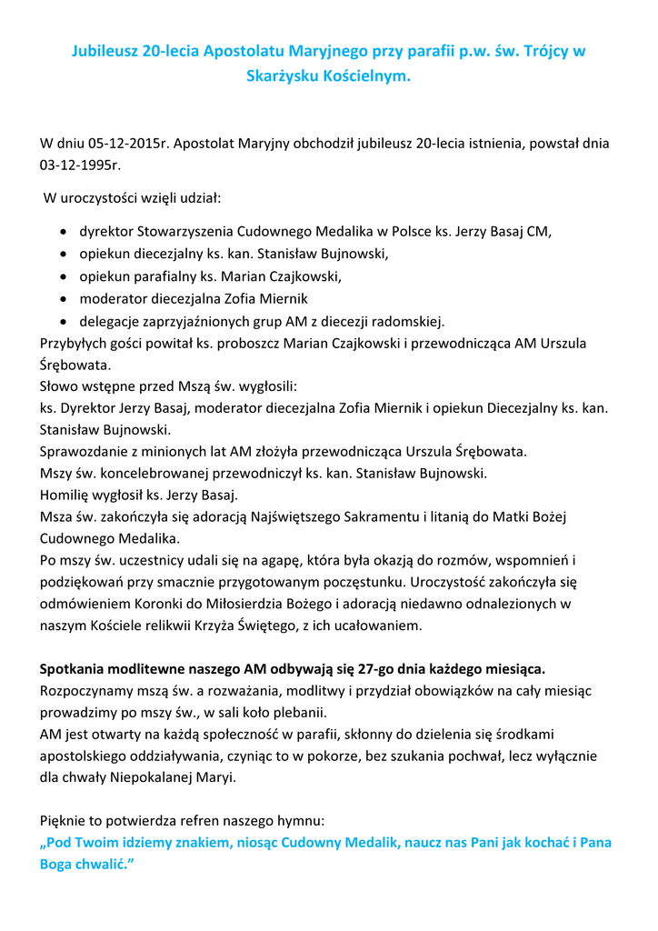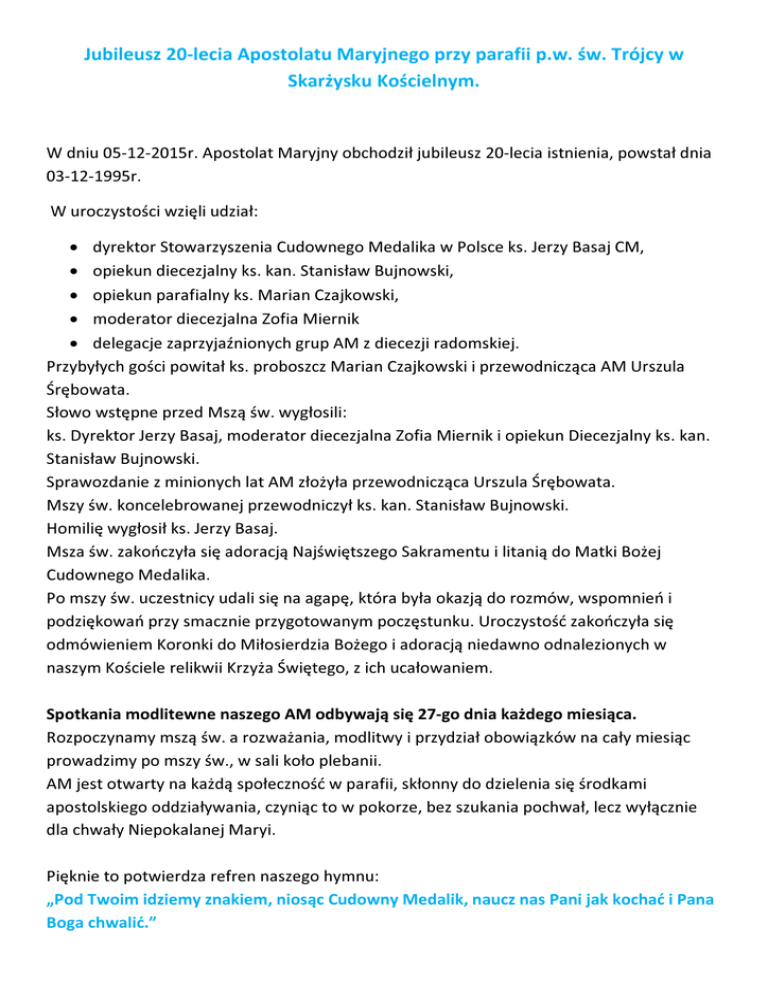 Jubileusz 20-lecia Apostolatu Maryjnego przy parafii p.w. św. Trójcy w Skarżysku Kościelnym. W dniu 05-12-2015r. Apostolat Maryjny obchodził jubileusz 20-lecia istnienia, powstał dnia 03-12-1995r. W uroczystości wzięli udział: • dyrektor Stowarzyszenia Cudownego Medalika w Polsce ks. Jerzy Basaj CM, • opiekun diecezjalny ks. kan. Stanisław Bujnowski, • opiekun parafialny ks. Marian Czajkowski, • moderator diecezjalna Zofia Miernik • delegacje zaprzyjaźnionych grup AM z diecezji radomskiej. Przybyłych gości powitał ks. proboszcz Marian Czajkowski i przewodnicząca AM Urszula Śrębowata. Słowo wstępne przed Mszą św. wygłosili: ks. Dyrektor Jerzy Basaj, moderator diecezjalna Zofia Miernik i opiekun Diecezjalny ks. kan. Stanisław Bujnowski. Sprawozdanie z minionych lat AM złożyła przewodnicząca Urszula Śrębowata. Mszy św. koncelebrowanej przewodniczył ks. kan. Stanisław Bujnowski. Homilię wygłosił ks. Jerzy Basaj. Msza św. zakończyła się adoracją Najświętszego Sakramentu i litanią do Matki Bożej Cudownego Medalika. Po mszy św. uczestnicy udali się na agapę, która była okazją do rozmów, wspomnień i podziękowań przy smacznie przygotowanym poczęstunku. Uroczystość zakończyła się odmówieniem Koronki do Miłosierdzia Bożego i adoracją niedawno odnalezionych w naszym Kościele relikwii Krzyża Świętego, z ich ucałowaniem. Spotkania modlitewne naszego AM odbywają się 27-go dnia każdego miesiąca. Rozpoczynamy mszą św. a rozważania, modlitwy i przydział obowiązków na cały miesiąc prowadzimy po mszy św., w sali koło plebanii. AM jest otwarty na każdą społeczność w parafii, skłonny do dzielenia się środkami apostolskiego oddziaływania, czyniąc to w pokorze, bez szukania pochwał, lecz wyłącznie dla chwały Niepokalanej Maryi. Pięknie to potwierdza refren naszego hymnu: „Pod Twoim idziemy znakiem, niosąc Cudowny Medalik, naucz nas Pani jak kochać i Pana Boga chwalić.” Zachęcamy do wstępowania i uczestniczenia w pracach Apostolatu. Wszystko z Niepokalaną! Przewodnicząca AM. Urszula Śrębowata