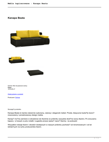Meble tapicerowane : Kanapa Beata Kanapa Beata Ocena: Nie ma jeszcze oceny Cena 1575,00 z? Zadaj pytanie o produkt Producent: Dolmar Szczegó?y produktu Kanapa Beata to bardzo starannie wykonany, stylowy i elegancki mebel. Proste, klasyczne kszta?ty tworz? nowoczesny i ponadczasowy design mebla. Kanap? mo?na zamówic w ekoskórze lub tkaninie (w próbniku wszyskie dost?ne wzory tkanin). Po wrzuceniu kapany w koszyk w polu notatki i sugestie prosze wpisa? nazw? tkaniny na poduszki Wszystkie rodzaje tkanin i ekoskór dostepnych w naszym próbniku pochodz? od renomowanych i od lat istniej?cych na rynku producentów tkanin. 1 / 2 Meble tapicerowane : Kanapa Beata Zale?y nam by klient przez d?ugi czas cieszy? sie pi?knym wygl?dem, komfortem u?ytkowania i przede wszystkim wytrzyma?o?ci? produktu zamówionego w naszym sklepie. Opis produktu: - funkcja spania - pojemnik na po?ciel - wykonana na spr??ynie bonelowej i falistej - ty? kanapy obity ?adnym materia?em - wolnostoj?ca - posiada automat wspomagaj?cy rozk?adanie WYMIARY Wysoko??: 91cm Szeroko??: 212cm G??boko??: 102cm Pow. spania: 212x148cm Tkaniny do wyboru z trzech grup cenowych: I GRUPA : cena pocz?tkowa (wiekszos? tkanin ) II Grupa : ORION + VIENA+ INFINITY, PORTO - dop?ata 10% III Grupa: Astoria dop?ata 15% PO WRZUCENIU PRODUKTU W KOSZYK W POLU NOTATKI I SUGESTIE PROSZE WPISA? DOK?ADN? NAZW? WYBRANEJ TKANINY NA KANAP? I PODUSZKI Opinie Nikt jeszcze nie ocenia? tego produktu. 2 / 2 Powered by TCPDF (www.tcpdf.org)