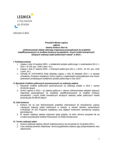 OKS.524.2.2.2014 Prezydent Miasta Legnicy ogłasza otwarty konkurs ofert na „Dofinansowanie wkładu własnego organizacji pozarządowych do projektów współfinansowanych ze środków funduszy europejskich i innych źródeł zewnętrznych służących realizacji zadań publicznych miasta” w 2014 r. I. Podstawa prawna 1. Ustawa z dnia 24 kwietnia 2003 r. o działalności pożytku publicznego i o wolontariacie (Dz.U. z 2010 r. Nr 234, poz. 1536 z późn. zm.). 2. Ustawa z dnia 27 sierpnia 2009 r. o finansach publicznych (Dz.U. z 2010 r. Nr 157, poz. 1240 z późn. zm.). 3. Uchwała Nr XXXIX/400/13 Rady Miejskiej Legnicy z dnia 25 listopada 2013 r. w sprawie uchwalenia „Programu współpracy Gminy Legnica z organizacjami pozarządowymi oraz innymi podmiotami prowadzącymi działalność pożytku publicznego w roku 2014”. II. Wysokość środków publicznych przeznaczonych na realizację zadania 1. Wysokość środków publicznych przeznaczonych na realizację działań w 2014 r. wynosi 20.000,00 złotych. 2. Gmina Legnica w 2013 r. na zadania publiczne z zakresu dofinansowania wkładów własnych organizacji pozarządowych do projektów współfinansowanych ze środków funduszy europejskich i innych źródeł zewnętrznych służących realizacji zadań publicznych miasta przeznaczyła 20.000,00 złotych. III. Cele konkursu 1. Konkurs ma na celu dofinansowanie projektów skierowanych do mieszkańców Legnicy i służących realizacji zadań publicznych w mieście, w ramach dziedzin wymienionych w Rozdziale VII w/w Programu współpracy oraz objętych konkursem zewnętrznej instytucji grantodawczej. 2. W ramach realizacji zadania wspierane będą projekty, na które oferenci pozyskali lub są w trakcie pozyskiwania środków finansowych ze źródeł zewnętrznych. IV. Termin realizacji zadań 1. Konkurs obejmuje zadania, których realizacja kończy się nie później niż 15 grudnia 2014 r. 2. Czas realizacji powinien obejmować: okres przygotowania zadania, jego przeprowadzenie oraz zakończenie. 1 V. Zasady przyznawania dotacji 1. Oferent może otrzymać w 2014 r. tylko jedną dotację na wkład własny. 2. Oferta, która otrzymała dofinansowanie z budżetu Gminy Legnica, nie może być przedmiotem wniosku o dofinansowanie realizacji zadania publicznego na wkład własny. 3. Ta sama oferta nie może być przedmiotem wniosku o dofinansowanie realizacji zadania publicznego: z pominięciem otwartego konkursu ofert zgodnie z art. 19 a ustawy o działalności pożytku publicznego i o wolontariacie oraz zgodnie z art. 12 tej ustawy (Dz.U. z 2010 r. Nr 234, poz.1536 z późn. zm.) 4. Środki pochodzące z dotacji nie mogą być wykorzystane na działalność gospodarczą, polityczną oraz religijną. 5. Wsparcie samorządu nie może przekraczać 50% całkowitej wartości projektu. Z dotacji mogą być pokryte koszty administracyjne (m. in. obsługa projektu, czynsz za wynajem pomieszczeń, koszty mediów), koszty sprzętu i wyposażenia oraz wydatki inwestycyjne do wysokości 10% przyznanej dotacji. 6. Dotacja Gminy Legnica na wkład własny oferenta może wynieść do 100% jego wysokości. 7. Dotacja nie może być wykorzystana na zobowiązania powstałe przed datą podpisania umowy na realizację zadania, a środki przyznane w ramach dotacji muszą być wydatkowane zgodnie z kosztorysem. 8. Oferent zobowiązany jest przedstawić potwierdzoną kopię wniosku o dotację ze środków zewnętrznych. 9. Środki zewnętrzne należy rozumieć jako środki finansowe pochodzące m.in. z funduszy: a) pochodzących z budżetu państwa oraz jednostek samorządu terytorialnego, b) Unii Europejskiej, c) strukturalnych, d) innych państw i organizacji międzynarodowych, e) polskich i zagranicznych organizacji pozarządowych, f) podmiotów komercyjnych. 10. Szczegółowe i ostateczne warunki realizacji, finansowania i rozliczenia zadania regulować będzie umowa zawarta pomiędzy wyłonionym oferentem a Gminą Legnica. 11. W przypadku, gdy oferent nie uzyska dofinansowania ze źródeł zewnętrznych, umowa dotacyjna nie zostanie zawarta. 12. W przypadku, gdy oferent nie otrzymał jeszcze decyzji zewnętrznej instytucji grantodawczej o dofinansowaniu realizacji projektu, dotacja z budżetu Gminy Legnica zostaje przyznana warunkowo. 13. W przypadku, gdy suma wnioskowanych dofinansowań, wynikająca ze złożonych ofert, przekracza wysokość środków przeznaczonych na realizację zadania, organizator konkursu zastrzega sobie możliwość zmniejszenia wysokości dofinansowania. 14. W przypadku odstąpienia od podpisania umowy oferent ma obowiązek pisemnie powiadomić Urząd Miasta Legnicy o swojej decyzji w terminie 7 dni od daty otrzymania informacji o przyznaniu dotacji. 15. W przypadku, gdy kwota przyznanej dotacji jest niższa od określonej w ofercie, oferent może przyjąć zmniejszenie zakresu rzeczowego zadania lub wycofać ofertę. 16. Kontroli podlegają wszystkie dokumenty merytoryczne i finansowe niezbędne do oceny zasadności wykorzystania środków publicznych i realizowania zadania zgodnie z umową dotacyjną. VI. Warunki składania ofert 1. Oferty należy składać wyłącznie na drukach zgodnych z rozporządzeniem Ministra Pracy i Polityki Społecznej z dnia 15 grudnia 2010 r. w sprawie wzoru oferty realizacji zadania publicznego, ramowego wzoru umowy o wykonanie zadania publicznego i wzoru sprawozdania 2 z wykonania tego zadania (Dz. U. z 2011 r. Nr 6, poz. 25). Oferty należy składać w Urzędzie Miasta Legnicy, pok. 208 (II p.) (liczy się data wpływu) lub przesłać pocztą na adres: Urząd Miasta Legnicy, pl. Słowiański 8, 59-220 Legnica (liczy się data wpływu do kancelarii). 2. Oferty należy składać w zamkniętej kopercie, która powinna być opisana (nazwa i adres składającego wniosek oraz nazwa zadania określonego w ogłoszeniu o konkursie). 3. Oferty można składać w kilku terminach: - do 30 kwietnia 2014 r. - do 30 września 2014 r. 4. Jeśli środki finansow
