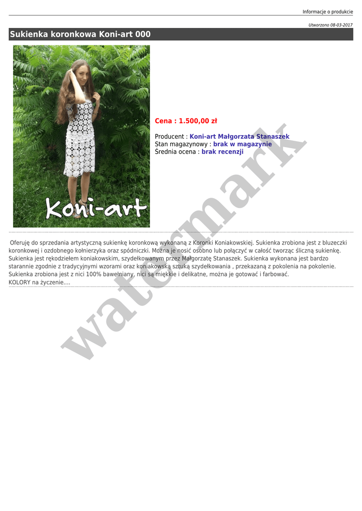 Informacje o produkcie Utworzono 08-03-2017 Sukienka koronkowa Koni-art 000 Cena : 1.500,00 zł er m ar k Producent : Koni-art Małgorzata Stanaszek Stan magazynowy : brak w magazynie Średnia ocena : brak recenzji w at Oferuję do sprzedania artystyczną sukienkę koronkową wykonaną z Koronki Koniakowskiej. Sukienka zrobiona jest z bluzeczki koronkowej i ozdobnego kołnierzyka oraz spódniczki. Można je nosić osobno lub połączyć w całość tworząc śliczną sukienkę. Sukienka jest rękodziełem koniakowskim, szydełkowanym przez Małgorzatę Stanaszek. Sukienka wykonana jest bardzo starannie zgodnie z tradycyjnymi wzorami oraz koniakowską sztuką szydełkowania , przekazaną z pokolenia na pokolenie. Sukienka zrobiona jest z nici 100% bawełniany, nici są miękkie i delikatne, można je gotować i farbować. KOLORY na życzenie....