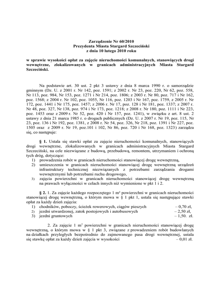 Zarządzenie Nr 60/2010 Prezydenta Miasta Stargard Szczeciński z dnia 10 lutego 2010 roku w sprawie wysokości opłat za zajęcie nieruchomości komunalnych, stanowiących drogi wewnętrzne, zlokalizowanych w granicach administracyjnych Miasta Stargard Szczeciński. Na podstawie art. 30 ust. 2 pkt 3 ustawy z dnia 8 marca 1990 r. o samorządzie gminnym (Dz. U. z 2001 r. Nr 142, poz. 1591; z 2002 r. Nr 23, poz. 220, Nr 62, poz. 558, Nr 113, poz. 984, Nr 153, poz. 1271 i Nr 214, poz. 1806; z 2003 r. Nr 80, poz. 717 i Nr 162, poz. 1568; z 2004 r. Nr 102, poz. 1055, Nr 116, poz. 1203 i Nr 167, poz. 1759, z 2005 r. Nr 172, poz. 1441 i Nr 175, poz. 1457; z 2006 r. Nr 17, poz. 128 i Nr 181, poz. 1337; z 2007 r. Nr 48, poz. 327, Nr 138, poz. 974 i Nr 173, poz. 1218; z 2008 r. Nr 180, poz. 1111 i Nr 223, poz. 1453 oraz z 2009 r. Nr 52, poz. 420 i Nr 157, poz. 1241), w związku z art. 8 ust. 2 ustawy z dnia 21 marca 1985 r. o drogach publicznych (Dz. U. z 2007 r. Nr 19, poz. 115, Nr 23, poz. 136 i Nr 192, poz. 1381, z 2008 r. Nr 54, poz. 326, Nr 218, poz. 1391 i Nr 227, poz. 1505 oraz z 2009 r. Nr 19, poz.101 i 102, Nr 86, poz. 720 i Nr 168, poz. 1323) zarządza się, co następuje: § 1. Ustala się stawki opłat za zajęcie nieruchomości komunalnych, stanowiących drogi wewnętrzne, zlokalizowanych w granicach administracyjnych Miasta Stargard Szczeciński, na cele niezwiązane z budową, przebudową, remontem, utrzymaniem i ochroną tych dróg, dotyczące: 1) prowadzenia robót w granicach nieruchomości stanowiącej drogę wewnętrzną, 2) umieszczenia w granicach nieruchomości stanowiącej drogę wewnętrzną urządzeń infrastruktury technicznej niezwiązanych z potrzebami zarządzania drogami wewnętrznymi lub potrzebami ruchu drogowego, 3) zajęcia powierzchni w granicach nieruchomości stanowiącej drogę wewnętrzną na prawach wyłączności w celach innych niŜ wymienione w pkt 1 i 2. § 2. 1. Za zajęcie kaŜdego rozpoczętego 1 m² powierzchni w granicach nieruchomości stanowiącej drogę wewnętrzną, o którym mowa w § 1 pkt 1, ustala się następujące stawki opłat za kaŜdy dzień zajęcia: 1) chodników, poboczy, ścieŜek rowerowych, ciągów pieszych – 0,70 zł, 2) jezdni utwardzonej, zatok postojowych i autobusowych – 2,50 zł, 3) jezdni gruntowych – 1,50. zł. 2. Za zajęcie 1 m2 powierzchni w granicach nieruchomości stanowiącej drogę wewnętrzną, o którym mowa w § 1 pkt 3, związane z prowadzeniem robót budowlanych na działkach przyległych bezpośrednio do zajmowanego pasa drogi wewnętrznej, ustala – 0,01 zł. się stawkę opłat za kaŜdy dzień zajęcia w wysokości 3. Za zajęcie 1 m2 powierzchni w granicach nieruchomości stanowiącej drogę wewnętrzną, o których mowa w § 1 pkt 3, w innych celach niŜ wymieniono w ust. 2, ustala się stawkę czynszu dzierŜawnego za kaŜdy dzień zajęcia w wysokości – 0,70 zł. 4. Zajęcie powierzchni w granicach nieruchomości stanowiącej drogę wewnętrzną, przez okres krótszy niŜ 24 godziny traktuje się jak zajęcie powierzchni nieruchomości przez 1 dzień. § 3. 1. Ustala się następujące jednorazowe stawki opłat za kaŜdy rozpoczęty 1 m 2 powierzchni w granicach nieruchomości stanowiącej drogę wewnętrzną, która nie podlega zwrotowi w przypadku usunięcia urządzeń z pasa drogowego, zajętej przez rzut poziomy umieszczonych urządzeń wymienionych w § 1 pkt 2: 1) w jezdni – 90,00 zł, 2) poza jezdnią – 60,00 zł, 3) na drogowym obiekcie inŜynierskim – 900,00 zł. § 4 Do ustalonych stawek naleŜy doliczyć 22 % podatek od towarów i usług VAT § 5 Zarządzenie określa wzór zgody Prezydenta Miasta na zajęcie pasa drogi wewnętrznej w celu prowadzenia robót, stanowiący załącznik Nr 1 oraz wzór zgody Prezydenta Miasta na zajęcie pasa drogi wewnętrznej w celu umieszczenia urządzeń, stanowiący załącznik Nr 2 do niniejszego zarządzenia. § 6 Wykonanie zarządzenia powierza się Naczelnikowi Wydziału InŜynierii i Ochrony Środowiska . § 7 Zarządzenie wchodzi w Ŝycie z dniem podpisania i podlega podaniu do publicznej wiadomości poprzez wywieszenie na tablicy ogłoszeń i zamieszczenie na stronach internetowych Urzędu Miejskiego w Stargardzie Szczecińskim. UZASADNIENIE Podjęta przez Radę Miejską w Stargardzie Szczecińskim Uchwała Nr XXII/244/2004 z dnia 31 sierpnia 2004 w sprawie wysokości stawek opłat za zajęcie pasa drogowego dróg gminnych dotyczy dróg publicznych. Do tych dróg stosuje się przepisy ustawy z dnia 21 marca 1985r. o drogach publicznych (tj. Dz .U. z 2007 r. Nr 19, poz. 115 z późn. zm). Zgodnie z art. 8 cytowanej ustawy drogi niezaliczone do Ŝadnej kategorii dróg publicznych (krajowych, wojewódzkich, powiatowych lub gminnych), w szczególności drogi w osiedlach mieszkaniowych, dojazdowe do gruntów rolnych i leśnych, dojazdowe do obiektów uŜytkowanych przez przedsiębiorstwa, są drogami wewnętrznymi. Budowa, przebudowa, remont, utrzymanie, ochrona i oznakowanie dróg wewnętrznych oraz zarządzanie nimi naleŜy do zarządcy terenu, na którym zlokalizowana jest droga, a w przypadku jego braku do właściciela terenu. Wydanie niniejszego zarządzenia umoŜliwi wprowadzenie zasad pobierania opłat za zajęcie wewnętrznych dróg miejskich na cele niezwiązane z gospodarką drogową oraz uporządkuje zasady zajmowania pasa drogowego tych dróg w celu prowadzenia robót i umieszczania urządzeń obcych.