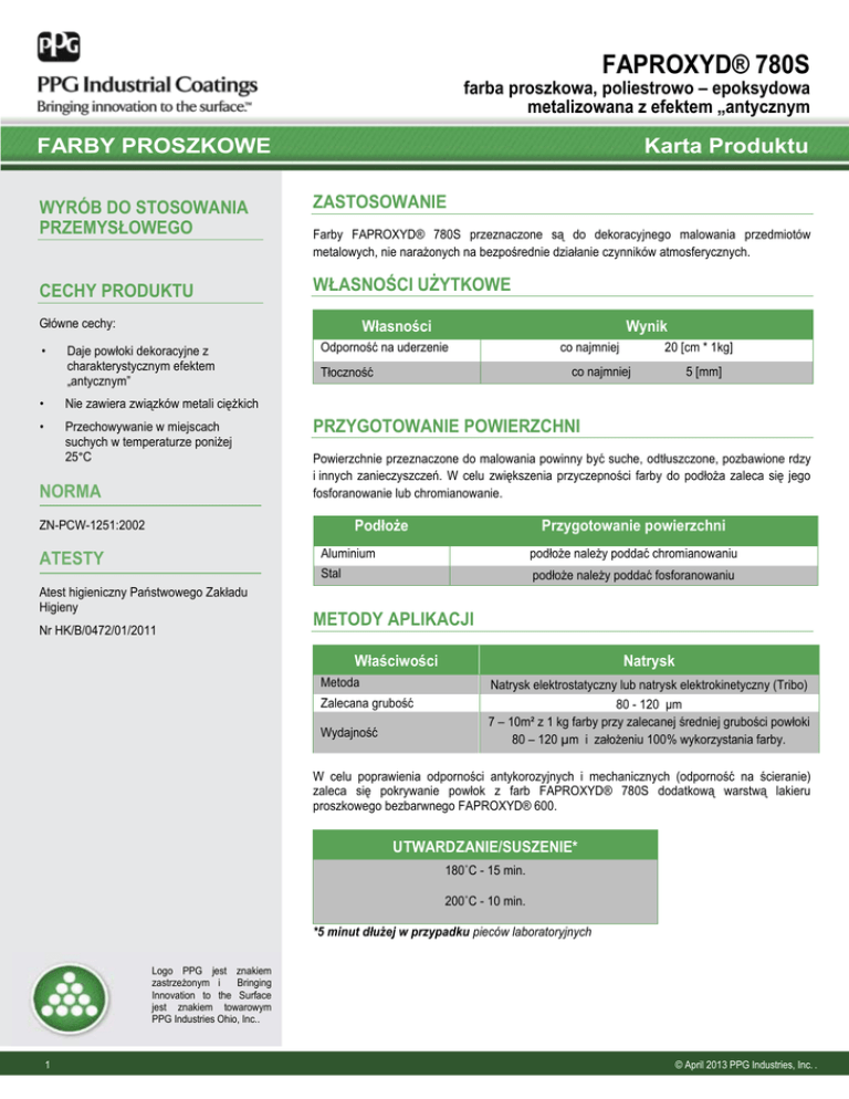 FAPROXYD® 780S farba proszkowa, poliestrowo – epoksydowa metalizowana z efektem „antycznym Karta Produktu FARBY PROSZKOWE WYRÓB DO STOSOWANIA PRZEMYSŁOWEGO ZASTOSOWANIE CECHY PRODUKTU WŁASNOŚCI UŻYTKOWE Farby FAPROXYD® 780S przeznaczone są do dekoracyjnego malowania przedmiotów metalowych, nie narażonych na bezpośrednie działanie czynników atmosferycznych. Główne cechy: • Własności Daje powłoki dekoracyjne z charakterystycznym efektem „antycznym” • Nie zawiera związków metali ciężkich • Przechowywanie w miejscach suchych w temperaturze poniżej 25°C NORMA Wynik Odporność na uderzenie co najmniej co najmniej Tłoczność Powierzchnie przeznaczone do malowania powinny być suche, odtłuszczone, pozbawione rdzy i innych zanieczyszczeń. W celu zwiększenia przyczepności farby do podłoża zaleca się jego fosforanowanie lub chromianowanie. Podłoże Atest higieniczny Państwowego Zakładu Higieny Nr HK/B/0472/01/2011 5 [mm] PRZYGOTOWANIE POWIERZCHNI ZN-PCW-1251:2002 ATESTY 20 [cm * 1kg] Przygotowanie powierzchni Aluminium podłoże należy poddać chromianowaniu Stal podłoże należy poddać fosforanowaniu METODY APLIKACJI Właściwości Natrysk Metoda Natrysk elektrostatyczny lub natrysk elektrokinetyczny (Tribo) Zalecana grubość 80 - 120 μm 7 – 10m² z 1 kg farby przy zalecanej średniej grubości powłoki 80 – 120 µm i założeniu 100% wykorzystania farby. Wydajność W celu poprawienia odporności antykorozyjnych i mechanicznych (odporność na ścieranie) zaleca się pokrywanie powłok z farb FAPROXYD® 780S dodatkową warstwą lakieru proszkowego bezbarwnego FAPROXYD® 600. UTWARDZANIE/SUSZENIE* 180˚C - 15 min. 200˚C - 10 min. *5 minut dłużej w przypadku pieców laboratoryjnych Logo PPG jest znakiem zastrzeżonym i Bringing Innovation to the Surface jest znakiem towarowym PPG Industries Ohio, Inc.. 1 © April 2013 PPG Industries, Inc. . FAPROXYD® 780S farba proszkowa, poliestrowo – epoksydowa metalizowana z efektem „antycznym Karta Produktu FARBY PROSZKOWE INFORMACJE BHP Farby proszkowe stwarzają pewne zagrożenie wybuchowe. Należy więc: • • • • unikać gromadzenia się osadów farby proszkowej poza urządzeniami i pojemnikami, stosować wyłącznie urządzenia elektryczne pyłoszczelne zgodnie z normą PN-79/E-08106, instalować i konserwować uziemienia wszystkich elementów metalowych stykających się z farbą proszkową unoszoną przez powietrze, prowadzić okresowe czyszczenie i badanie izolacji urządzeń napylających (pistoletów), pod kątem narażenia na przebicie elektryczne. Dane techniczne zawarte w niniejszym dokumencie oparte są o informacje uważane przez PPG jako obecnie prawidłowe. Niemniej jednak żadna gwarancja dotycząca dokładności, pełności informacji czy też osiągów nie jest dana ani implikowana. Ciągłe prace nad udoskonalaniem technologii farb powodują, że przyszłe dane techniczne mogą nieco różnić się od tych podawanych w niniejszym dokumencie. Prosimy o kontakt z przedstawicielem PPG w celu uzyskania najbardziej aktualnych informacji. PPG Polifarb Cieszyn S.A. Cieszyn, POLAND Tel: +48 33 851 71 00 Fax: +48 33 852 24 93 PPG Coatings Deutschland GmbH Bochum, GERMANY Tel: +49 234 8690 PPG Industries France S.A Saultain, FRANCE Tel: +33 3 27 14 97 00 Fax: +33 3 27 14 98 94 PPG Industries Italia Spa Quattordio, ITALY Tel: + 39 131 7701 Fax: +39 131 773 753 PPG Industrial Coatings B.V. Veenendaal, NETHERLANDS Tel.: +31 318 567 800 PPG Iberica S.A Rubi (Barcelona), SPAIN Tel: +34 93 586 7429 Fax: +34 93 586 7430 PPG Dr. A. Schoch AG (Ltd.) Burgdof, SWITZERLAND Tel : +41 421 42 42 Fax: +41 421 42 99 PPG Industries (UK) Ltd Birmingham, UK Tel.: +44 121 423 7345 Fax: +44 121 423 7303 PPG Industries Sales, inc Istanbul, TURKEY Tel: +90 212 286 2150 Fax: +90 212 286 21 59 PPG WEB SITES: www.ppg.com & www.ppgindustrialcoatings.com 2 © April 2013 PPG Industries, Inc. .