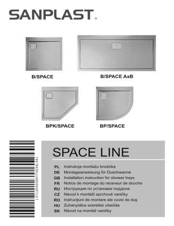 B/SPACE AxB B/SPACE ( 01) 2000000174254( 94) BPK/SPACE BP/SPACE SPACE LINE PL DE GB FR RU CZ RO HU SK Instrukcja montażu brodzika Montageanweisung für Duschwanne Installation instruction for shower trays Notice de montage du receveur de douche Инструкция по установке поддона Návod k montáži sprchové vaničky Instrucţiuni de montare ale cuvei de duş Zuhanytálca szerelési utasítás Návod na montáž vaničky SPACE LINE STANDARD C OPTION A 235 185 A A B 90 2 B/SPACE 80x80x3 B/SPACE 90x90x3 B/SPACE 100x100x3 B/SPACE 70x90x3 B/SPACE 70x100x3 B/SPACE 75x90x3 B/SPACE 80x90x3 B/SPACE 80x100x3 B/SPACE 90x100x3 A B 800 900 1000 900 1000 900 900 1000 1000 800 900 1000 700 700 750 800 800 900 OPTION 30 A-A Prosimy zamawiać osobno Bitte separat bestellen Please order separately Prière de commander séparément Нужно Заказывать Отдельно! Prosíme objednávat zvlášt' Va rog, sa comandati separat Kérjük, külön rendelje meg Prosíme objednávat´ oddelene 30 140 PL DE GB FR RU CZ RO HU SK STS-068 STS-068 STS-068 STS-100 STS-100 STS-068 STS-068 STS-068 STS-068 274 108 A A A B 90 55 55 A B 1200 1200 1400 1500 1600 1700 1800 1100 1200 1300 1400 1500 1600 1700 1800 800 800 800 800 800 800 800 900 900 900 900 900 900 900 900 STS-099 STS-092 STS-092 STS-093 STS-093 STS-093 STS-093 STS-070 STS-070 STS-070 STS-070 STS-071 STS-071 STS-071 STS-071 130 30 30 A-A B/SPACE 70x120x3 B/SPACE 80x120x3 B/SPACE 80x140x3 B/SPACE 80x150x3 B/SPACE 80x160x3 B/SPACE 80x170x3 B/SPACE 80x180x3 B/SPACE 90x110x3 B/SPACE 90x120x3 B/SPACE 90x130x3 B/SPACE 90x140x3 B/SPACE 90x150x3 B/SPACE 90x160x3 B/SPACE 90x170x3 B/SPACE 90x180x3 OPTION 30 140 30 A-A A 108 55 C 235 185 A A 55 55 D BPK/SPACE 90x90x3 BPK/SPACE 100x100x3 A B C D 900 1000 900 1000 450 550 636 636 OPTION A ∅90 STS-069 STS-074 140 30 A-A 30 C A 185 A A B 90 BP/SPACE 80x80x3 BP/SPACE 90x90x3 BP/SPACE 100x100x3 BP-L/SPACE 80x90x3 BP-P./SPACE 80x90x3 A B 800 900 1000 900 900 800 900 1000 800 800 OPTION BP-L/SPACE 235 BP-P/SPACE STS-075 STS-069 STS-074 STS-083 STS-083 3 SPACE LINE A B C 4 A 1– STS- 6 STS- PL 7 STSS AŻA STEL TELL GES TAŻU DES TION MON UNG RUC CJA WEIS INST RUK EAN TION INST TAG ALLA MON INST D FEET 3 GB RUS CZ RO HU SK 2 OPTION OBL-M OBL OBF-M OBF OBC-M OBC P-M OBP OBT-M OBT OBP-M OBP owyrze obud и Schü ns tażu für apro анел mon ng n for on на/п eisu ukcjaanw uctio caissэкра du е Instrtage instr ului n tage новк PL Mon llatio mon уста corp DE Insta e de по krytu ale ия tare ítás táži GB Noticрукц utas monde mon i FR Инст d k elés adu nile szer obkl RU Návoucţiu ény táž CZ Instrpítm mon RO Felé d na HU Návo SK 8 1 20 2 3 Sili kon 55 mm 4 0 ~100 ~10 5 7 on Silik 2 ~1 00 1 II 0 ~10 h I 3 h 8 = 6 OPTION OPTION 5 SPACE LINE ~ 10 B 3 2 3 / 1 2 Sili kon Sili kon on Silik 6 4 5 Sili kon 1 on Silik Sili kon ~ 10 C 8 ~10 0 3 2 3 / 4 1 2 5 7 DE MONTAGE: Zur Beibehaltung der optimalen Parameter, wird es von dem Produzenten empfohlen, die Montage von einem Fachmann durchführen zu lassen. Die aktuelle Übersicht der empfohlenen Servicepunkte finden Sie auf der Internetseite: www.sanplast.pl Es sollte berücksichtigt werden, dass verschiedene Wandtypen, unterschiedliches Befestigungsmaterial erfodern. Dieses Produkt wurde von dem Produzenten mit StandardMontagematerial ausgestattet - Spreizdübel für Wände aus Vollmaterial wie z.B. Beton, Ziegel, Silikaten usw..Falls die Wände aus anderen Materialien gemacht wurden (z.B. Rigipsplatten) müssen andere Dübel bauseits gekauft werden). Das Produkt sollte so montiert werden, damit es auch einfach demontiert werden kann, d.h. auf solche Art und Weise, damit man es im Fall einer Beschädigung demontieren könnte, ohne gleichzeitig den Fliesenbelag zu beschädigen. Die Duschwanne/Badewanne sollte man zum Fliesenbelag zuschieben und abdichten. BETRIEB: Nach jedem Bad sollte die Produktoberfläche mit sauberem, fliessenden Wasser gespült werden. Die Wasserreste sollten mit einem weichen Tuch getrocknet werden (bitte keine Tücher mit kratzenden oder reibenden Elementen verwenden). Bitte zyklisch mit Hilfe von einem weichen Tuch oder Schwamm und Reinigungsmitteln, die ausschließlich für Sanitäracryl geeignet sind reinigen. Bitte keine Reinigungsmittel, die kratzende Elemente beinhalten z.B. Pulver verwenden. Achtung! Während des Bades besonders mit Anwendung von Seife, Schampoo, Badeöl usw. wird die Duschwannen - und Badewannenoberfläche sehr glitschig! KLEINE REPARATUREN: Kratzer (nicht grösser als 0,2mm) beseitigt man durch das Schleifen der Oberfläche mit einem wasserrechten Schleifpapier Nr. 400, und dann mit dem Schleifpapier Nr. 600 und 800. Danach soll man die Oberfläche mit einer Polierpaste polieren, bis zum Erreichen des Glanzes. In der Situation wenn die Acryloberfläche matt wird, soll man sie mit der obergenannten Polierpaste polieren, bis zum Erreichen des Glanzes. Achtung: Der Hersteller behält sich das Recht vor, technische Änderungen und Farbenänderungen in den Produkten einzuführen. GB INSTALLATION: Producer recommends installation by the qualified installer to keep optimal parameters of product. Current list of recommended service points can be found at www.sanplast.pl. It should be remembered that various type of walls need various type of fixing materials. Producer equipped product with standard installation elements - stretchers to the walls made of solid materials - like concrete, brick, silicates, etc. If the walls are made of other materials (for example reinforced plasterboard walls) proper stretchers should be bought within one's capacity. Product should be installed in a way which enables an easy dismantling in case of failure, so that the tiles were not damaged. The Shower tray/bathtub should be sealed and slided to the glaze. EVERYDAY USING: Product surface should be washed out with clean running water after each bathing. Remaining water drops should be removed wi
