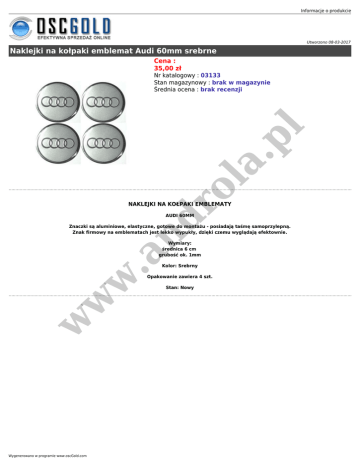 Informacje o produkcie Utworzono 08-03-2017 Naklejki na kołpaki emblemat Audi 60mm srebrne Cena : 35,00 zł ro la .p l Nr katalogowy : 03133 Stan magazynowy : brak w magazynie Średnia ocena : brak recenzji NAKLEJKI NA KOŁPAKI EMBLEMATY nd AUDI 60MM Znaczki są aluminiowe, elastyczne, gotowe do montażu - posiadają taśmę samoprzylepną. Znak firmowy na emblematach jest lekko wypukły, dzięki czemu wyglądają efektownie. w .a Wymiary: średnica 6 cm grubość ok. 1mm Kolor: Srebrny w w Opakowanie zawiera 4 szt. Wygenerowano w programie www.oscGold.com Stan: Nowy