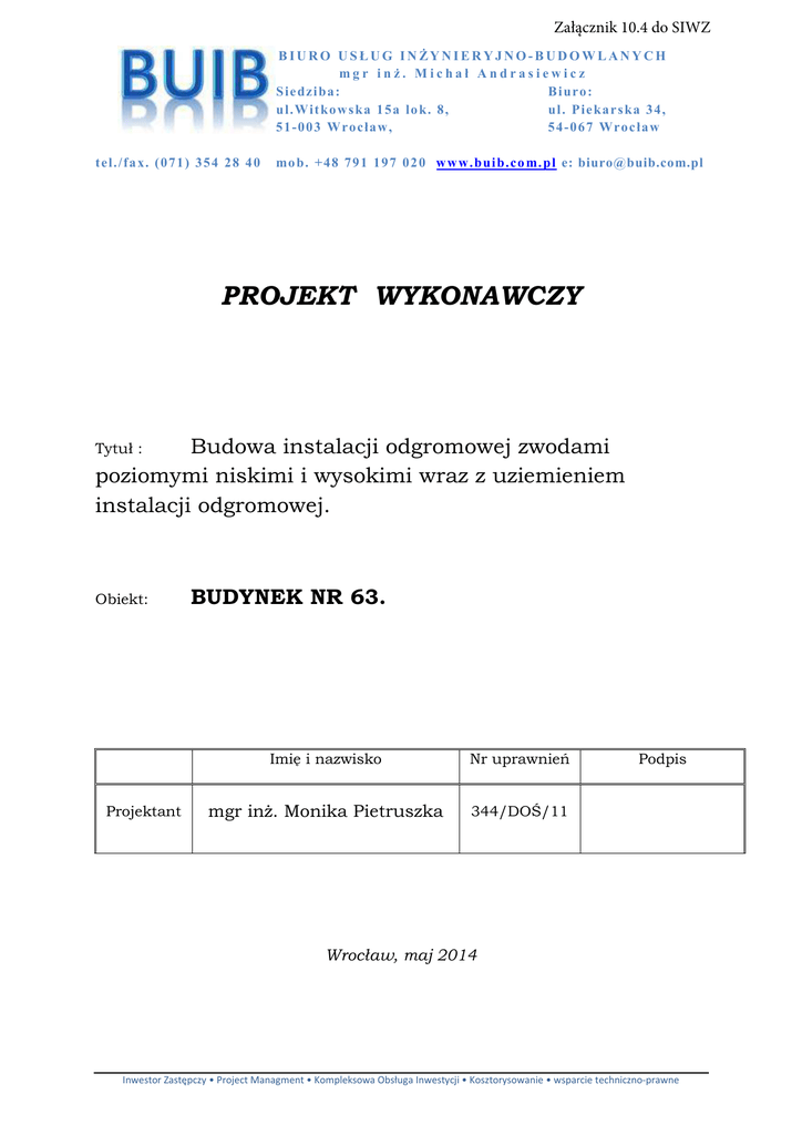 Załącznik 10.4 do SIWZ BIURO USŁUG IN ŻYNIERYJNO-BUDOWLANYCH mgr inż. Michał Andrasiewicz S ie dzi ba : B i uro : u l.W it ko w s ka 1 5 a lo k. 8 , ul. P ie ka r s ka 3 4 , 5 1 - 0 0 3 W ro cła w , 5 4 - 0 6 7 Wro c ła w t el. /f a x. ( 0 7 1 ) 3 5 4 2 8 4 0 mo b. +4 8 7 9 1 1 9 7 0 2 0 w w w .bui b.co m. pl e: [email protected] PROJEKT WYKONAWCZY Budowa instalacji odgromowej zwodami poziomymi niskimi i wysokimi wraz z uziemieniem instalacji odgromowej. Tytuł : Obiekt: Projektant BUDYNEK NR 63. Imię i nazwisko Nr uprawnień mgr inż. Monika Pietruszka 344/DOŚ/11 Podpis Wrocław, maj 2014 Inwestor Zastępczy • Project Managment • Kompleksowa Obsługa Inwestycji • Kosztorysowanie • wsparcie techniczno-prawne SPIS ZAWARTOŚCI PROJEKTU Lp. Tytuł Strona 1. Strona tytułowa 1 2. Spis zawartości projektu 2 3. Spis rysunków 3 4. Opis techniczny 4 5. Obliczenia 5 2 Lp. 1. 2. 3. Nazwa projektu Nr rysunku Budynek nr 63 SPIS RYSUNKÓW 1 Instalacja odgromowa - rzut z góry. 2 Instalacja odgromowa - przekrój podłużny. 3 Instalacja odgromowa - sylwetka słupa. Tytuł 3 OPIS TECHNICZNY do projektu wykonawczego budowy instalacji odgromowej zwodami poziomymi niskimi i wysokimi wraz z uziemieniem instalacji odgromowej. 1. DANE OGÓLNE 1.1 Podstawa opracowania • Umowa nr 178/2014/W z dnia 21.05.2014 r. • Obowiązujące normy i przepisy. • Wytycznych projektowania i utrzymania urządzeń ochrony obiektów wojskowych od wyładowań atmosferycznych. 1.2 Zakres opracowania Przedmiotem opracowania jest projekt instalacji odgromowej zwodów poziomych niskich, instalacji odgromowej zwodów wysokich wraz z uziemieniem instalacji odgromowej na budynku nr 63. 1.3 Podstawowe przepisy i normy • • 2. Wytyczne projektowania i utrzymania urządzeń ochrony obiektów wojskowych od wyładowań atmosferycznych. Obowiązujące normy i przepisy. STAN ISTNIEJĄCY Aktualnie budynek nie posiada ochrony od wyładowań atmosferycznych. 3. ROZWIĄZANIA PROJEKTOWE 3.1 Instalacja zwodów poziomych niskich. POZIOM OCHRONY LPS -II Zwody poziome niskie na dachu należy wykonać drutem stalowym ocynkowanym o przekroju ø 8, mocowany na wspornikach. Wszystkie części metalowe wystające ponad dach budynku należy podłączyć do projektowanej instalacji odgromowej. 3.2 Instalacja zwodów poziomych wysokich . Ochronę odgromową górną należy wykonać za pomocą zwodów wysokich poziomych. Instalację wykonać linką odgromową np. ALDREY 50mm2 (19xø1,8mm) o naciągu 0,14kg/mb. Słup wykonać z trzech rur stalowych o przekroju 1 cal z odciągami. Rury połączyć przez spawanie. Miejsca spawów zabezpieczyć przed korozją. Powierzchnię słupów pokryć farbą antykorozyjną np. HAMMERIITE w technologii DUALTECH. Na rysunku nr 2 pokazano poziome wysokie zwody oraz miejsce usytuowania poszczególnych słupów i odciążek. Każdy przewód odprowadzający należy wyposażyć w złącze kontrolno-pomiarowe. 4 3.2 Uziemienie instalacji odgromowej. Uziomy otokowe instalacji odgromowej zaprojektowano oddzielnie dla ochrony niskiej i wysokiej. Uziomy wykonać z taśmy stalowej ocynkowanej 25x4mm, zakopanej w ziemi na głębokość 0,8m. Taśmę uziomową instalacji niskiej układać w odległości 2m od fundamentów budynku, a instalacji wysokiej w odległości 5m od budynku. Obydwa uziomy otokowe należy łączyć między sobą taśmą stalową ocynkowaną 25x4mm w odległościach nie większych jak 10m. Do uziomu otokowego należy podłączyć konstrukcję stalową słupów, odciążki, ościeżnice, drzwi metalowe, tory kolejowe. Taśmę stalową ocynkowaną łączyć przez spawanie. Miejsca połączeń, zabezpieczyć przed korozją. Rezystancja uziomu nie może przekroczyć 5Ω. Wykonawca zobowiązany jest do wykonania pomiarów rezystancji uziomu. W przypadku nie uzyskania wymaganej rezystancji uziomu należy dodatkowo w narożach budynku zastosować uziomy pionowe. 4. OBLICZENIA 4.1 Obliczenie rezystancji uziomu otokowego. Dopuszczalna rezystancja uziemienia R≤5Ω Rezystancja właściwa gruntu ƍ = 100Ωm Długość taśmy stalowej ocynkowanej L=135m Szerokość taśmy stalowej ocynkowanej d=0,025m Głębokość zakopania h=0,8m ρ 5,53L2 Rt = ln 2πL hd 100 5,53x135 2 ln 2 x3,14 x135 0,8 x0,025 Rt = 1,82Ω Rt = Uwzględniając współczynnik wykorzystania uziomu = 0,7 Rt 1,82 = = 1,3Ω 2 x0,7 1,4 Rtwyp = 1,3Ω p Rdop = 5Ω Rtwyp = Pomimo obliczeń, wykonawca jest zobowiązany do wykonania pomiarów uziemienia. Projektant Monika Pietruszka 5