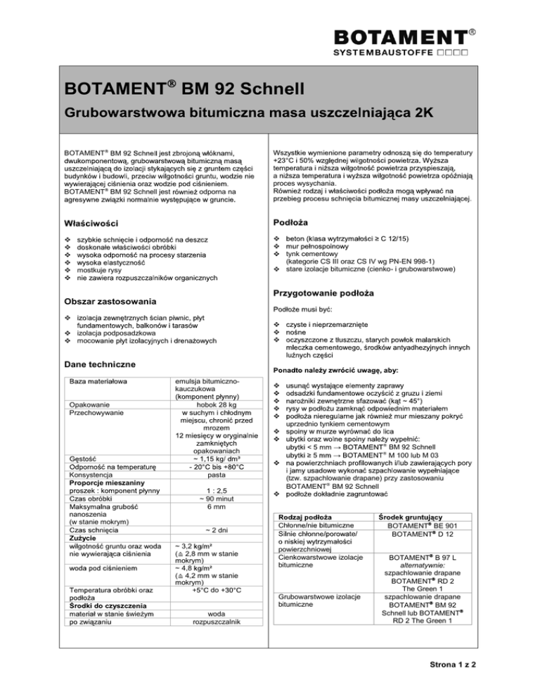 BOTAMENT BM 92 Schnell ury BOTAMENT a proces wysychania. BOTAMENT BM 92 Schnell jest a odporna na tynk cementowy (kategorie CS III oraz CS IV wg PN-EN 998-1) stare izolacje bitumiczne (cienko- i grubowarstwowe) w mostkuje rysy Obszar zastosowania izolacja podposadzkowa moco lu Dane techniczne emulsja bitumicznokauczukowa Opakowanie Przechowywanie hobok 28 kg miej uprzednio tynkiem cementowym mrozem za opakowaniach BM 92 Schnell M 100 lub M 03 ory Konsystencja Proporcje mieszaniny pasta (tzw. szpachlowanie drapane) przy zastosowaniu BOTAMENT BM 92 Schnell 1 : 2,5 ~ 90 minut 6 mm nanoszenia (w stanie mokrym) ~ 2 dni ~ 3,2 ( 2,8 mm w stanie mokrym) ~ 4,8 ( 4,2 mm w stanie mokrym) do enia wie C S te/ powierzchniowej Cienkowarstwowe izolacje bitumiczne Grubowarstwowe izolacje bitumiczne woda rozpuszczalnik BOTAMENT BE 901 BOTAMENT D 12 BOTAMENT B 97 L alternatywnie: szpachlowanie drapane BOTAMENT RD 2 The Green 1 szpachlowanie drapane BOTAMENT BM 92 Schnell lub BOTAMENT RD 2 The Green 1 Strona 1 z 2 BOTAMENT BM 92 Schnell zalecamy zastosowanie zapr BOTAMENT M 34 oraz BOTAMENT MS 30. w mokrej 2,8 mm 2,8 mm 4,2 mm 4,2 mm Izolacja spoin w betonie z zaprawy mineralnej, np. BOTAMENT M 100 lub BOTAMENT czne z BOTAMENT do BM 92 M 34 lub suchej 2,0 mm 2,0 mm 3,0 mm 3,0 mm Podczas wykonywania izolacji budyn wytycznych ITB 408/2010: Warunki Techniczne Wykonania i Odbio i izolacje zeszyt 5: Izolacje przeciwwilgociowe i wodochron . i BOTAMENT BOTAMENT W przypadku przerw robocz BOTAMENT zera. Po do owstanie masa o jednorodnej konsystencji pasty. BOTAMENT i a BM 92 Schnell . i DS 993. kolejnej). BOTAMENT ochrony przed tzw. n BOTAMENT BM 92 Schnell fundamentowej BOTAMENT BOTAMENT BM lub domieszkami. internetowej www.botament.com. W zal a przed zastosow warunkach budowy. ecyficznych mieszania. W przypadku nanoszenia BOTAMENT BM 92 Izolacja spoin pionowych oraz szczelin dylatacyjnych w elementach z betonu zabezpieczonego przed przenikaniem wody (beton wodonieprzepuszczalny) Uwaga: d miejscowego, w zakresie przeznaczenia oraz zastosowania w obiektach budowlanych. W takim wypadku BOTAMENT zklanego. a zasad sztuki budowlanej. Wydanie PL- BOTAMENT www.botament.com - Strona 2 z 2