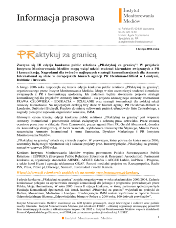 Informacja prasowa ul. Pańska 97; 00-834 Warszawa tel. 22 323 73 10 kontakt: Agata Szybieniecka Specjalista ds. PR [email protected] 6 lutego 2006 roku Zaczyna się III edycja konkursu public relations „PRaktykuj za granicą”! W projekcie Instytutu Monitorowania Mediów mogą wziąć udział studenci kierunków związanych z PR i komunikacją. Nagrodami dla twórców najlepszych strategii komunikacyjnych dla Amnesty International są staże w europejskich biurach agencji PR Fleishman-Hillard w Londynie, Dublinie i Brukseli. 6 lutego 2006 roku rozpoczęła się trzecia edycja konkursu public relations „PRaktykuj za granicą”, organizowanego przez Instytut Monitorowania Mediów. Mogą w nim uczestniczyć studenci kierunków związanych z PR i komunikacją społeczną. Ich zadaniem będzie stworzenie projektu strategii komunikacyjnej dla projektów Amnesty International - dla projektu edukacyjnego Amnesty International PRAWA CZŁOWIEKA - EDUKACJA – DZIAŁANIE oraz strategii komunikacji dla polskiej sekcji Amnesty International. Na najlepszych czekają trzy staże w biurach agencji PR Fleishman-Hillard w Londynie, Dublinie i Brukseli. Przeloty do miejsc odbywania praktyk ufundowały linie Centralwings, a nagrody pieniężne zapewnia organizator konkursu, IMM. Głównym celem trzeciej edycji konkursu public relations „PRaktykuj za granicą” jest wsparcie Amnesty International i promowanie działań związanych z ochroną praw człowieka. Prace zostaną ocenione przez jury w składzie: Piotr Czarnowski, prezes agencji First PR, Gerald Abramczyk, doradca ds. komunikacji strategicznej, dr Jacek Warchala, wykładowca Uniwersytetu Śląskiego, Mirella Panek, rzeczniczka Amnesty International i Anna Sanowska, Dyrektor Marketingu i PR Instytutu Monitorowania Mediów. „PRaktykuj za granicą” składa się z trzech etapów. W pierwszym, który potrwa do końca marca 2006, uczestnicy będą mogli rejestrować się i składać projekty prac. Rozstrzygnięcie „PRaktykuj za granicą” nastąpi w czerwcu 2006 roku. Konkurs Instytutu Monitorowania Mediów wspiera patronatem Polskie Stowarzyszenie Public Relations i EUPRERA (European Public Relations Education & Reasearch Association). Partnerami konkursu są organizacje studenckie AIESEC, AEGEE Gdańsk i AEGEE Lublin, imPRess i Progress, a także hotel Hyatt i agencja reklamowa GRAF. Patroni medialni projektu to: Rzeczpospolita, Radio PiN, Press, PRoto.pl, Dlaczego, Semestr, Eurostudent i wortal Kariera. Więcej informacji o konkursie znajduje się na stronie www.instytut.com.pl/konkurs. I edycja konkursu „PRaktykuj za granicą” została zorganizowana w roku akademickim 2003/2004. Zadanie konkursowe polegało na opracowaniu strategii komunikacji dla jednego z programów prowadzonych przez Polską Akcję Humanitarną. W roku 2005 trwała II edycja konkursu, w której partnerem społecznym była Fundacja Komunikacji Społecznej. Jak dotąd, laureaci „PRaktykuj za granicą” wyjechali na praktyki do Berlina, Monachium, Mediolanu i Londynu. Przedsięwzięcie IMM zostało wyróżnione w raporcie Forum Odpowiedzialnego Biznesu „Odpowiedzialny biznes w Polsce w 2004 roku. 100 dobrych przykładów”. Instytut Monitorowania Mediów monitoruje ok. 600 tytułów prasowych, stacje telewizyjne i radiowe oraz polskie zasoby Internetu. Instytut Monitorowania Mediów jest członkiem FIBEP – elitarnej organizacji zrzeszającej ponad 80 firm monitorujących media z kilkudziesięciu krajów. Od 2002 r. Instytut Monitorowania Mediów wspiera działalność Forum Odpowiedzialnego Biznesu, a od 2004 jest partnerem organizacji studenckiej AIESEC. 1 Sponsorzy konkursu: Partnerzy konkursu: Patroni medialni: 2