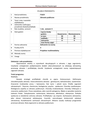 Wyższa Szkoła Fizjoterapii SYLABUS PRZEDMIOTU 1 Kod przedmiotu F10/II 2 Nazwa przedmiotu Zdrowie publiczne 3 5 Tytuł, imię i nazwisko wykładowcy Jednostka realizująca przedmiot (Katedra/Zakład) Rok studiów, semestr I rok, semestr II 6 Ilość godzin 4 7 Forma zaliczenia Łączna liczba godzin: w tym: wykłady : ćwiczenia: inne formy zajęć: Zaliczenie na ocenę 8 Punkty ECTS 3 9 Pomoce dydaktyczne Projektor multimedialny Stacjonarne Niestacjonarne 30 18 30 18 0 0 10 Metody oceny 11 Uwagi Założenie i cele przedmiotu: Opanowanie wiedzy o czynnikach decydujących o zdrowiu i jego zagrożeniu. Uzyskanie umiejętności podejmowania działań ukierunkowanych na edukację zdrowotną, promocję zdrowia i profilaktykę chorób. Uzyskanie umiejętności oceny najważniejszych zagrożeń zdrowia. Treści programu: Wykłady: Rozwój strategii profilaktyki chorób w ujęciu historycznym. Definicyjna charakterystyka zdrowia. Uwarunkowania zdrowia - genetyczne, behawioralne, żywieniowe. Znaczenie środowiska pracy i bytowania. Styl życia i jakość życia. Źródła zagrożeń zdrowotnych - fizyczne, chemiczne, biologiczne, psycho - społeczne. Choroby cywilizacyjne. Ekologiczne aspekty w zdrowiu publicznym. Choroby środowiskowe. Choroby infekcyjne o znaczeniu społecznym. Praca zawodowa, jako czynnik patogenny. Błędy w sposobie żywienia ludności Polski. Toksykomanie: narkomania, lekomania, alkoholizm, nikotynizm. Polityka społeczna w dziedzinie ochrony zdrowia. Profilaktyka i jej stopnie. Zachowania zdrowotne, jako obszar interwencji edukacyjnej. Czynniki, warunkujące skuteczność edukacji zdrowotnej. Kształtowanie zachowań zdrowotnych. Główne zasady realizacji programów promocji zdrowia. Rola ergonomii w zdrowiu publicznym. Wyższa Szkoła Fizjoterapii Ćwiczenia: Zasady oceny środowiska bytowania i pracy. Normatywy higieniczne. Metody badań hałasu, oświetlenia, warunków klimatycznych. Sposoby oceny zagrożeń chemicznych. Badanie jakości wybranych środowisk pracy i bytowania. Metody psychologiczne oceny zagrożeń zdrowotnych. Styl życia i jego składowe. Pośrednie i bezpośrednie metody oceny aktywności ruchowej. Przykładowe sposoby oceny organizacji dnia bytowania. Sposób podejścia w ocenie stresu psycho- społecznego. Ocena warunków zaistnienia procesu epidemicznego choroby zakaźnej. Ocena wartości biologicznej i energetycznej pożywienia. Opracowanie przykładowego programu promocji zdrowia. Literatura: 1) Zdrowie publiczne. Wybrane zagadnienia. Red. J.A.Induski, Z.Jethon, L.T. Dawydzik Oficyna Wydawnicza Instytutu Medycyny Pracy. Łódź 2000 2) Medycyna zapobiegawcza i środowiskowa. Red. Z. Jethon, A. Grzybowski Wyd. 2. PZWL. Warszawa 2000 3) Wychowanie zdrowotne i promocja zdrowia. Red. J.F Kubica. Wyższa Szkoła Ekonomiczna. Warszawa 2004 4) Kulmatycki L. Promocja zdrowia w kulturze fizycznej. Kryteria dobrej praktyki. Wydawnictwo AWF. Wrocław 2003 5) Kuński H. Promowanie zdrowia. Podręcznik dla studentów wychowania fizycznego i zdrowotnego. Wyd. 2 Wydawnictwo Uniwersytetu. Łódź 2000 6) Choroby zawodowe. Red. K. Marek. PZWL. Warszawa 2003 7) Wojnarowska B. Edukacja zdrowotna. Podręcznik akademicki. PWN. Warszawa 2007