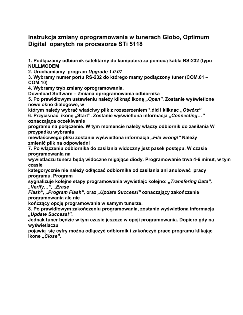 Instrukcja zmiany oprogramowania w tunerach Globo, Optimum Digital oparytch na procesorze STi 5118 1. Podłączamy odbiornik satelitarny do komputera za pomocą kabla RS-232 (typu NULLMODEM 2. Uruchamiamy program Upgrade 1.0.07 3. Wybramy numer portu RS-232 do którego mamy podłączony tuner (COM.01 – COM.10) 4. Wybramy tryb zmiany oprogramowania. Download Software – Zmiana oprogramowania odbiornika 5. Po prawidłowym ustawieniu należy kliknąć ikonę „Open”. Zostanie wyświetlone nowe okno dialogowe, w którym należy wybrać właściwy plik z rozszerzeniem *.dld i kliknac „Otwórz” 6. Przycisnąć ikonę „Start”. Zostanie wyświetlona informacja „Connecting…” oznaczająca oczekiwanie programu na połączenie. W tym momencie należy włączy odbiornik do zasilania W przypadku wybrania niewłaściwego pliku zostanie wyświetlona informacja „File wrong!” Należy zmienić plik na odpowiedni 7. Po włączeniu odbiornika do zasilania widoczny jest pasek postępu. W czasie programowania na wywietlaczu tunera będą widoczne migające diody. Programowanie trwa 4-6 minut, w tym czasie kategorycznie nie należy odłączać odbiornika od zasilania ani anulować pracy programu. Program sygnalizuje kolejne etapy programowania wywietlajc kolejno: „Transfering Data”, „Verify…”, „Erase Flash”, „Program Flash”, oraz „Update Success!” oznaczający zakończenie programowania ale nie kończący opcję programowania w samym tunerze. 8. Po prawidłowym zakończeniu programowania, zostanie wyświetlona informacja „Update Success!”. Jednak tuner będzie w tym czasie jeszcze w opcji programowania. Dopiero gdy na wyświetlaczu pojawią się cyfry można odłączyć odbiornik i zakończyć prace programu klikając ikone „Close”.