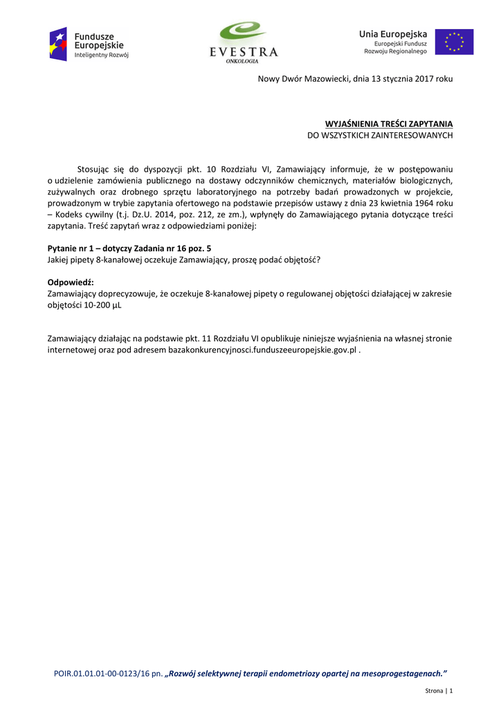 Nowy Dwór Mazowiecki, dnia 13 stycznia 2017 roku WYJAŚNIENIA TREŚCI ZAPYTANIA DO WSZYSTKICH ZAINTERESOWANYCH Stosując się do dyspozycji pkt. 10 Rozdziału VI, Zamawiający informuje, że w postępowaniu o udzielenie zamówienia publicznego na dostawy odczynników chemicznych, materiałów biologicznych, zużywalnych oraz drobnego sprzętu laboratoryjnego na potrzeby badań prowadzonych w projekcie, prowadzonym w trybie zapytania ofertowego na podstawie przepisów ustawy z dnia 23 kwietnia 1964 roku – Kodeks cywilny (t.j. Dz.U. 2014, poz. 212, ze zm.), wpłynęły do Zamawiającego pytania dotyczące treści zapytania. Treść zapytań wraz z odpowiedziami poniżej: Pytanie nr 1 – dotyczy Zadania nr 16 poz. 5 Jakiej pipety 8-kanałowej oczekuje Zamawiający, proszę podać objętość? Odpowiedź: Zamawiający doprecyzowuje, że oczekuje 8-kanałowej pipety o regulowanej objętości działającej w zakresie objętości 10-200 µL Zamawiający działając na podstawie pkt. 11 Rozdziału VI opublikuje niniejsze wyjaśnienia na własnej stronie internetowej oraz pod adresem bazakonkurencyjnosci.funduszeeuropejskie.gov.pl . POIR.01.01.01-00-0123/16 pn. „Rozwój selektywnej terapii endometriozy opartej na mesoprogestagenach.” Strona | 1