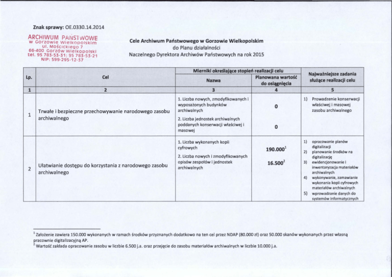 Znak sprawy: OE.0330.14.2014 ARCHIWUM PANSli/VOWE Cele Archiwum Państwowego w Gorzowie Wielkopolskim do Planu działalności Naczelnego Dyrektora Archiwów Państwowych na rok 2015 w Gorzowie Wielkopolskim Ul. MOŚCICkiego 7 66·400 Gorzów Wielkopolski te l. 95 783·53·31; 95 783·53·21 NIP: 599·295·12·37 Lp. Cel 1 2 Mierniki określające stopleń realizacji celu Planowana wartość Nazwa do osl;gnlęcla 4 3 l Trwałe i bezpieczne przechowywanie narodowego zasobu archiwalnych archiwalnego 2. Liczba jednostek archiwalnych poddanych konserwacji właściwej i masowej Ułatwianie dostępu do korzystania z narodowego zasobu 2 2. Liczba nowych i zmodyfikowanych opisów zespołów i jednostek archiwalnych zadania realizacji celu 5 o Prowadzenie konserwacji i masowej zasobu archiwalnego właściwej o l) 1. Liczba wykonanych kopii cyfrowych służące 1) 1. liczba nowych, zmodyfikowanych i wyposażonych budynków Najważniejsze 190.000 1 2) opracowanie planów digitalizacji planowanie środków na digitalizację 16.500 2 3) archiwalnego 4) 5) ewidencjonowanie i inwentaryzacja materiałów archiwalnych wykonywanie, zamawianie wykonania kopii cyfrowych materiałów archiwalnych wprowadzanie danych do systemów informatycznych Założenie zawiera 150.000 wykonanych w ramach środków przyznanych dodatkowo na ten cel przez NDAP (80.000 zł) oraz 50.000 skanów wykonanych przez własną pracownie digitalizacyjną AP. 2 Wartość zakłada opracowanie zasobu w liczbie 6.500 j.a. oraz przejęcie do zasobu materiałów archiwalnych w liczbie 10.000 j.a. 1 Usprawnienie i standaryzacja nadzoru nad narodowym zasobem archiwalnym oraz podniesienie efektywności i 3 1. Liczba opisanych procesów 3 2. Liczba przeprowadzonych kontroli 2 i audytów 1) 2) 3) 4) S) 6) 7) 1) 1. Liczba pracowników uczestniczących w szkoleniach 12 2) Podniesienie kompetencji zawodowych pracowników archiwów państwowych 3) 4) S) 1) 1. Liczba przedsięwzięć popula ryzatorskich Wzbogacenie potencjału intelektualnego i twórczego s określenie możliwości usprawnień jakości zarządzania 4 identyfikacja procesów w AP wybranie i opisanie wybranych procesów analiza stanu zarządzania procesowego 53 2) społeczeństwa 3) w procesach procesowe przygotowanie rocznego planu kontroli i audyty przeprowadzenie kontroli i audytów badanie potrzeb szkoleniowych pracowników w zakresie szkoleń diagnozowanie braków kompetencyjnych pracowników planowanie środków finansowych na szkolenie organizacja szkoleń grupowych kierowanie pracowników na szkolenia indywidualnych zarządzanie planowanie przedsięwzięć popularyzatorskich, w tym wydawniczych realizacja przedsięwzięć popularyzatorskich, w tym wydawniczych monitorowanie przedsięwzięć popularyzatorskich, w tym wydawniczych 3 Wystawa : "Skąd jesteśmy? Zakończenie 11 wojny światowej na północnym obszarze Ziemi Lubuskiej i jego konsekwencje" oraz towarzyszący jej katalog; wydanie 22 nr "Nadwarciańskiego Rocznika Historyczno-Archiwalnego". DYREKTOR Archiwum Państwowego w rzowie Wlkp.