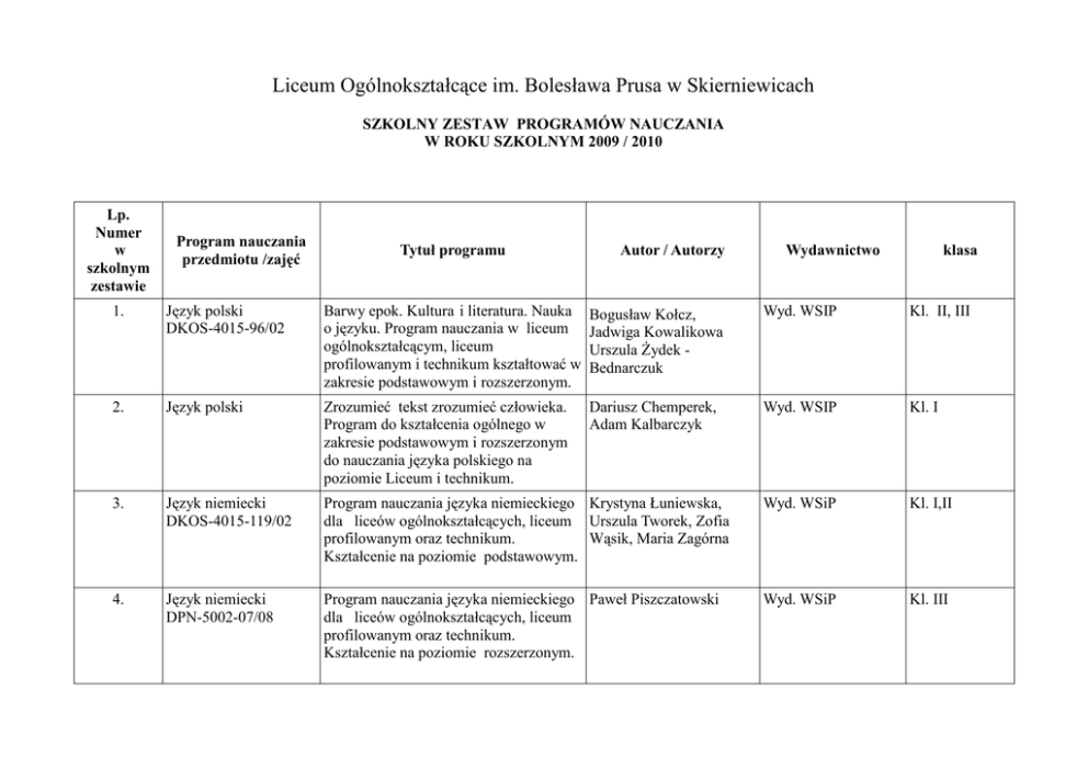 Liceum Ogólnokształcące im. Bolesława Prusa w Skierniewicach SZKOLNY ZESTAW PROGRAMÓW NAUCZANIA W ROKU SZKOLNYM 2009 / 2010 Lp. Numer w szkolnym zestawie Program nauczania przedmiotu /zajęć Tytuł programu Autor / Autorzy Wydawnictwo klasa 1. Język polski DKOS-4015-96/02 Barwy epok. Kultura i literatura. Nauka o języku. Program nauczania w liceum ogólnokształcącym, liceum profilowanym i technikum kształtować w zakresie podstawowym i rozszerzonym. Bogusław Kołcz, Jadwiga Kowalikowa Urszula śydek Bednarczuk Wyd. WSIP Kl. II, III 2. Język polski Zrozumieć tekst zrozumieć człowieka. Program do kształcenia ogólnego w zakresie podstawowym i rozszerzonym do nauczania języka polskiego na poziomie Liceum i technikum. Dariusz Chemperek, Adam Kalbarczyk Wyd. WSIP Kl. I 3. Język niemiecki DKOS-4015-119/02 Program nauczania języka niemieckiego Krystyna Łuniewska, dla liceów ogólnokształcących, liceum Urszula Tworek, Zofia profilowanym oraz technikum. Wąsik, Maria Zagórna Kształcenie na poziomie podstawowym. Wyd. WSiP Kl. I,II 4. Język niemiecki DPN-5002-07/08 Program nauczania języka niemieckiego Paweł Piszczatowski dla liceów ogólnokształcących, liceum profilowanym oraz technikum. Kształcenie na poziomie rozszerzonym. Wyd. WSiP Kl. III 5. Język angielski DKOS-4015-117/02 Pogram nauczania języka angielskiego jako pierwszego języka obcego. Kurs kontynuacyjny dla liceum ogólnokształcącego liceum profilowanego, technikum. IV etap edukacyjny (program A) Joanna Sosnowska, Maria Wyd. OXFORD Małgorzata Wieruszewska UNIVERSITY PRESS Kl. I, II, III 6. Język angielski DKOS-4015-118/02 Pogram nauczania języka angielskiego jako pierwszego języka obcego. Kurs początkowy dla liceum ogólnokształcącego liceum profilowanego, technikum. IV etap edukacyjny (program B) Joanna Sosnowska, Maria Wyd. OXFORD Małgorzata Wieruszewska UNIVERSITY PRESS Kl. I, II, III 7. Język angielski DKOS-5002-47/03 Program nauczania języka angielskiego w Liceum ogólnokształcącym, liceum profilowanym i technikum. Kurs kontynuacyjny (program A) Magdalena Kębłowska Wyd. EGIS Kl. I, II, III 8. Język rosyjski DKOS-4015-24/02 Program nauczania języka rosyjskiego w liceum ogólnokształcącym, liceum profilowanym i technikum. Kurs dla początkujących. Mirosław Zybert, Halina Dąbrowska Wyd. WSiP Kl. I, II, III 9. Język francuski DKOW-5002-35/08 Inter kulturowy i interdyscyplinarny program nauczania języka francuskiego dla liceum ogólnokształcącego, liceum profilowanego i technikum. Kurs podstawowy. GraŜyna Migdalska, Wyd. PWN Kl. I, II, III Wydawnictwo Szkolne ARKA Kl. I, II, III 10. Historia DKOS-4015-111/02 Monika SzczuckaSmagowicz Program nauczania historii w trzyletnim Jacek Budzyński, Marek liceum ogólnokształcącym, Kamiński, profilowanymi technikum. Kształcenie w zakresie podstawowym i rozszerzonym. 11. Wiedza o społeczeństwie DKOS-4015-151/02 Program nauczania Wiedzy o Lech Moryksiewicz, społeczeństwie w liceum Maria Pacholska ogólnokształcącym, liceum profilowanym i technikum Kształcenie w zakresie podstawowym rozszerzonym. Wyd. ARKA Kl. I, II, III 12. Wiedza o społeczeństwie DKOS-5002-4/04 Program nauczania dla liceum ogólnokształcącego(w zakresach podstawowym i rozszerzonym), liceum profilowanym i technikum ( w zakresie podstawowym) Wyd. OPERON Kl. I, II, III 13. Wiedza o kulturze DKOS-5002-76/03 Program nauczania wiedzy o kulturze w Zbigniew Majchrowski, Wydawnictwo liceum ogólnokształcącym, liceum Teresa Marciszuk, STENTOR profilowanym i technikum. Krzysztof Mrowcewicz, Piotr Sitarski, Dorota Szwarcman, opracowanie Zbigniew PłaŜewski Kl. I 14. Matematyka DKOS-4015-99/02 Program nauczania matematyki dla liceum ogólnokształcącego, liceum profilowanego i technikum. Kształcenie ogólne w zakresie podstawowym i rozszerzonym Wyd. NOWA ERA Kl. I, II, III 15. Fizyka DKOS-5002-2/04 Program nauczania fizyki i astronomii w Marian Kozielski zakresie podstawowym i rozszerzonym Wyd. PWN Kl. I, II, III 16. Chemia DKOS-4-015-43/01 Program nauczania dla liceum Stanisława Hejwowska ogólnokształcącego, liceum Ryszard Marcinkowski profilowanego i technikum. Kształcenie w zakresie podstawowym i rozszerzonym. Wyd. Operon Kl. I, II, III Janusz Maleska, Zbigniew Smutek Wojciech Babiański, Katarzyna Hall, Dorota Ponczek 17. Chemia DKOS-4015-33/02 Program nauczania dla liceum Michał Poźniaczek, Zofia Wyd. WSiP ogólnokształcącego, liceum Kluz, Ewa OdrwąŜ profilowanego i technikum. Kształcenie w zakresie podstawowym. Kl. I, II 18. Edukacja ekologiczna DKOS-4-015-138/02 Program nauczania ścieŜki edukacyjnej dla liceum ogólnokształcącego, liceum profilowanego, technikum. Barbara Sobieraj Kl. I, II 19. Edukacja europejska DKOS-5002-14/04/02 Program nauczania dla liceum ogólnokształcącego, liceum profilowanego i technikum. Jarosław Korba, Zbigniew Wyd. Operon Smutek 20. Podstawy przedsiębiorczości DKOS-4-015-165/02 Przedsiębiorczość- klucz do sukcesu dla Agnieszka Mikina liceum ogólnokształcącego, liceum Małgorzata Sienna profilowanego i technikum. Wyd. REA Kl. III 21. Technologia informacyjna DKOS- 5002-99/03 Program nauczania w zakresie podstawowym dla liceum ogólnokształcącego, liceum profilowanego i technikum. GraŜyna Hermanowska , Wyd. Operon Kl. I, II 22. Informatyka DKOS-4015-200/02 Informatyka Kształcenie w zakresie rozszerzonym. Program nauczania dla liceum ogólnokształcącego. E Gurbiel, G. HendtOlejniczak, E Kołaczyk, H Krupicka, M. Sysło Wyd. WSiP Kl I,. II, III 23. Wychowanie fizyczne 4015- 1/00 Program wychowania fizycznego dla szkół ponadgimnazjalnych. Rafał Rapacz, Stanisław Program autorski Sankiewicz, Jakub Jeziorski Kl. I, II, III 24. Wychowanie fizyczne DKW – 4014-88/01 Program wychowania fizycznego dla czterech etapów edukacyjnych „Od zabawy do sportu i rekreacji” Urszula Kierczak, Tadeusz Wyd. WSiP Glos Kl. I, II, III Program autorski Kl. II, III Wojciech Hermanowski 25. Wychowanie do Ŝycia w r