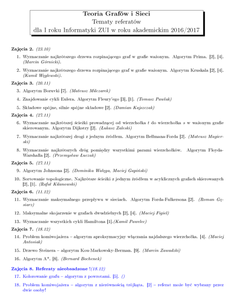 Teoria Grafów i Sieci Tematy referatów dla I roku Informatyki ZUI w roku akademickim 2016/2017 Zaj¦cia 2. (23.10) 1. Wyznaczanie najkrótszego drzewa rozpinaj¡cego graf w grae wa»onym. Algorytm Prima. [2], [4]. (Marcin Górnicki). 2. Wyznaczanie najkrótszego drzewa rozpinaj¡cego graf w grae wa»onym. Algorytm Kruskala [2], [4]. (Kamil W¦glewski). Zaj¦cia 3. (20.11) 3. Algorytm Boruvki [7]. (Mateusz Milczarek) 4. Znajdowanie cykli Eulera. Algorytm Fleury'ego [3], [1]. (Tomasz Pawlak) 5. Skªadowe spójne, silnie spójne skªadowe [2]. (Damian Kajszczak) Zaj¦cia 4. (27.11) 6. Wyznaczanie najkrótszej ±cie»ki prowadz¡cej od wierzchoªka t do wierzchoªka s w wa»onym grae skierowanym. Algorytm Dijkstry [2]. (ukasz Zaleski) 7. Wyznaczanie najkrótszej drogi z jednym ¹ródªem. Algorytm Bellmana-Forda [2]. (Mateusz Magierski) 8. Wyznaczanie najkrótszych dróg pomi¦dzy wszystkimi parami wierzchoªków. Warshalla [2]. (Przemysªaw uczak) Zaj¦cia 5. Algorytm Floyda- (27.11) 9. Algorytm Johnsona [2]. (Dominika Waª¦ga, Maciej Gapi«ski) 10. Sortowanie topologiczne. Najkrótsze ±cie»ki z jednym ¹ródªem w acyklicznych grafach skierowanych [2], [1]. (Rafaª Kilanowski) Zaj¦cia 6. (11.12) 11. Wyznaczanie maksymalnego przepªywu w sieciach. Algorytm Forda-Fulkersona [2]. (Roman G¦siarz) 12. Maksymalne skojarzenie w grafach dwudzielnych [2], [4]. (Maciej Figiel) 13. Wyznaczanie wszystkich cykli Hamiltona [1].(Kamil Pawelec) Zaj¦cia 7. (18.12) 14. Problem komiwoja»era algorytm aproksymacyjny wª¡czania najdalszego wierzchoªka. [4]. (Maciej Antosiak) 15. Drzewo Steinera algorytm Kou-Markowsky-Berman. [9]. (Marcin Zawadzki) 16. Algorytm A*. [8]. (Bernard Bochenek) Zaj¦cia 8. Referaty nieobsadzone !(18.12) 17. Kolorowanie grafu algorytm z powrotami. [5]. () 18. Problem komiwoja»era algorytm z nierówno±ci¡ trójk¡ta. [2] referat mo»e by¢ wybrany przez dwie osoby! Literatura [1] Witold Lipski, Kombinatoryka dla programistów, WNT, Warszawa 1989. [2] Thomas H. Cormen et al, Wprowadzenie do alorytmów, WNT, Warszawa 2001. [3] Kenneth A. Ross, Charles R. B. Wright, Matematyka dyskretna, PWN, Warszawa 1996. [4] Maciej Syslo et al., Algorytmy optymalizacji dyskretnej, PWN, Warszawa 1993. [5] R. Sedgewick, C.J.V. Wyk, Algorytmy w C++: grafy. Wydaw. RM, 2003. [6] Richard Neapolitan, Kumarss Naimipour, Podstawy algorytmów z przykªadami w C++. [7] D. Jungnickel, Graphs; Networks and Algorithms. [8] J. Smed, H. Hakonen, Algorithms and Networking for Computer Games. John Wiley & Sons, 2006. [9] B. Korte, J. Vygen, Combinatorial Optimization. Theory and Algorithms. Springer-Verlag, BerlinHeidelberg. 2002.