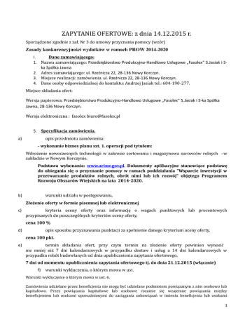 ZAPYTANIE OFERTOWE: z dnia 14.12.2015 r. Sporządzone zgodnie z zał. Nr 3 do umowy przyznania pomocy (wzór) Zasady konkurencyjności wydatków w ramach PROW 2014-2020 I. Dane zamawiającego: 1. Nazwa zamawiającego: Przedsiębiorstwo Produkcyjno-Handlowo Usługowe „Fasolex” S.Jasiak i Ska Spółka Jawna 2. Adres zamawiającego: ul. Rzeźnicza 22, 28-136 Nowy Korczyn. 3. Miejsce realizacji: zamówienia. ul. Rzeźnicza 22, 28-136 Nowy Korczyn. 4. Dane osoby odpowiedzialnej do kontaktu: Andrzej Jasiak tel.: 604-190-277. Miejsce składania ofert: Wersja papierowa: Przedsiębiorstwo Produkcyjno-Handlowo Usługowe „Fasolex” S.Jasiak i S-ka Spółka Jawna, 28-136 Nowy Korczyn. Wersja elektroniczna : fasolex [email protected] 5. Specyfikacja zamówienia. a) opis przedmiotu zamówienia: - wykonanie biznes planu szt. 1. operacji pod tytułem: Wdrożenie nowoczesnych technologii w zakresie sortowania i magazynowa surowców rolnych –w zakładzie w Nowym Korczynie. Podstawa wykonania: www.arimr.gov.pl. Dokumenty aplikacyjne stanowiące podstawę do ubiegania się o przyznanie pomocy w ramach poddziałania "Wsparcie inwestycji w przetwarzanie produktów rolnych, obrót nimi lub ich rozwój" objętego Programem Rozwoju Obszarów Wiejskich na lata 2014-2020. b) warunki udziału w postępowaniu, Złożenie oferty w formie pisemnej lub elektronicznej c) kryteria oceny oferty oraz informację o wagach punktowych lub procentowych przypisanych do poszczególnych kryteriów oceny oferty, cena 100 % d) opis sposobu przyznawania punktacji za spełnienie danego kryterium oceny oferty, cena 100 pkt. e) termin składania ofert, przy czym termin na złożenie oferty powinien wynosić nie mniej niż 7 dni kalendarzowych w przypadku dostaw i usług a 14 dni kalendarzowych w przypadku robót budowlanych od dnia upublicznienia zapytania ofertowego, 7 dni od momentu upublicznienia zapytania ofertowego tj. do dnia 21.12.2015 (włącznie) f) warunki wykluczenia, o którym mowa w ust. Warunki wykluczenie o którym mowa w ust. 6. Zamówienia udzielane przez beneficjenta nie mogą być udzielane podmiotom powiązanym z nim osobowo lub kapitałowo. Przez powiązania kapitałowe lub osobowe rozumie się wzajemne powiązania między beneficjentem lub osobami upoważnionymi do zaciągania zobowiązań w imieniu beneficjenta lub osobami 1 wykonującymi w imieniu beneficjenta czynności związane z przygotowaniem i przeprowadzeniem procedury wyboru wykonawcy a wykonawcą, polegające w szczególności na: 1. uczestniczeniu w spółce jako wspólnik spółki cywilnej lub spółki osobowej; 2. 3. 4. 5. posiadaniu co najmniej 10 % udziałów lub akcji; pełnieniu funkcji członka organu nadzorczego lub zarządzającego, prokurenta, pełnomocnika; pozostawaniu w związku małżeńskim, w stosunku pokrewieństwa lub powinowactwa w linii prostej; pozostawaniu z wykonawcą w takim stosunku prawnym lub faktycznym, że może to budzić uzasadnione wątpliwości co do bezstronności tych osób. a) termin realizacji zamówienia; Przekazanie kompletnego biznes planu do dnia 26.12.2015 r. Z poważaniem: Andrzej Jasiak 2