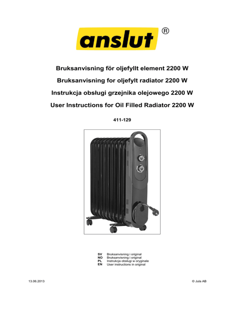 Bruksanvisning för oljefyllt element 2200 W Bruksanvisning for