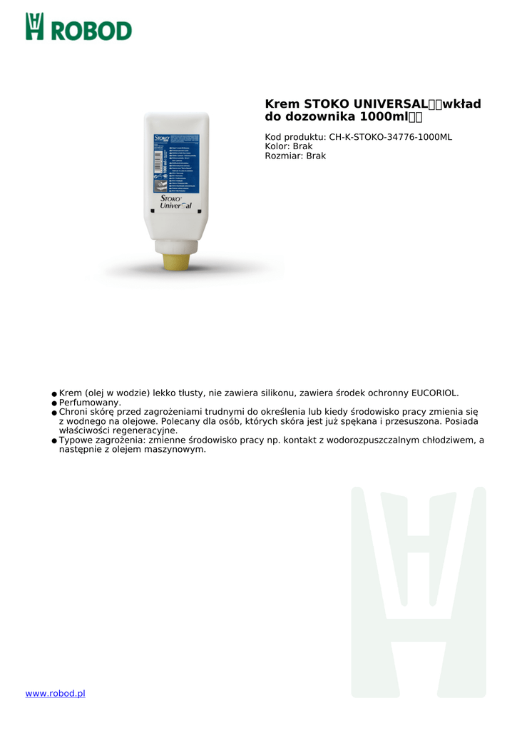 Krem STOKO UNIVERSALwkład do dozownika 1000ml Kod produktu: CH-K-STOKO-34776-1000ML Kolor: Brak Rozmiar: Brak Krem (olej w wodzie) lekko tłusty, nie zawiera silikonu, zawiera środek ochronny EUCORIOL. Perfumowany. Chroni skórę przed zagrożeniami trudnymi do określenia lub kiedy środowisko pracy zmienia się z wodnego na olejowe. Polecany dla osób, których skóra jest już spękana i przesuszona. Posiada właściwości regeneracyjne. ● Typowe zagrożenia: zmienne środowisko pracy np. kontakt z wodorozpuszczalnym chłodziwem, a następnie z olejem maszynowym. ● ● ● www.robod.pl