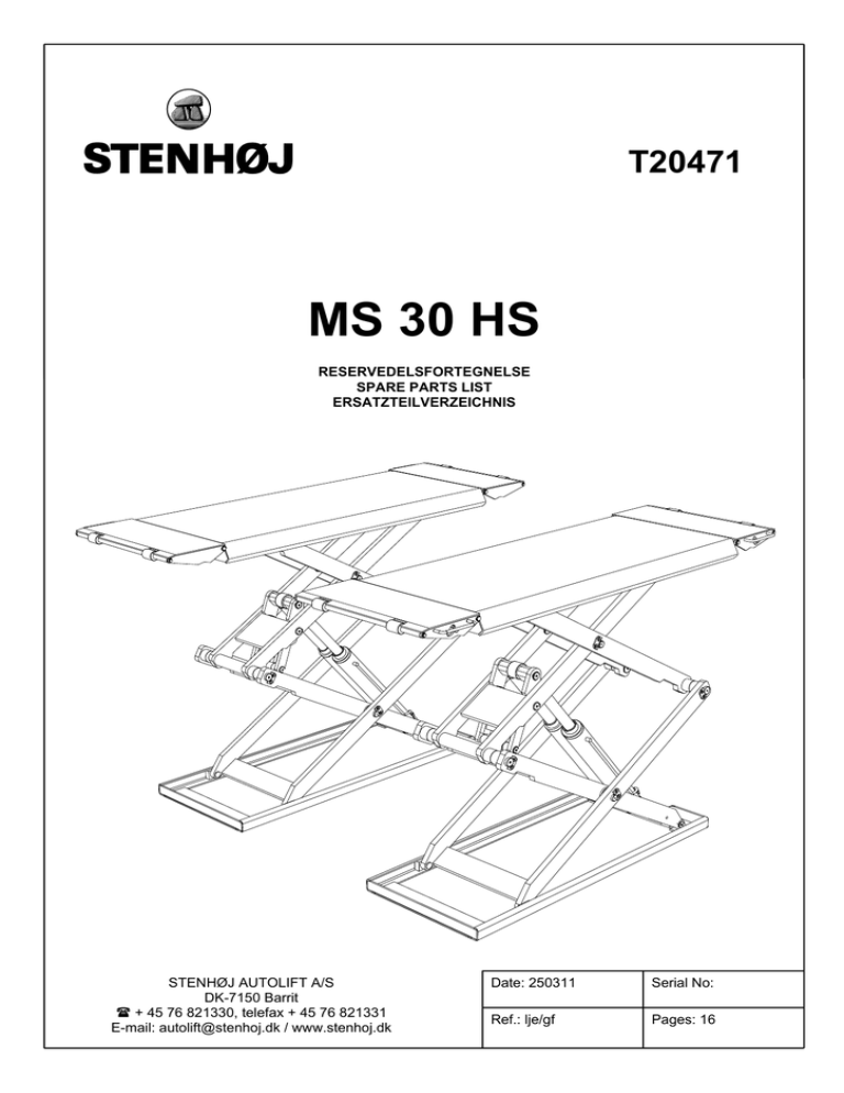 T20471 MS 30 HS RESERVEDELSFORTEGNELSE SPARE PARTS LIST ERSATZTEILVERZEICHNIS STENHØJ AUTOLIFT A/S DK-7150 Barrit + 45 76 821330, telefax + 45 76 821331 E-mail: [email protected] / www.stenhoj.dk Date: 250311 Serial No: Ref.: lje/gf Pages: 16 1 Indholdsfortegnelse / table of contents / Einhaltsverzeichnis T20471 Page 5 Page 3 Page 7 Page 15 Page 9 T20471 Indholdsfortegnelse / table of contents / Einhaltsverzeichnis Indholdsfortegnelse / table of contents / Einhaltsverzeichnis ................................... 1-2 Saksesektioner / scissor members / Scherensektionen ........................................... 3-4 Opkørselsramper / drive-on ramps / Auffahrrampen................................................ 5-6 Cylindre / cylinders / Zylinder ................................................................................... 7-8 Multistander / upright / Steuerschrank ................................................................... 9-10 Styring / control unit / Steuerung.......................................................................... 11-12 Pumpeanlæg / pump unit / Pumpenanlage .......................................................... 13-14 Kabelafdækninger / Cable covers / Kabelabdeckungen ...................................... 15-16 Revision: 2 3 T20471 Saksesektioner / scissor members / Scherensektionen 6 30 7 31 34 18 29 5 25 28 23 27 22 18 21 26 20 20 16 4 17 14 15 17 3 15 14 16 19 14 15 14 Page 7 15 18 13 2 10 9 12 8 11 25 24 25 21 22 32 23 10 9 1 28 33 23 T20471 ITEM QTY. 1 2 2 3 4 5 6 7 8 9 10 11 2 1 1 2 2 2 2 4 8 2 2 2 12 13 13 14 15 16 17 18 19 20 21 22 23 24 25 26 27 28 29 30 31 32 33 34 4 1 1 16 32 8 8 12 4 8 8 8 12 4 12 2 2 4 2 2 2 2 2 4 Revision: 4 Saksesektioner / scissor members / Scherensektionen NO. BESKRIVELSE DESIGNATION BEZEICHNUNG 271462 (Højre side vist) Bundramme Saksearm (HØ) Saksearm (VE) Saksearm Saksearm Saksearm Overplade Gummikonsol Ekspansionsbolt Rørbøjle Skrue Topstop / bundstop (Right side shown) Base frame Arm (right) Arm (left) Arm Arm Arm Upper plate Rubber pad Expansion bolt Pipe holder Screw Top / bottom limit switch 271464 271465 395873 271452 395872 395863 271450 395864 271451 365861 271449 211725 395862 211730 395866 395871 395869 694119 395874 395868 395867 395865 211732 Skrue Fotocelle HØ Fotocelle VE Låsebeslag Undersænket skrue Glideklods Aksel Bøsning Aksel Bøsning Aksel Bøsning Sikringsring Aksel Sikringsring Aksel Rulle Rulle Opstartsmekanisme Rulle Aksel Aksel Aksel Sikringsring Screw Photocell (right side) Photocell (left side) Bracket Screw Slide block Axle Bearing bush Axle Bearing bush Axle Bearing bush Retaining ring Axle Retaining ring Axle Roller Roller Lever Roller Axle Axle Axle Retaining ring (Rechte Seite ist gezeigt) Bodenrahmen Arm (recht) Arm (links) Arm Arm Arm Oberer Platte Gummiaufnahme Schwerlastanker Rohrhalter Schraube Oberer / unterer Endschalter Schraube Fotozelle (rechte Seite) Fotozelle (linke Seite) Beschlag Schaube Gleitklotz Achse Lagerbuchse Achse Lagerbuchse Achse Lagerbuchse Sicherungsring Achse Sicherungsring Achse Rolle Rolle Anlaufmechanismus Rolle Achse Achse Achse Sicherungsring 694114 694115 694126 694116 694117 694118 694122 271461 259817 SPECIFIC. U25 U30 U32 5 T20471 Opkørselsramper / drive-on ramps / Auffahrrampen 7 9 2 6 8 6 7 11 5 6 5 1 6 3 10 7 6 9 10 6 8 7 10 6 10 6 11 4 6 6 T20471 Opkørselsramper / drive-on ramps / Auffahrrampen ITEM QTY. 1 2 3 4 5 6 7 8 9 10 11 2 2 2 2 4 24 8 8 4 8 4 Revision: 6 NO. BESKRIVELSE DESIGNATION BEZEICHNUNG 694121 694125 694124 694123 395875 211715 211709 395878 395877 395876 213381 Opkørselsrampe Opkørselsrampe Lås Lås Aksel Sikringsring Sikringsring Rulle Aksel Aksel Dupsko Drive-on ramp Drive-on ramp Lock Lock Axle Retaining ring Retaining ring Roller Axle Axle Ferrule Auffahrrampe Auffahrrampe Schloß Schloß Achse Sicherungsring Sicherungsring Rolle Achse Achse Zwinge SPECIFIC. U16 U12 7 T20471 Cylindre / cylinders / Zylinder 3 4 1 1 2 2 5 6 13 5 7 7 6 13 7 9 7 8 10 8 11 12 Cylindre / cylinders / Zylinder T20471 8 ITEM QTY. NO. BESKRIVELSE DESIGNATION BEZEICHNUNG 1 2 3 4 5 6 7 8 9 10 11 12 13 2 2 2 2 2 2 4 12m 1 1 1 1 4 794311 794312 271406 271445 219105 219205 271459 213158 271466 271467 271468 271469 271411 Mastercylinder Slavecylinder Pakdåse for mastercyl. Pakdåse for slavecyl. Skærering Omløber Fitting Nylonslange Hydraulikslange (rød) Hydraulikslange (gul) Hydraulikslange (blå) Hydraulikslange (rød) Sænkebremseventil Master cylinder Slave cylinder Stuffing box – mastercyl. Stuffing box – slavecyl. Cutting ring Union nut Fitting Nylon hose Hydraulic hose (red) Hydraulic hose (yellow) Hydraulic hose (blue) Hydraulic hose (red) Flow restricting valve Masterzylinder Slavezylinder Stopfbuchse – master Stopfbuchse - slave Schneidring Überwurfmutter Fitting Nylonschlauch Hydraulikschlauch (rot) Hydraulikschlauch (gelb) Hydraulikschlauch (blau) Hydraulikschlauch (rot) Senkbremsventil 1 792435 Pakningssæt kpl. for mastercylinder Seal kit cpl. for master cylinder Dichtungssatz kpl. für masterzylinder 1 792436 Pakningssæt for slavecylinder Seal kit cpl. for slave cylinder Dichtungssatz kpl. für Slavezylinder Revision: SPECIFIC. 6100mm 1800mm 1850mm 4800mm 9 Multistander / upright / Steuerschrank T20471 Page 11 6 4 1 Page 11 6 7 3 4 6 Page 13 5 6 9 5 6 8 5 6 10 11 2 Multistander / upright / Steuerschrank T20471 ITEM QTY. 1 2 3 4 5 6 7 8 9 10 11 1 1 1 4 6 10 1 8 4 4 4 Revision: 10 NO. BESKRIVELSE DESIGNATION BEZEICHNUNG SPECIFIC. 694113 694112 395888 214715 214700 253575 395886 259817 252088 214708 240311 Bagplade Bundplade Frontplade Skive Skive Cylinderskrue Afdækningsplade Ekspansionsbolt Sætskrue Skive Møtrik Rear plate Bottom plate Front plate Washer Washer Cylinder screw Cover plate Expansion bolt Screw Washer Nut Hinterwand Bodenplatte Vordere Abdeckung Scheibe Scheibe Zylinderschraube Abdeckung Schwerlastanker Schraube Scheibe Mutter M5x10 M8x25 M8 11 T20471 Styring / control unit / Steuerung 4A 2A 5A 1 2B