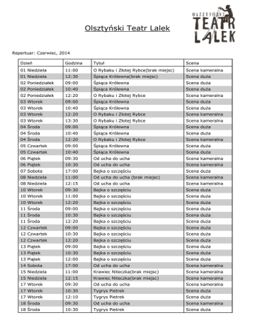 Olsztyński Teatr Lalek Repertuar: Czerwiec, 2014 Dzień Godzina Tytuł Scena 01 Niedziela 11:00 O Rybaku i Złotej Rybce(brak miejsc) Scena kameralna 01 Niedziela 12:30 Śpiąca Królewna(brak miejsc) Scena duża 02 Poniedziałek 09:00 Śpiąca Królewna Scena duża 02 Poniedziałek 10:40 Śpiąca Królewna Scena duża 02 Poniedziałek 12:20 O Rybaku i Złotej Rybce Scena kameralna 03 Wtorek 09:00 Śpiąca Królewna Scena duża 03 Wtorek 10:40 Śpiąca Królewna Scena duża 03 Wtorek 12:20 O Rybaku i Złotej Rybce Scena kameralna 03 Wtorek 13:30 O Rybaku i Złotej Rybce Scena kameralna 04 Środa 09:00 Śpiąca Królewna Scena duża 04 Środa 10:40 Śpiąca Królewna Scena duża 04 Środa 12:20 O Rybaku i Złotej Rybce Scena kameralna 05 Czwartek 09:00 Śpiąca Królewna Scena duża 05 Czwartek 10:40 Śpiąca Królewna Scena duża 06 Piątek 09:30 Od ucha do ucha Scena kameralna 06 Piątek 10:30 Od ucha do ucha Scena kameralna 07 Sobota 17:00 Bajka o szczęściu Scena duża 08 Niedziela 11:00 Od ucha do ucha (brak miejsc) Scena kameralna 08 Niedziela 12:15 Od ucha do ucha Scena kameralna 10 Wtorek 09:30 Bajka o szczęściu Scena duża 10 Wtorek 11:00 Bajka o szczęściu Scena duża 10 Wtorek 12:20 Bajka o szczęściu Scena duża 11 Środa 09:00 Bajka o szczęściu Scena duża 11 Środa 10:30 Bajka o szczęściu Scena duża 11 Środa 12:20 Bajka o szczęściu Scena duża 12 Czwartek 09:00 Bajka o szczęściu Scena duża 12 Czwartek 10:30 Bajka o szczęściu Scena duża 12 Czwartek 12:20 Bajka o szczęściu Scena duża 13 Piątek 09:00 Bajka o szczęściu Scena duża 13 Piątek 10:30 Bajka o szczęściu Scena duża 13 Piątek 12:00 Bajka o szczęściu Scena duża 14 Sobota 17:00 Od ucha do ucha Scena kameralna 15 Niedziela 11:00 Krawiec Niteczka(brak miejsc) Scena kameralna 15 Niedziela 12:15 Krawiec Niteczka(brak miejsc) Scena kameralna 17 Wtorek 09:30 Od ucha do ucha Scena kameralna 17 Wtorek 10:30 Tygrys Pietrek Scena duża 17 Wtorek 12:10 Tygrys Pietrek Scena duża 18 Środa 09:30 Od ucha do ucha Scena kameralna 18 Środa 10:30 Tygrys Pietrek Scena duża Dzień Godzina Tytuł Scena 18 Środa 12:10 Tygrys Pietrek Scena duża 21 Sobota 17:00 Tygrys Pietrek Scena duża 22 Niedziela 11:00 Tygrys Pietrek(brak miejsc ) Scena duża 24 Wtorek 09:30 Od ucha do ucha Scena kameralna 24 Wtorek 10:30 Tygrys Pietrek Scena duża 25 Środa 09:30 Od ucha do ucha Scena kameralna 25 Środa 10:30 Tygrys Pietrek Scena duża 28 Sobota 17:00 O Rybaku i Złotej Rybce Scena kameralna 29 Niedziela 11:00 O Rybaku i Złotej Rybce Scena kameralna Rezerwacja i sprzedaż biletów online: http://bilety.teatrlalek.olsztyn.pl/