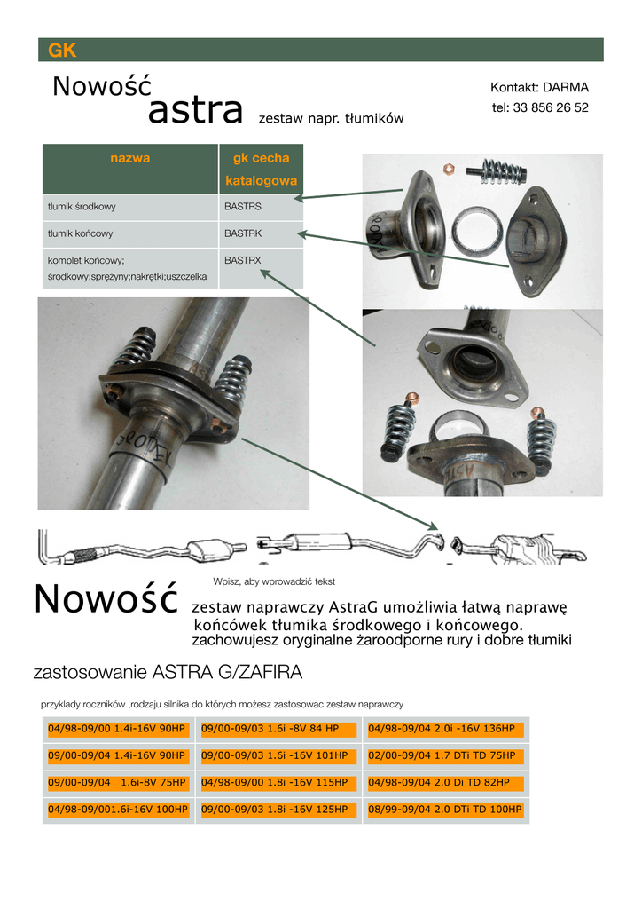 GK Nowość astra nazwa Kontakt: DARMA zestaw napr. tłumików tel: 33 856 26 52 gk cecha katalogowa tlumik środkowy BASTRS tlumik końcowy BASTRK komplet końcowy; BASTRX środkowy;sprężyny;nakrętki;uszczelka Nowość Wpisz, aby wprowadzić tekst zestaw naprawczy AstraG umożliwia łatwą naprawę końcówek tłumika środkowego i końcowego. zachowujesz oryginalne żaroodporne rury i dobre tłumiki zastosowanie ASTRA G/ZAFIRA przyklady roczników ,rodzaju silnika do których możesz zastosowac zestaw naprawczy 04/98-09/00 1.4i-16V 90HP 09/00-09/03 1.6i -8V 84 HP 04/98-09/04 2.0i -16V 136HP 09/00-09/04 1.4i-16V 90HP 09/00-09/03 1.6i -16V 101HP 02/00-09/04 1.7 DTi TD 75HP 09/00-09/04 1.6i-8V 75HP 04/98-09/00 1.8i -16V 115HP 04/98-09/04 2.0 Di TD 82HP 04/98-09/001.6i-16V 100HP 09/00-09/03 1.8i -16V 125HP 08/99-09/04 2.0 DTi TD 100HP