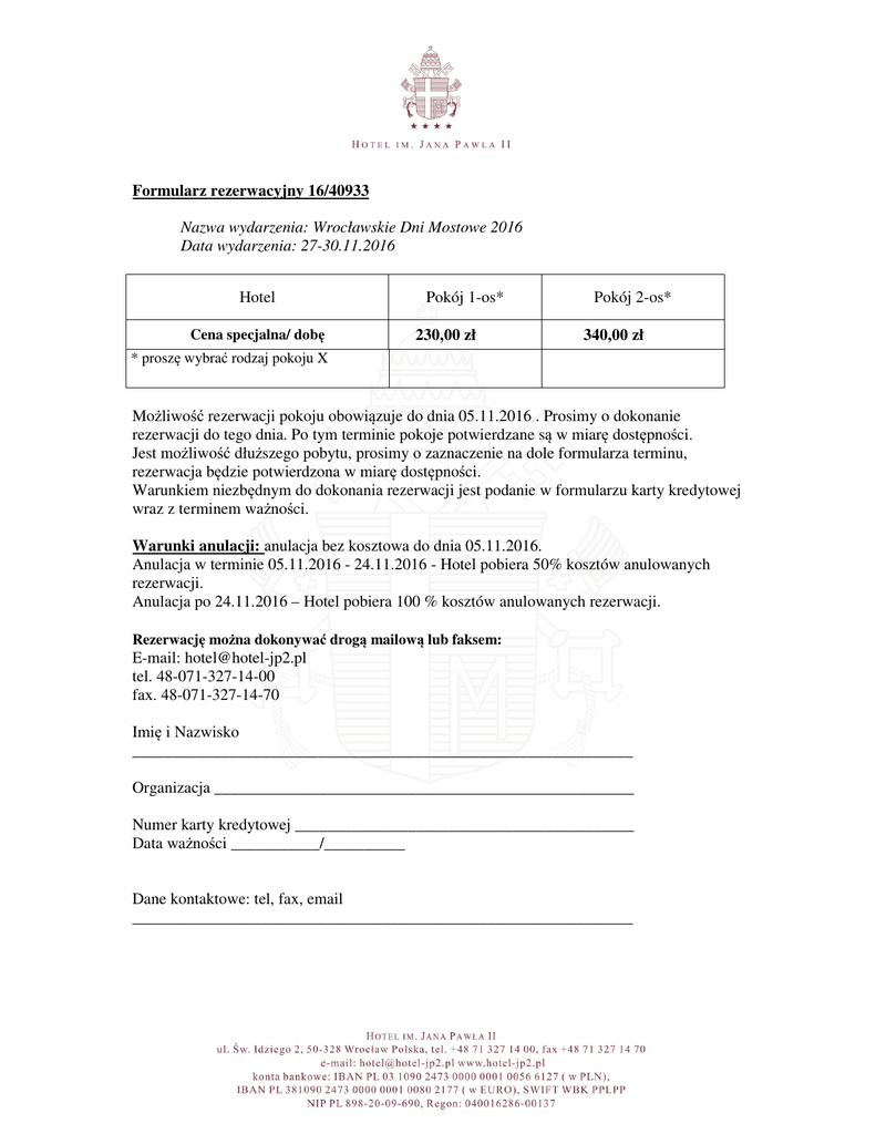 Formularz rezerwacyjny 16/40933 Nazwa wydarzenia: Wrocławskie Dni Mostowe 2016 Data wydarzenia: 27-30.11.2016 Hotel Cena specjalna/ dobę Pokój 1-os* 230,00 zł Pokój 2-os* 340,00 zł * proszę wybrać rodzaj pokoju X Możliwość rezerwacji pokoju obowiązuje do dnia 05.11.2016 . Prosimy o dokonanie rezerwacji do tego dnia. Po tym terminie pokoje potwierdzane są w miarę dostępności. Jest możliwość dłuższego pobytu, prosimy o zaznaczenie na dole formularza terminu, rezerwacja będzie potwierdzona w miarę dostępności. Warunkiem niezbędnym do dokonania rezerwacji jest podanie w formularzu karty kredytowej wraz z terminem ważności. Warunki anulacji: anulacja bez kosztowa do dnia 05.11.2016. Anulacja w terminie 05.11.2016 - 24.11.2016 - Hotel pobiera 50% kosztów anulowanych rezerwacji. Anulacja po 24.11.2016 – Hotel pobiera 100 % kosztów anulowanych rezerwacji. Rezerwację można dokonywać drogą mailową lub faksem: E-mail: [email protected] tel. 48-071-327-14-00 fax. 48-071-327-14-70 Imię i Nazwisko ______________________________________________________________ Organizacja ____________________________________________________ Numer karty kredytowej __________________________________________ Data ważności ___________/__________ Dane kontaktowe: tel, fax, email ______________________________________________________________